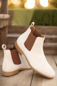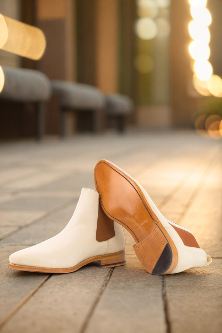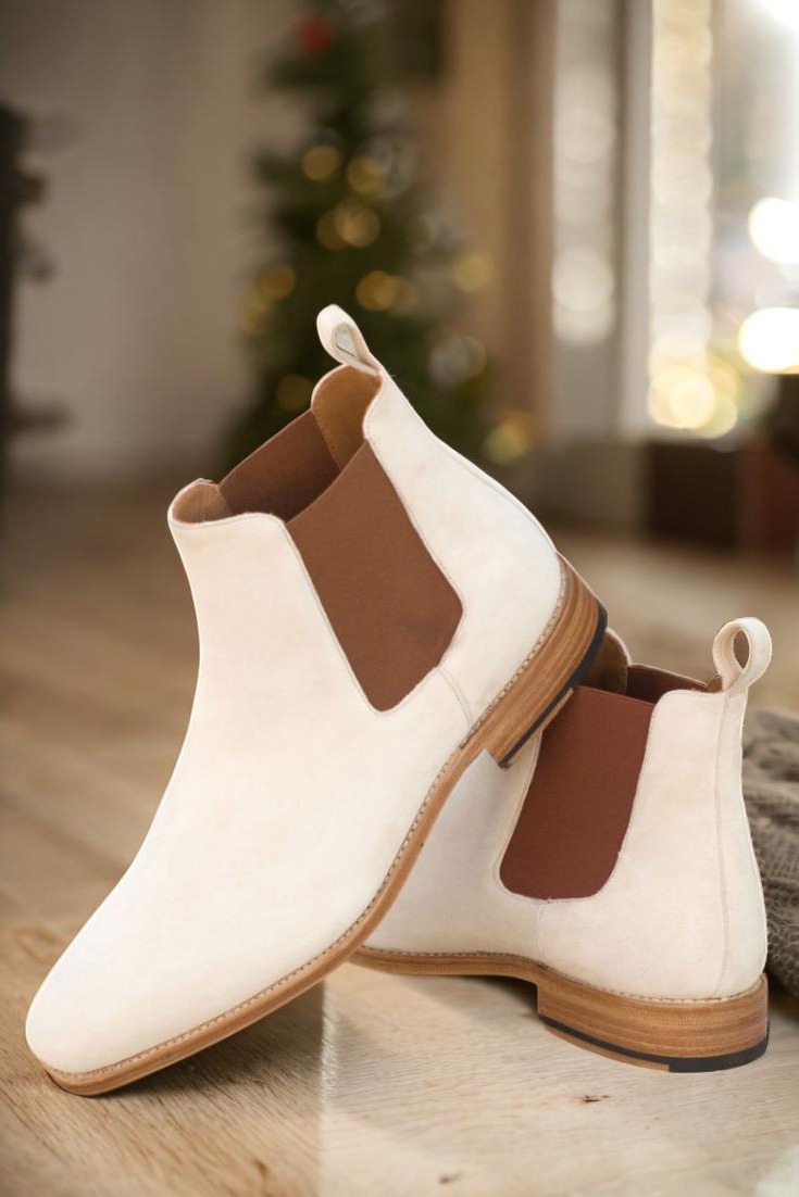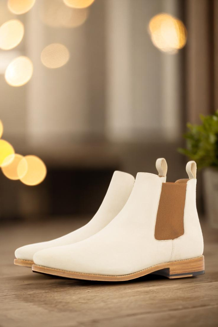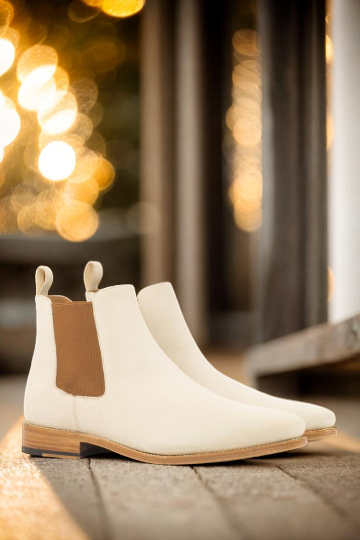 Get ready to step confidently into any room with this boot’s exquisite design. The uppers are made with soft ivory kid suede and paired with cognac elastic for a unique and eye-catching contrast. The lining is made with tan calf leather, providing both durability and comfort. And the natural leather sole ensures maximum flexibility and a comfortable fit for all-day wear.