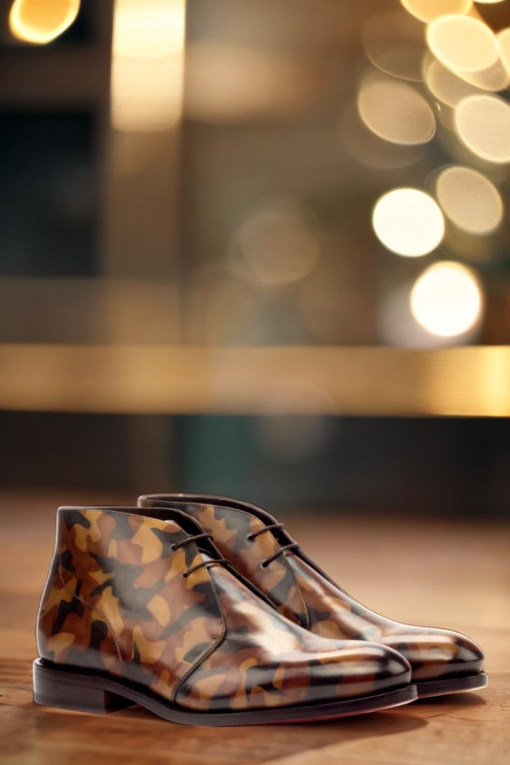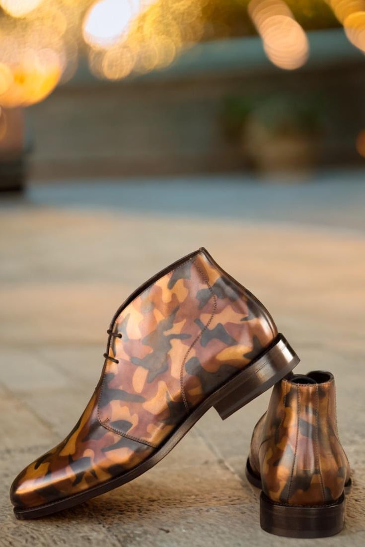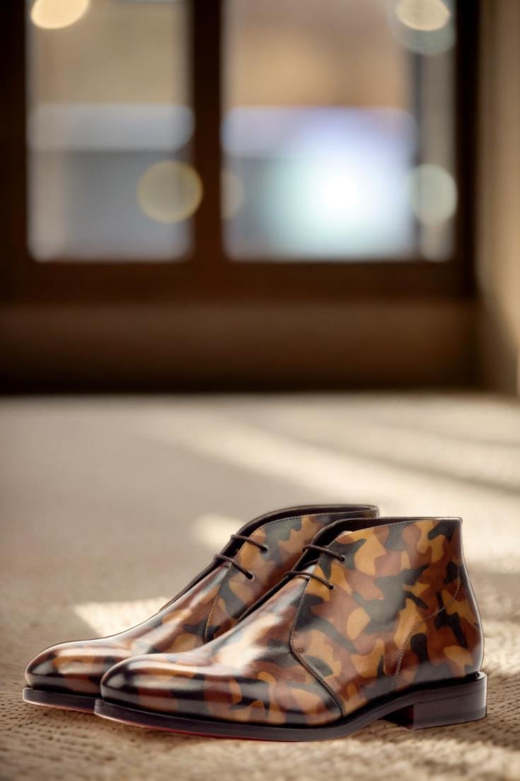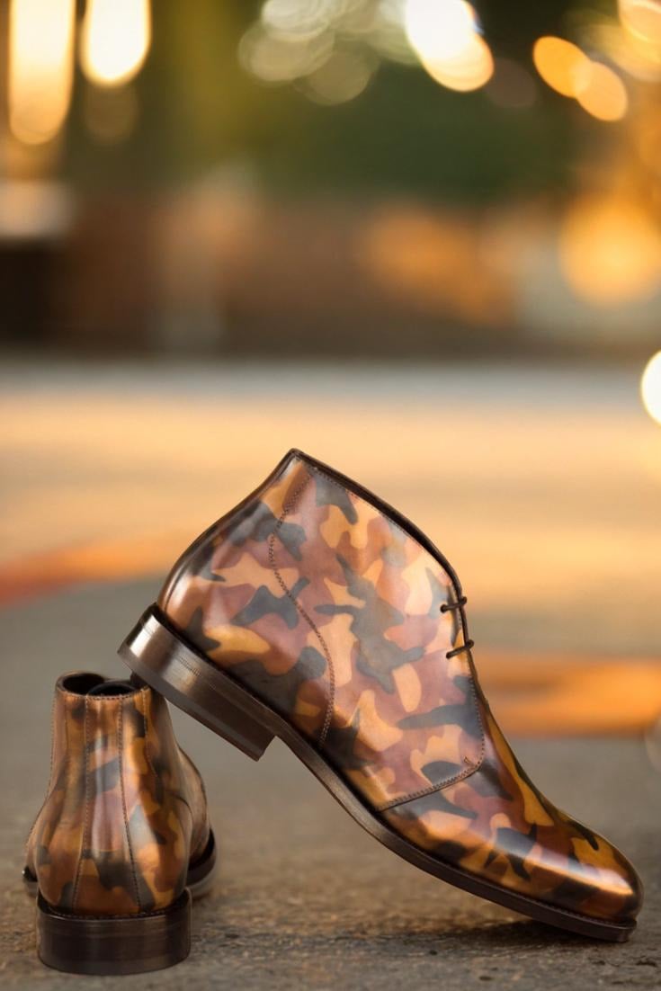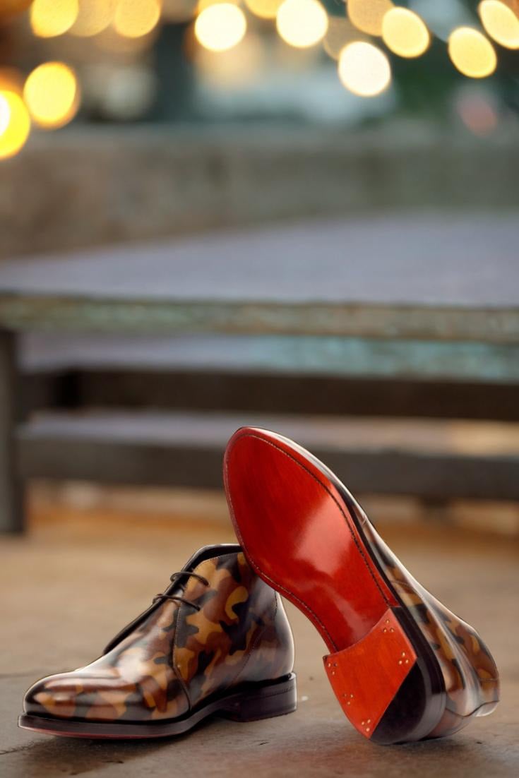 With uppers made of luxurious Italian Calf Leather, the Madison St. Chukka Boot boasts a striking Brown Camo Hand Patina Finish, giving it a unique and eye-catching appearance that will surely turn heads. Our patented patina style, inspired by the military camouflage pattern, adds an edgy twist to the classic chukka boot.