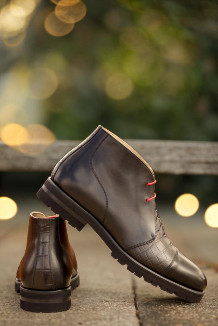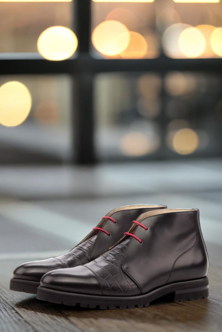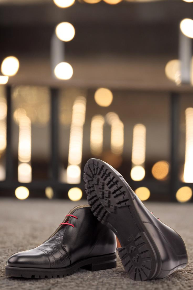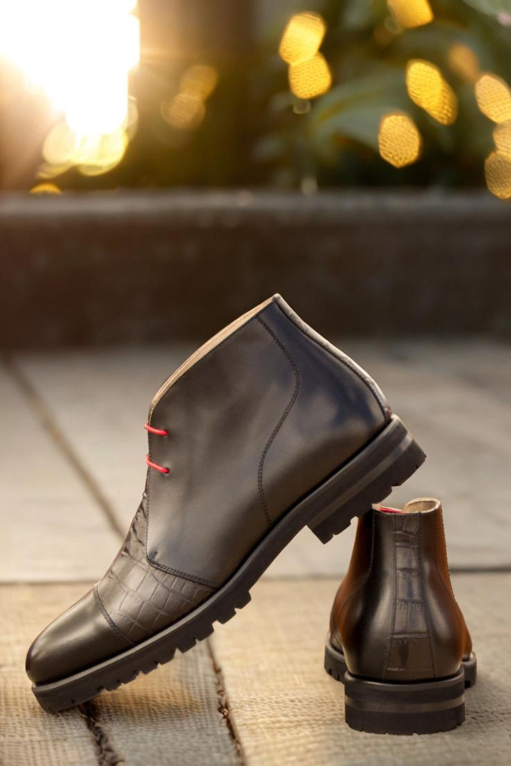 The vamp of this boot is made from black croco embossed calf leather, giving it a unique and sophisticated look. The quarter and back are also made from black box calf leather, providing a subtle yet classic touch. And for the added elegance, the cap toe is also made from black box calf leather.