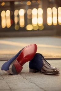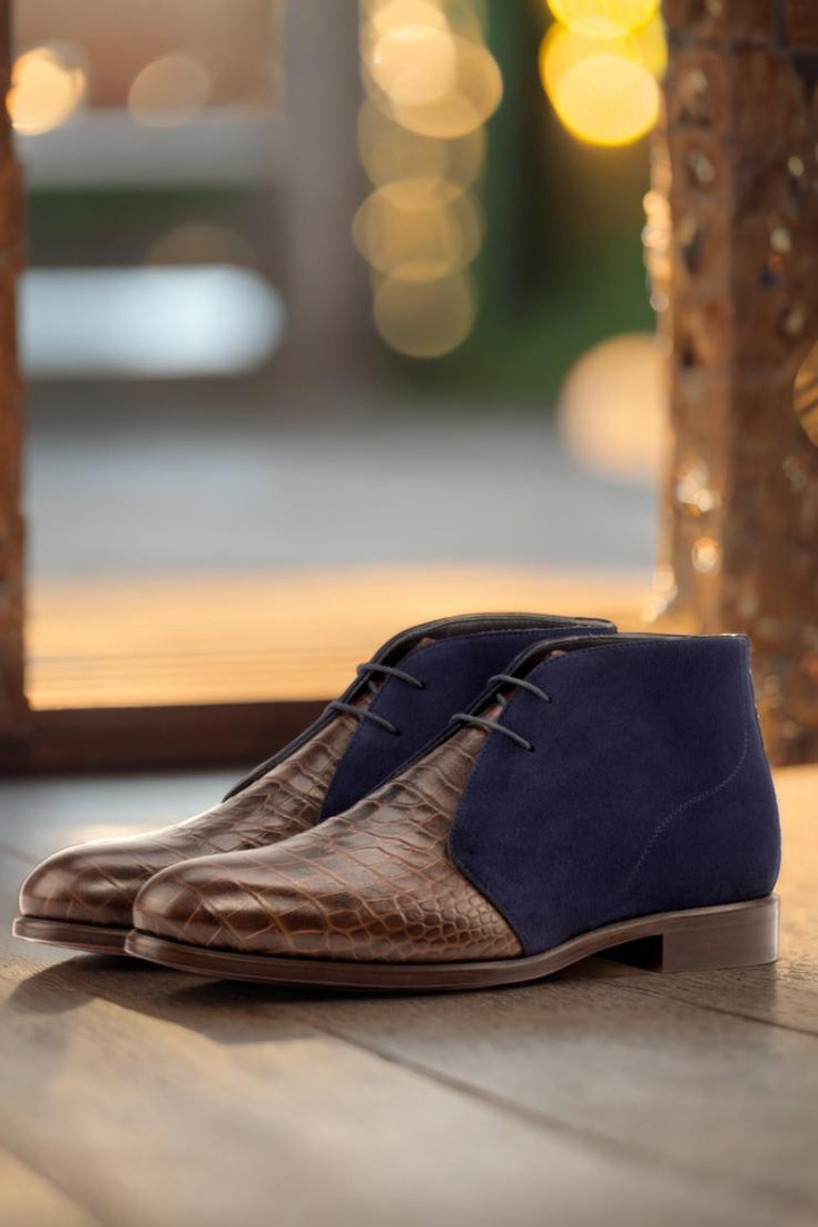 The Vamp is crafted from rich and luxurious Dark Brown Croco Embossed Calf leather, adding a touch of sophistication to your look. The Quarter in Navy Blue Kid Suede offers a bold contrast, bringing a splash of color to your outfit. But it doesn’t stop there. The Back also features the same Dark Brown Croco Embossed Calf leather, tying everything together flawlessly.