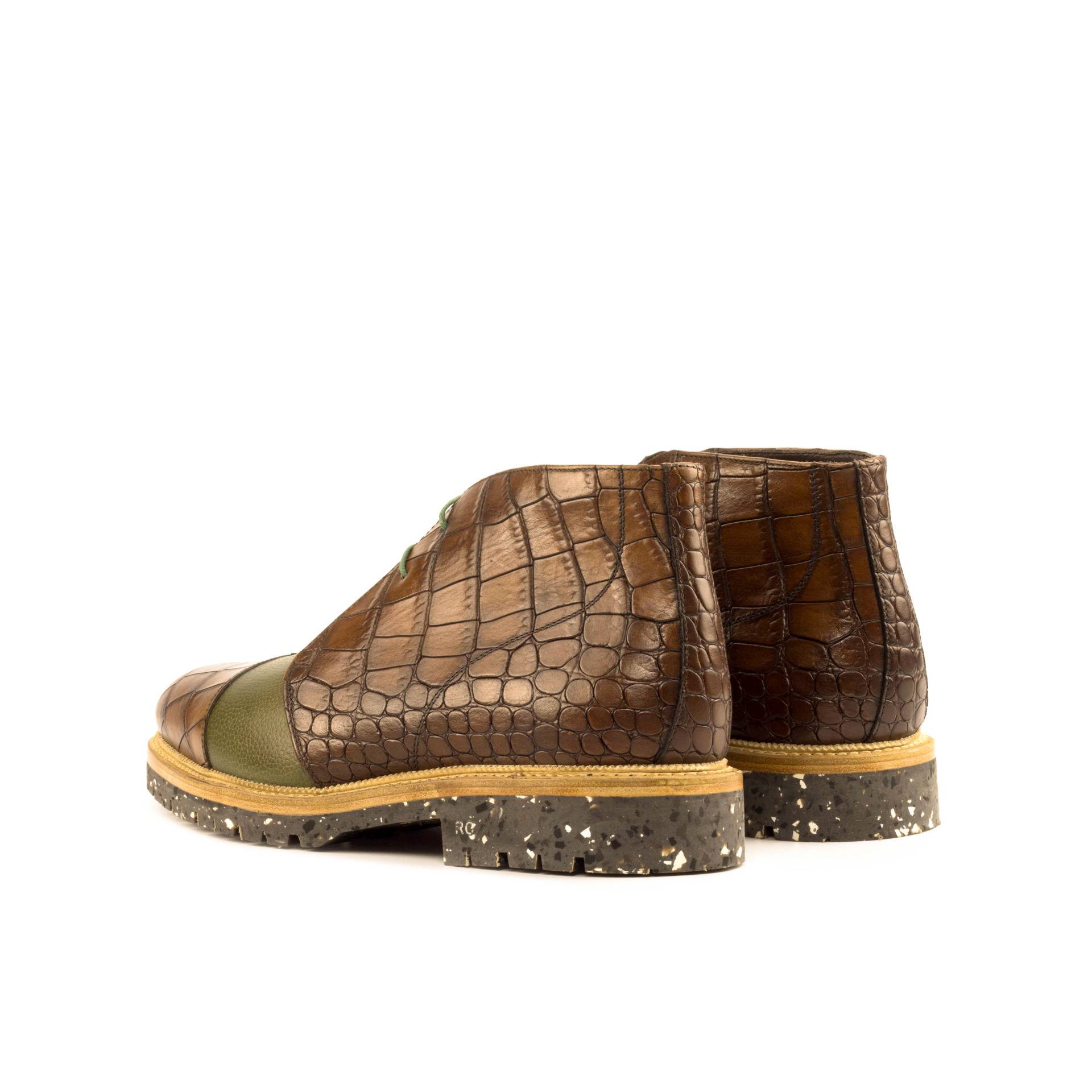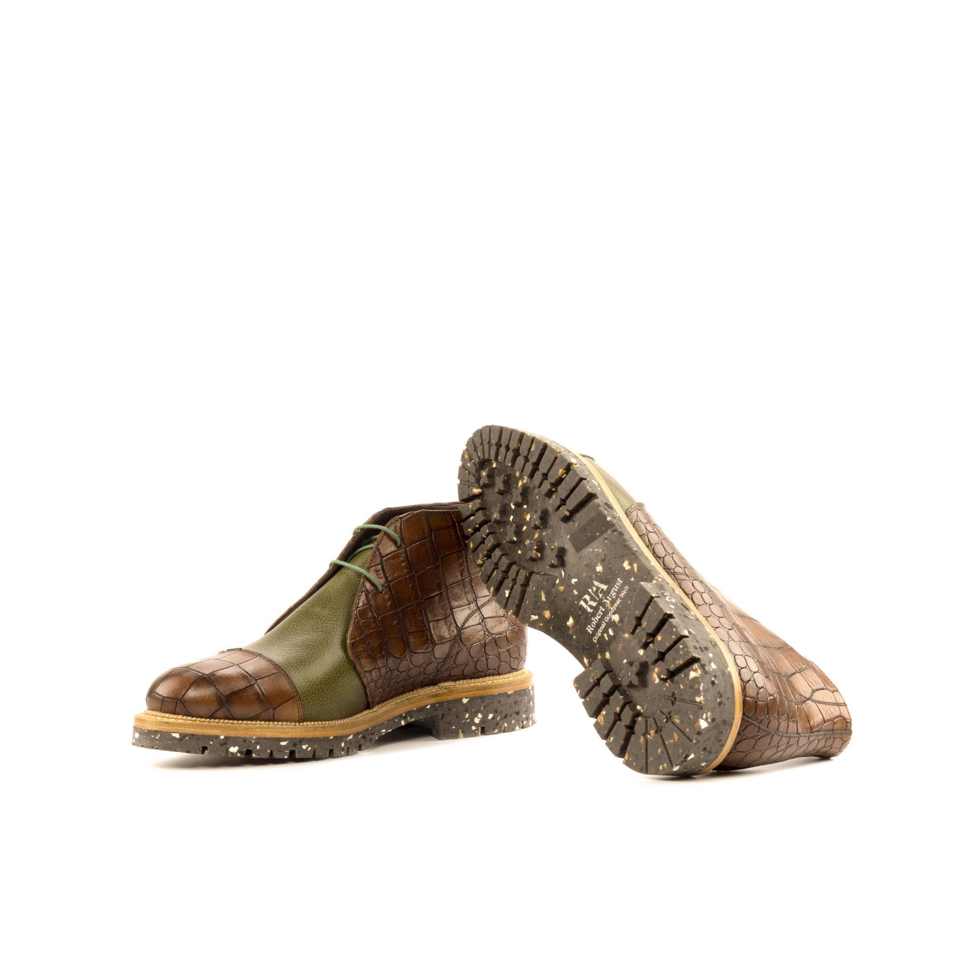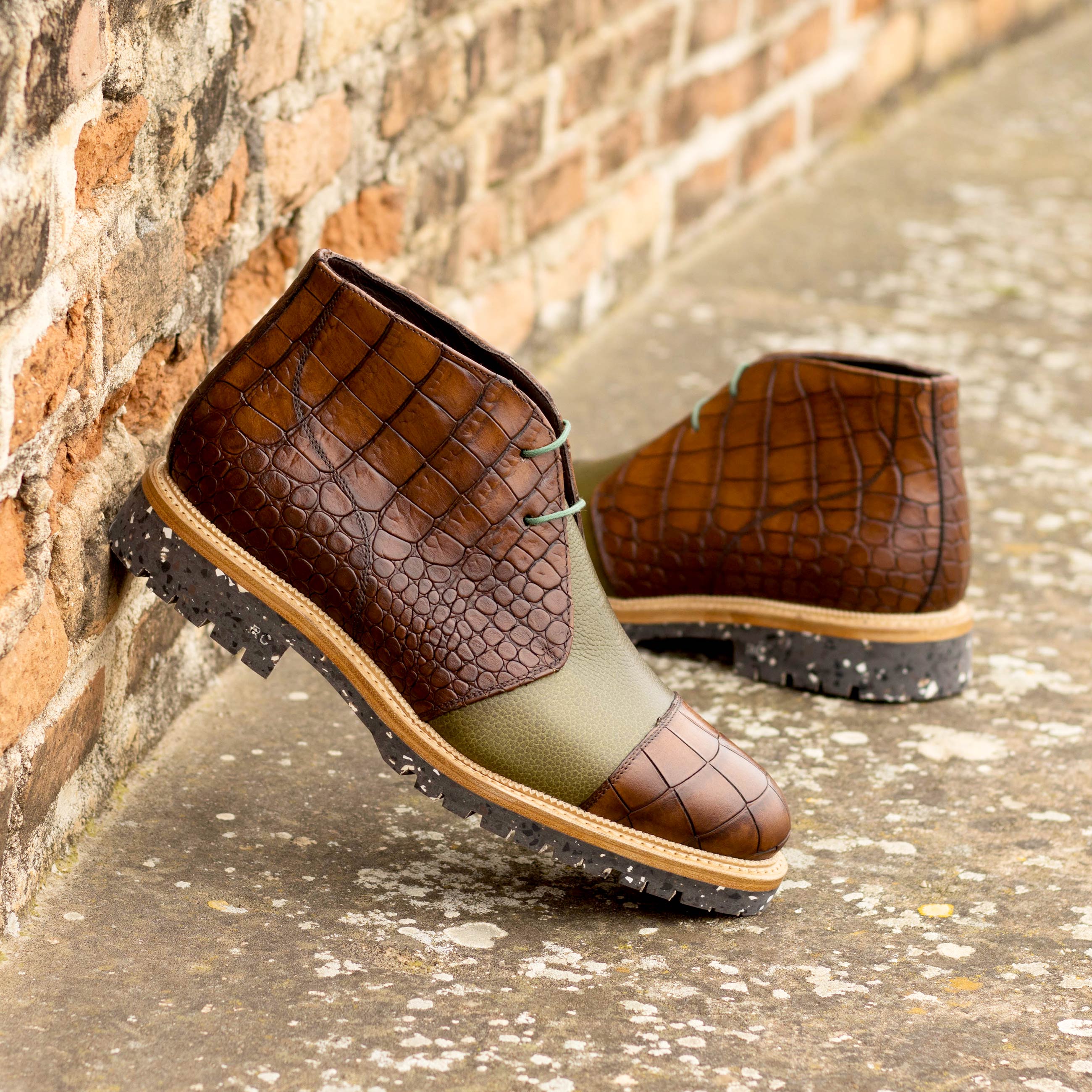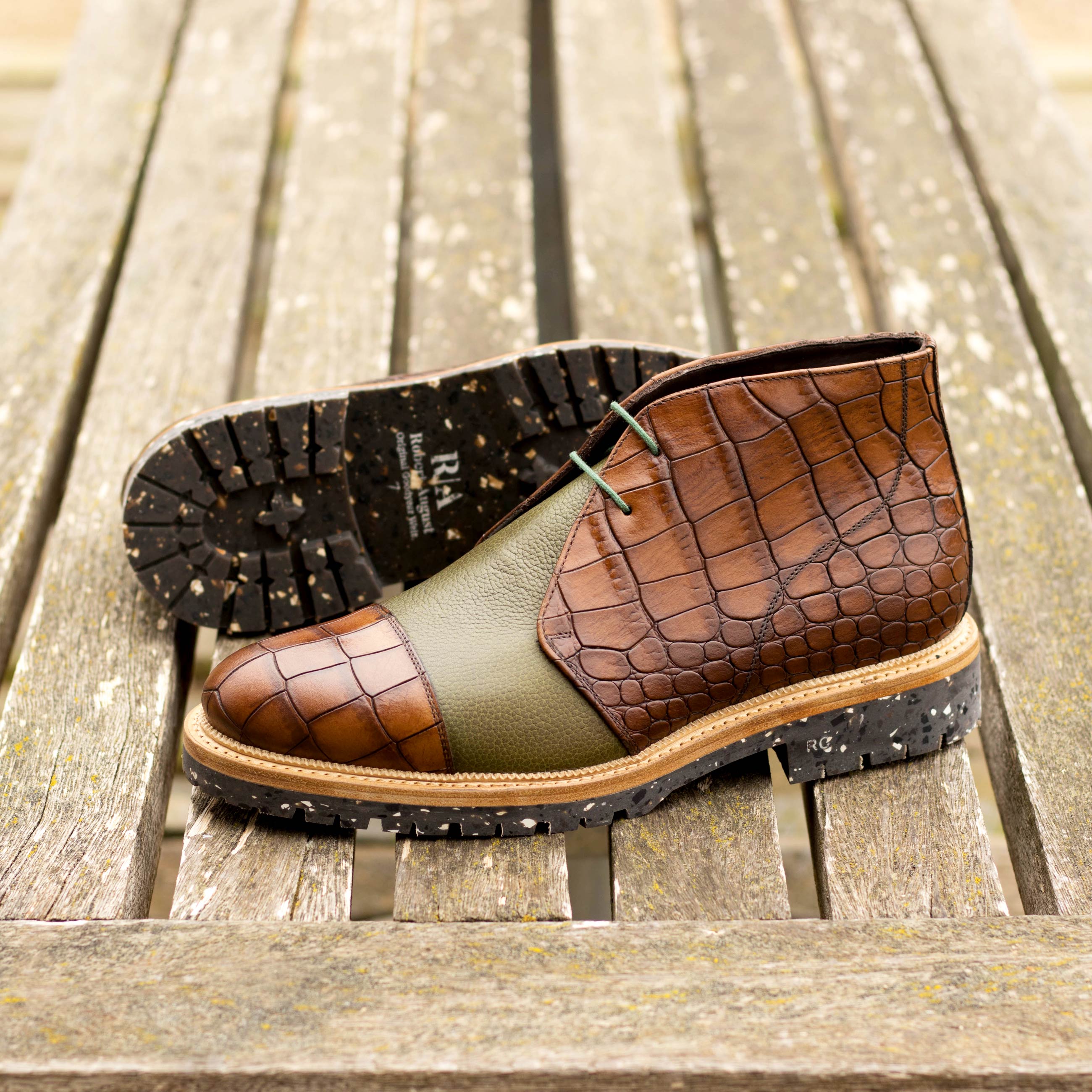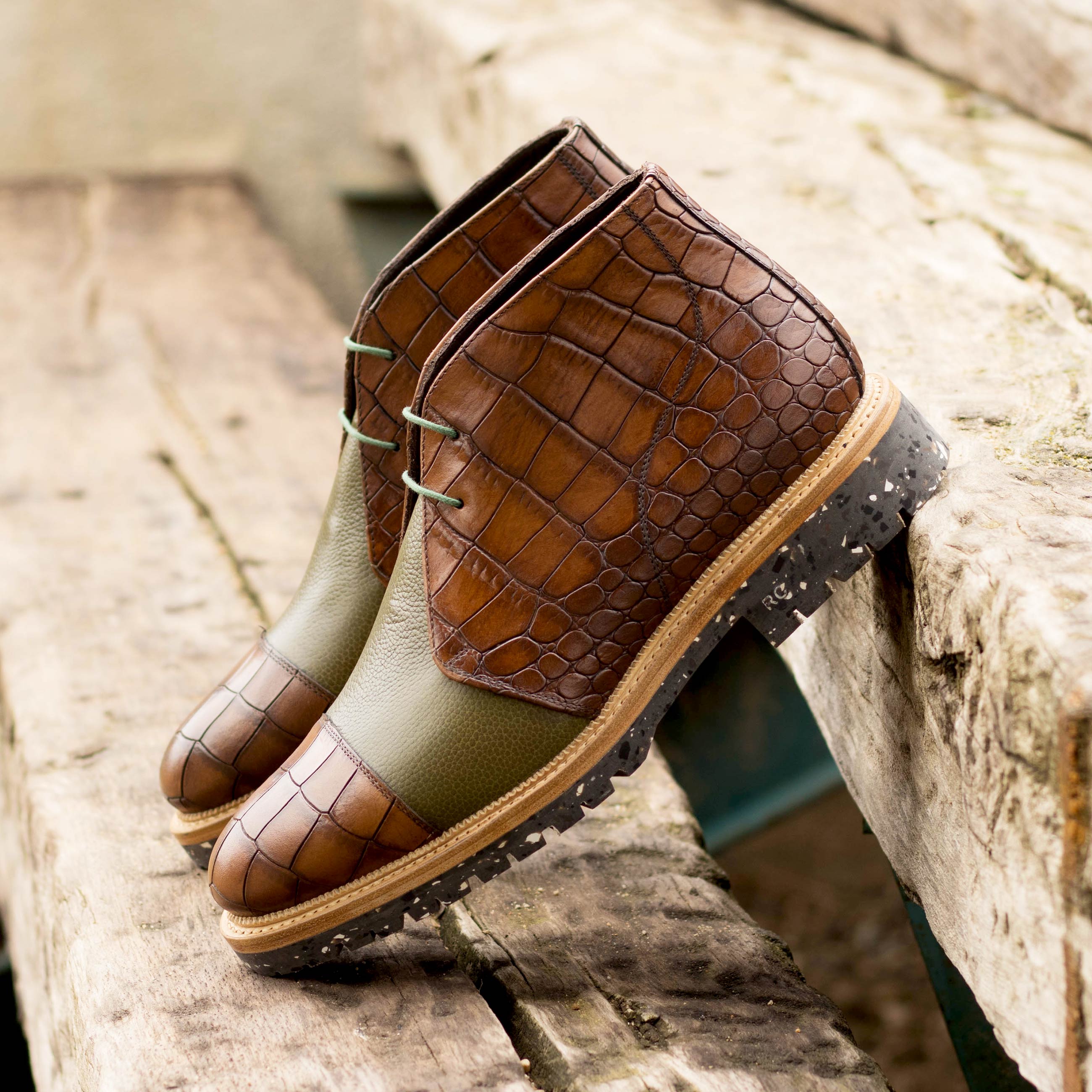 The Madison St. Chukka Boot No. 8054 from Robert August is a stylish boot that offers both sophistication and durability. The leather upper on the boot features a beautifully embossed medium brown croco leather that will add interest to any outfit. Adding contrast, the laces are a vibrant green hue, while the matching lining in brown calf leather adds extra comfort. For stability and strength, these boots feature a recycled rubber commando sole for grip and traction during wear. This handsome chukka boot is perfect for dress-casual occasions or everyday wear, always making sure you look your best with effortless style!
