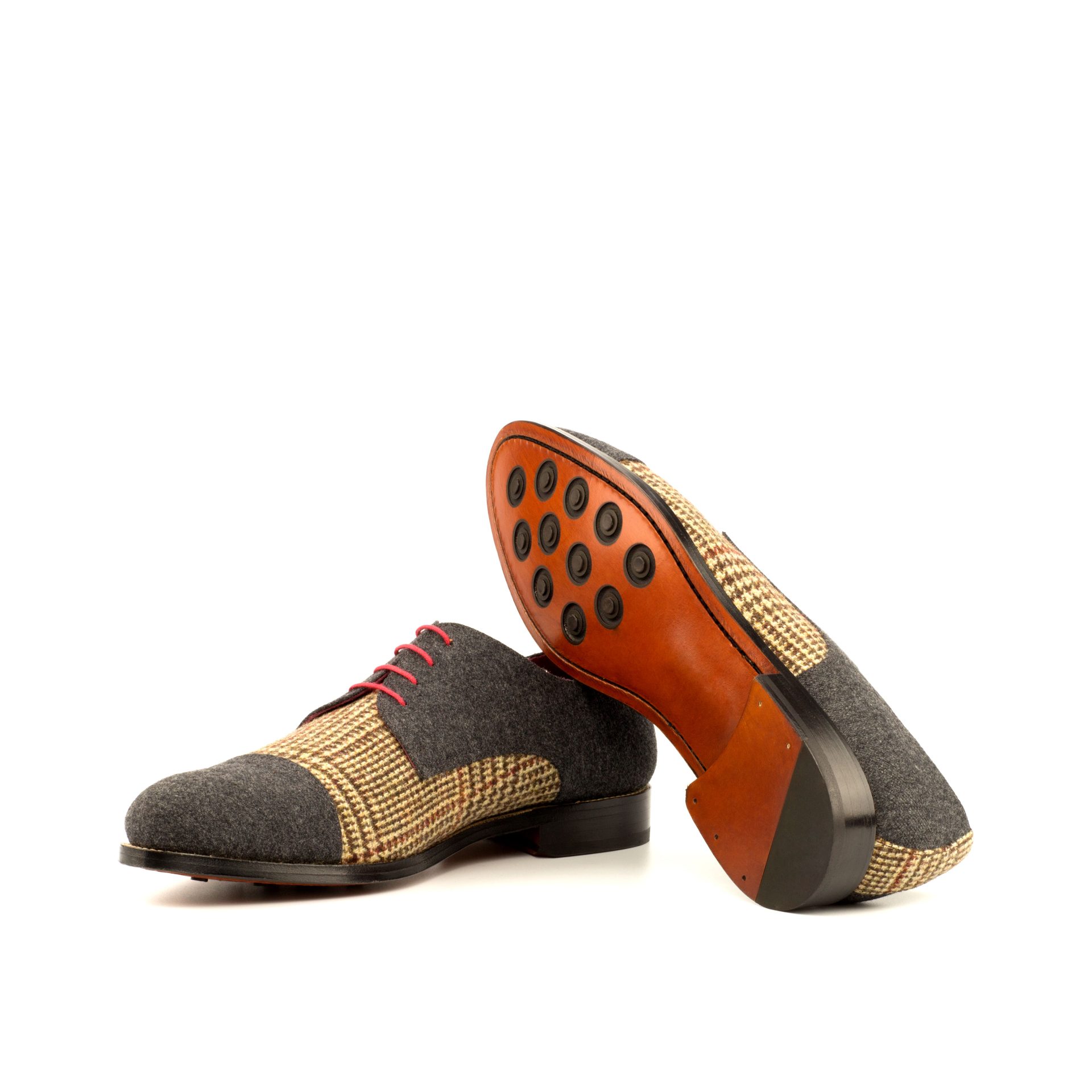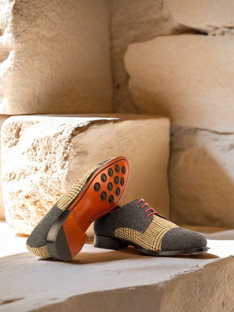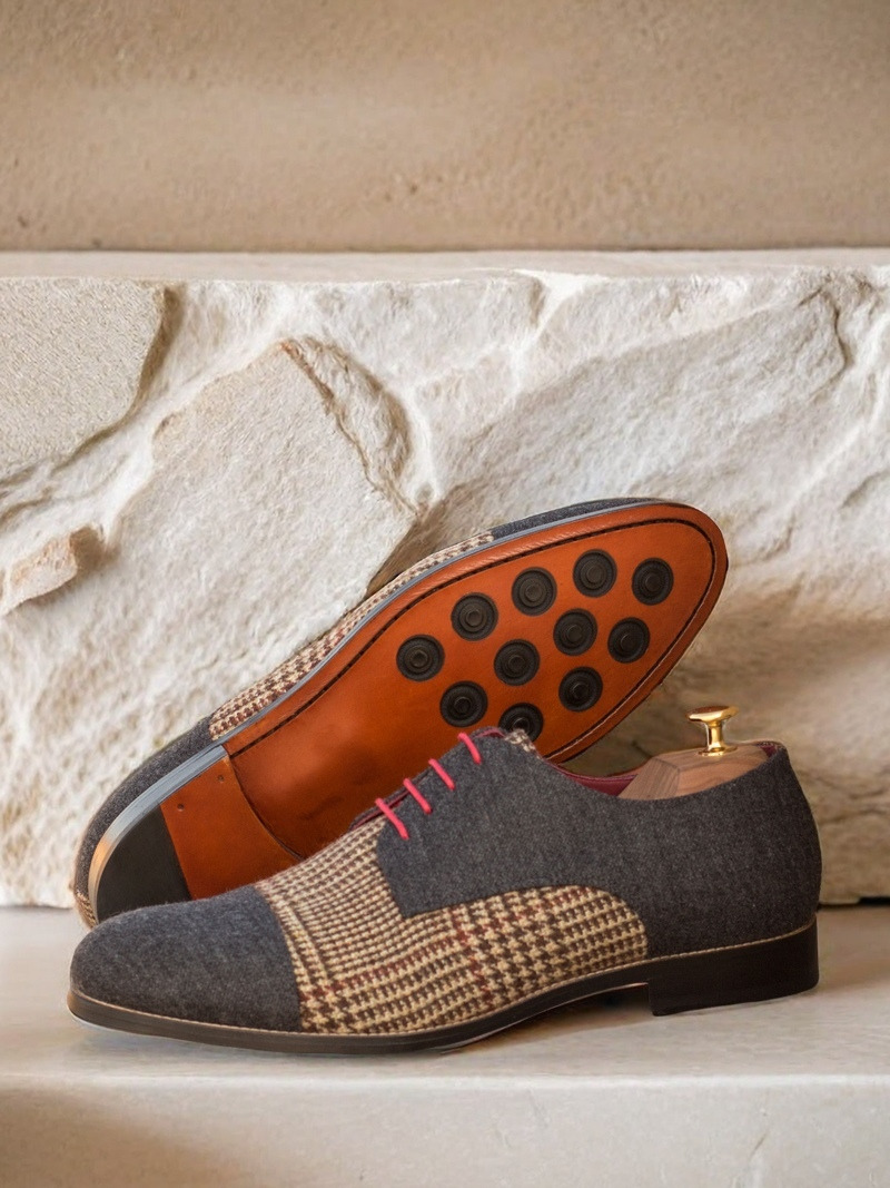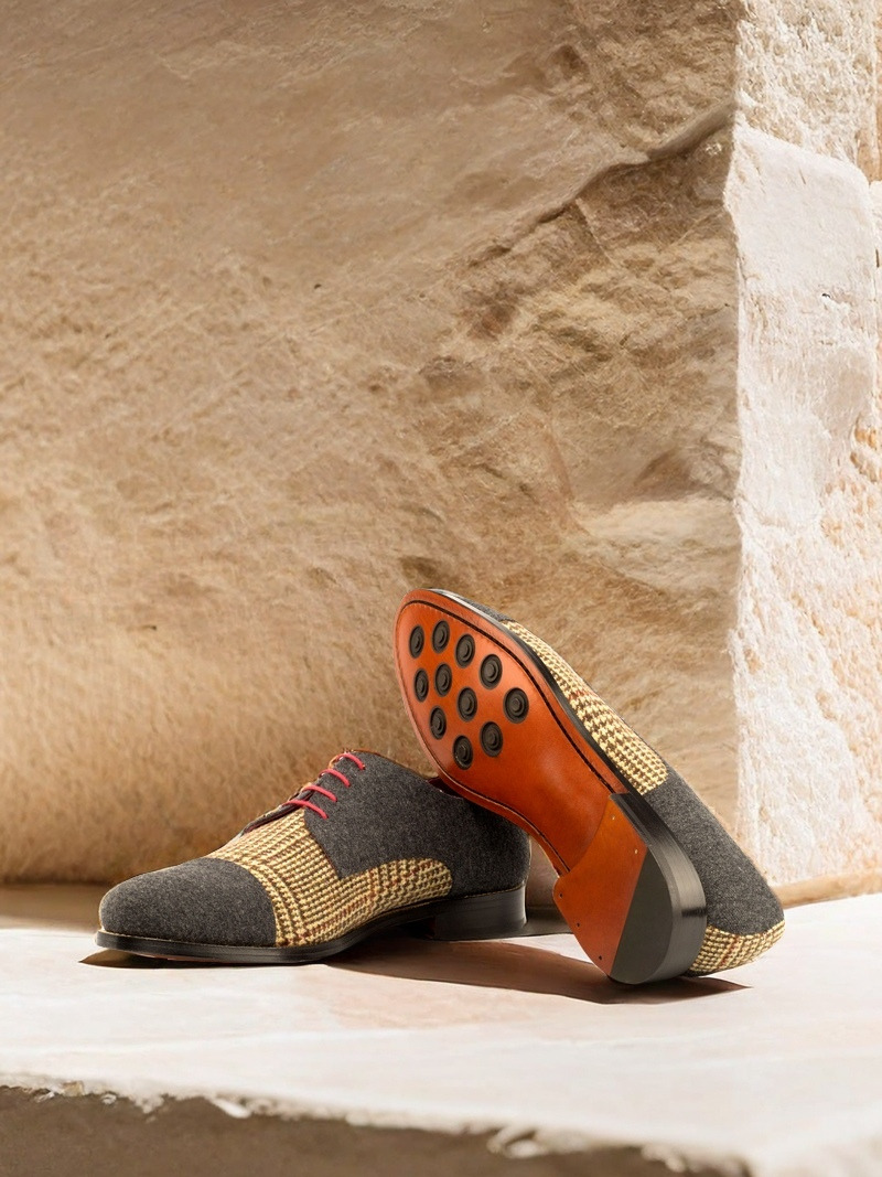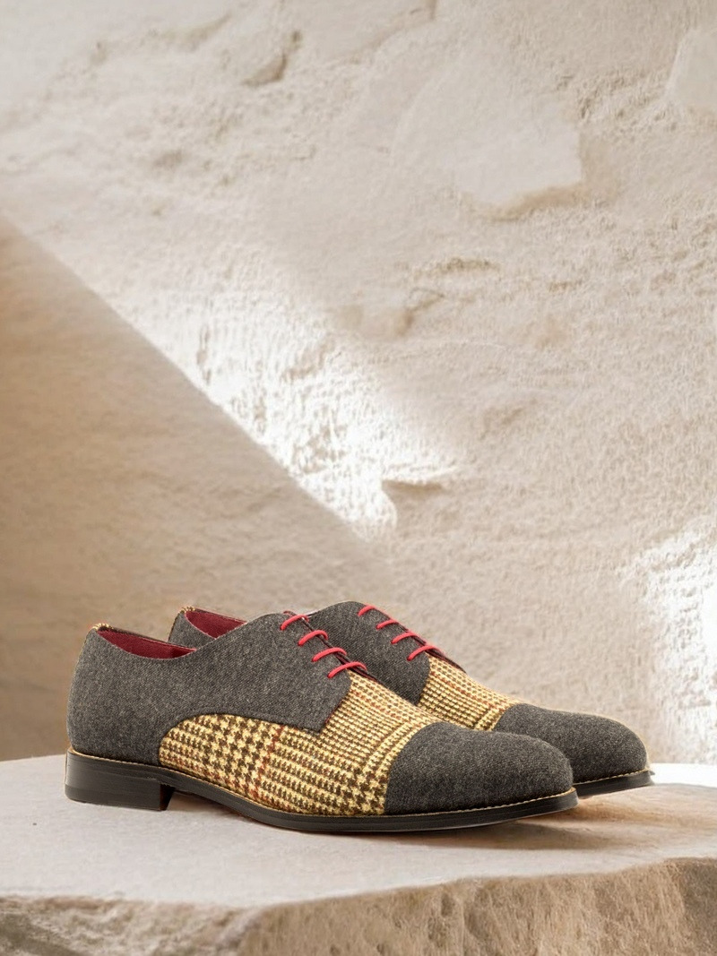 Introducing the Armitage Ave. Derby No. 3671 from Robert August, a shoe that demands attention with its bold design and impeccable craftsmanship. Handcrafted in Spain, this shoe is a true testament to quality and style. The combination of Tweed Wool and Dark Grey Flannel on the Vamp, Quarter, and Back makes for a striking contrast, while the Cap Toe in Dark Grey Flannel adds a touch of sophistication.