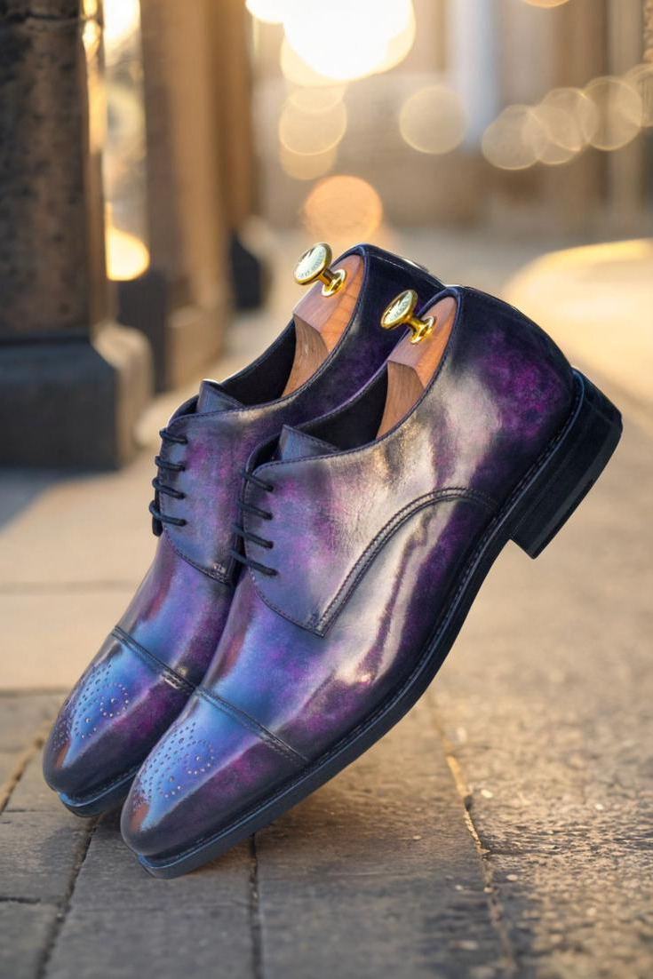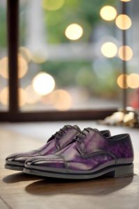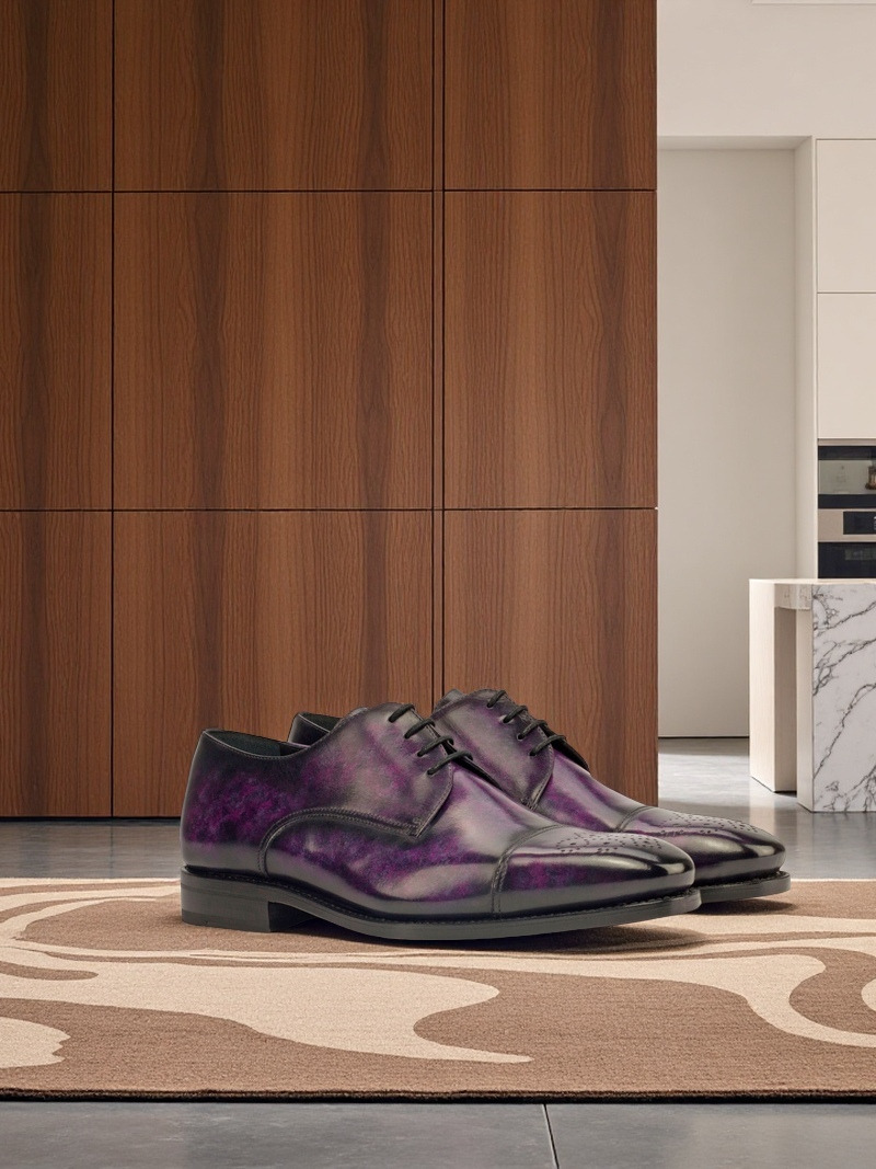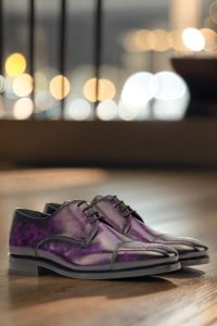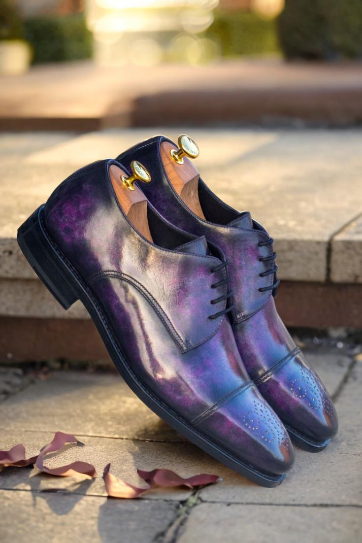 Elevate your style game with The Armitage Ave. Derby No. 3812 by Robert August. This shoe exudes elegance and sophistication with its Italian Calf Leather uppers adorned with a unique Purple Hand Patina finish in a Marble style. The handcrafted precision in every pair is evident, from the sleek black laces to the smooth Black Calf Leather lining and Black Leather sole. Made with care in Spain, these derbies were designed with the modern man in mind – someone who values quality and attention to detail. With The Armitage Ave. Derby No. 3812, you’ll turn heads and make a statement without saying a word. Step into luxury and add this exceptional shoe to your wardrobe today.