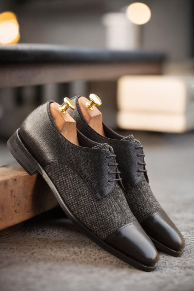 Introducing the Armitage Ave. Derby No. 3900 from Robert August. Crafted with precision and care in Spain, these derby shoes exude sleek and sophisticated style. The vamp boasts of a rich nailhead wool, giving a subtle texture to the shoe. The quarter, crafted from full grain leather, adds a touch of elegance in classic black. The black box calf back provides a smooth and luxurious look, perfect for any formal occasion.