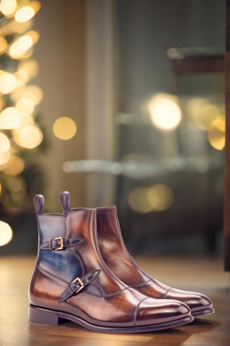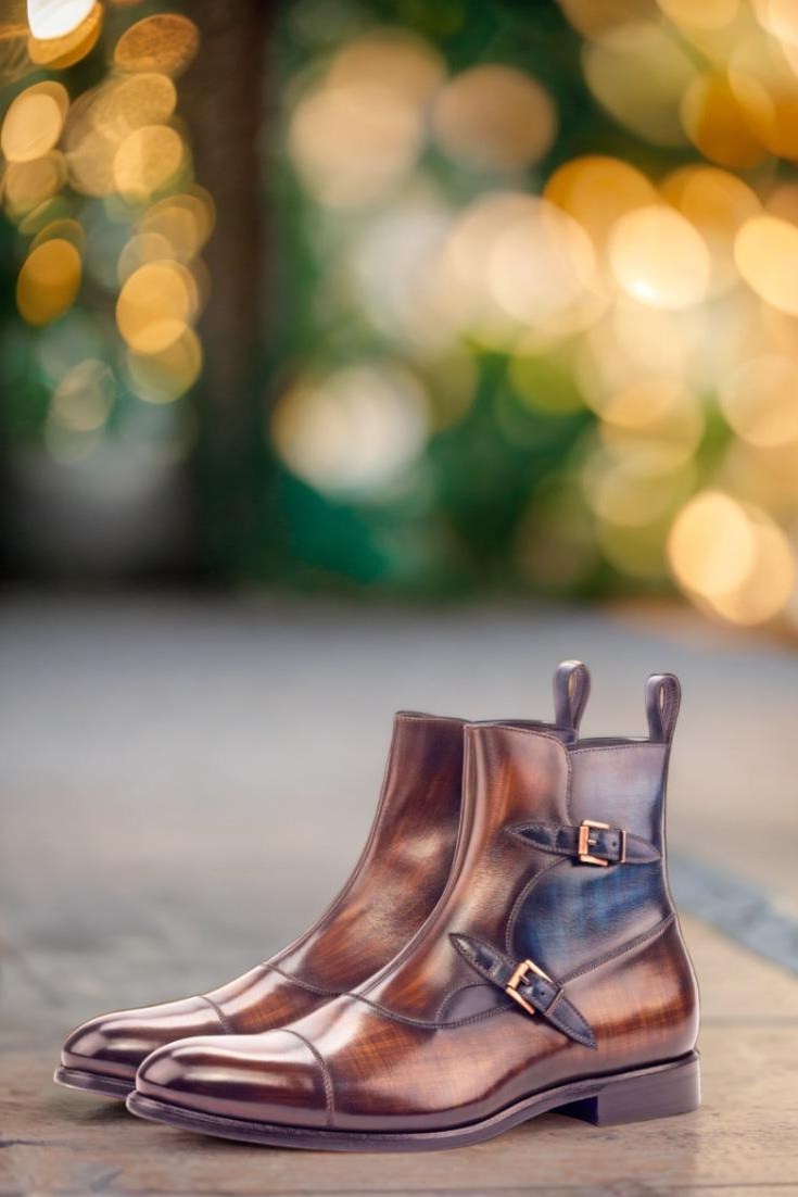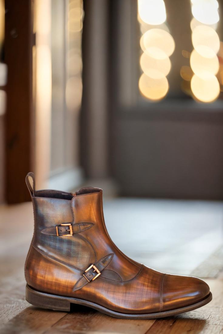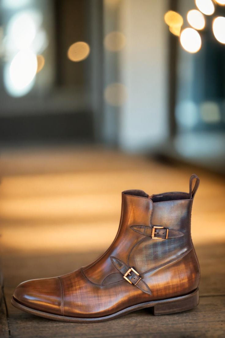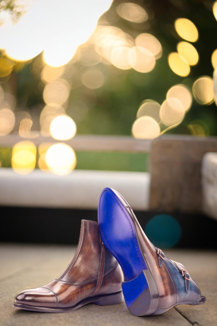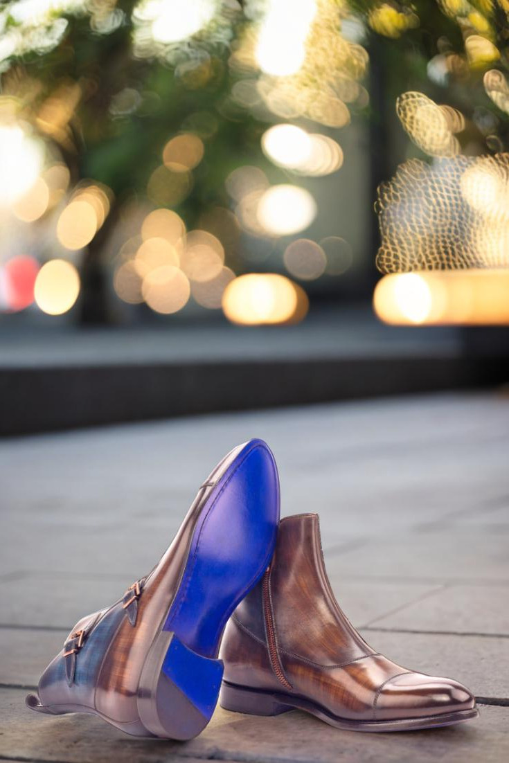 The front, sides, and toe cap are made of luxurious Italian Calf Leather, all hand-patinaed in a rich brown color that exudes elegance and class. The vamp features a unique Papiro hand patina, adding depth and character to the overall design. And the back and strap are adorned with a denim blue marbled hand patina, making these boots stand out from the rest.