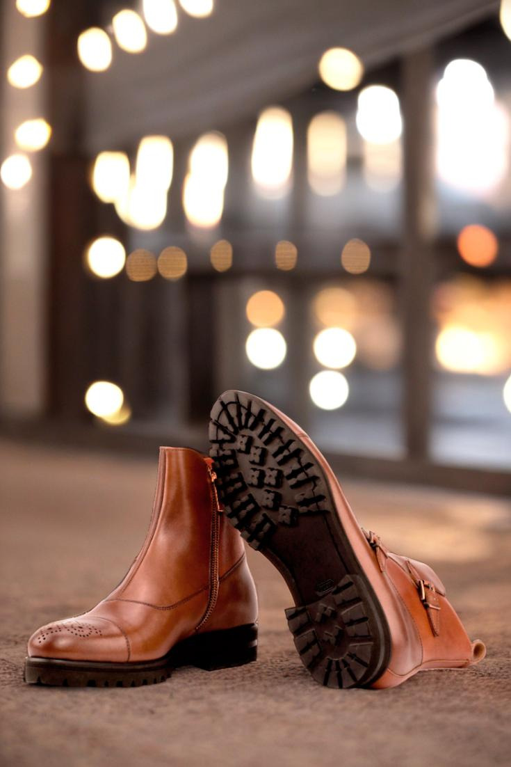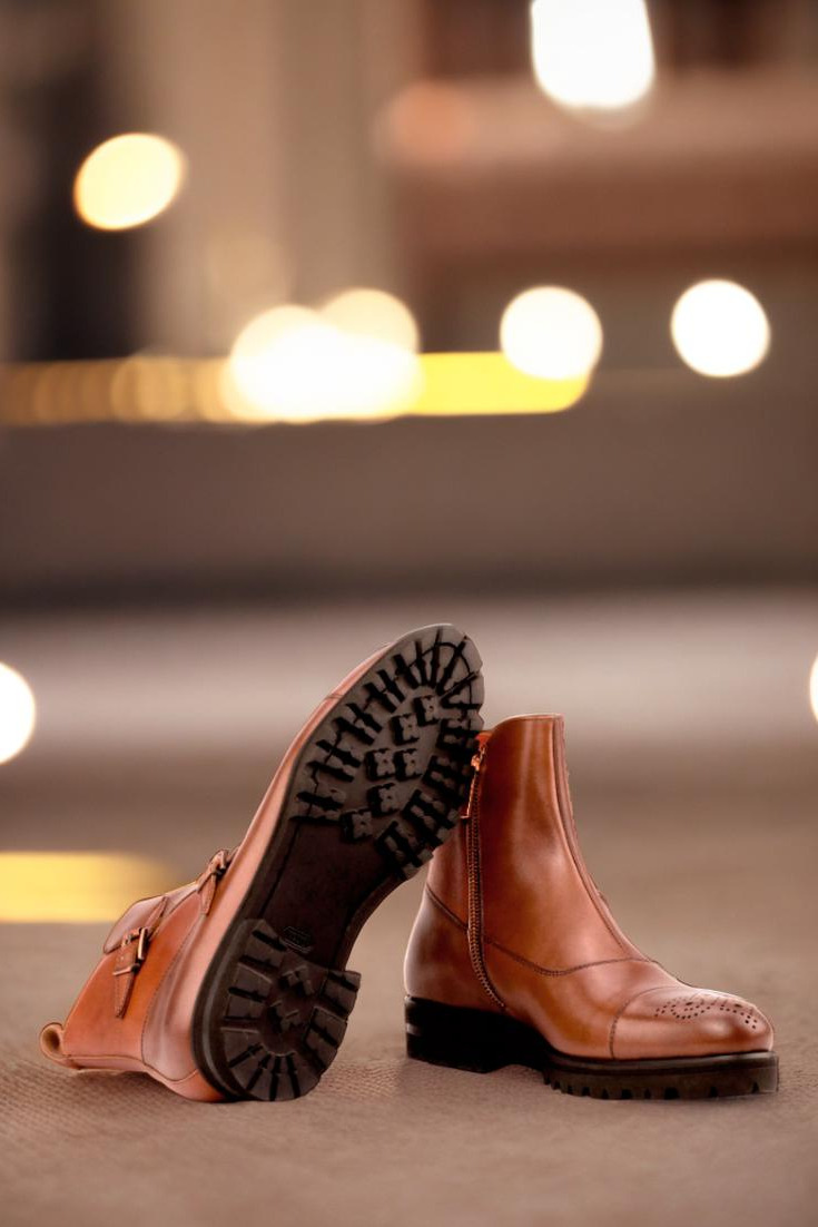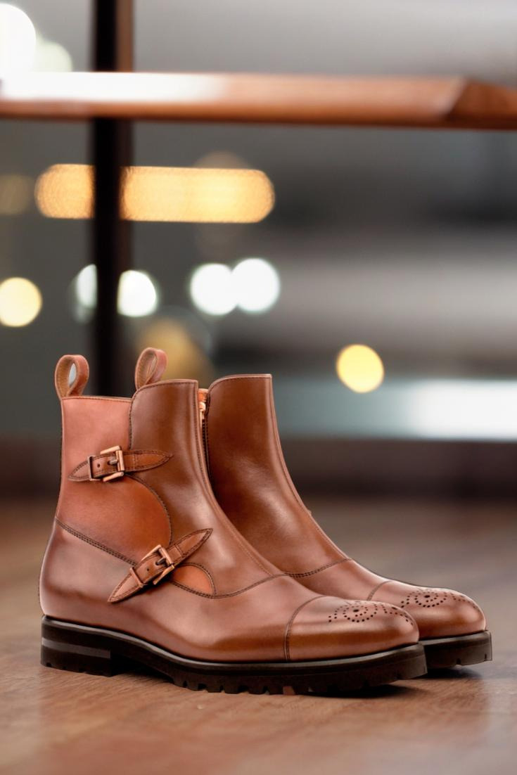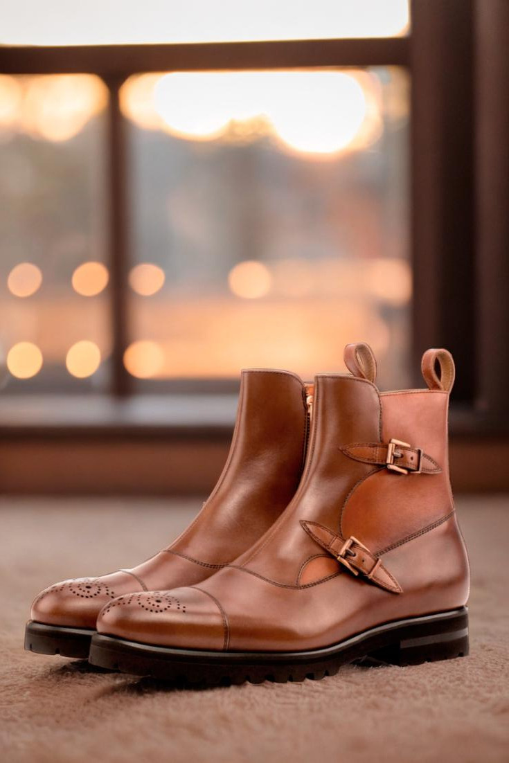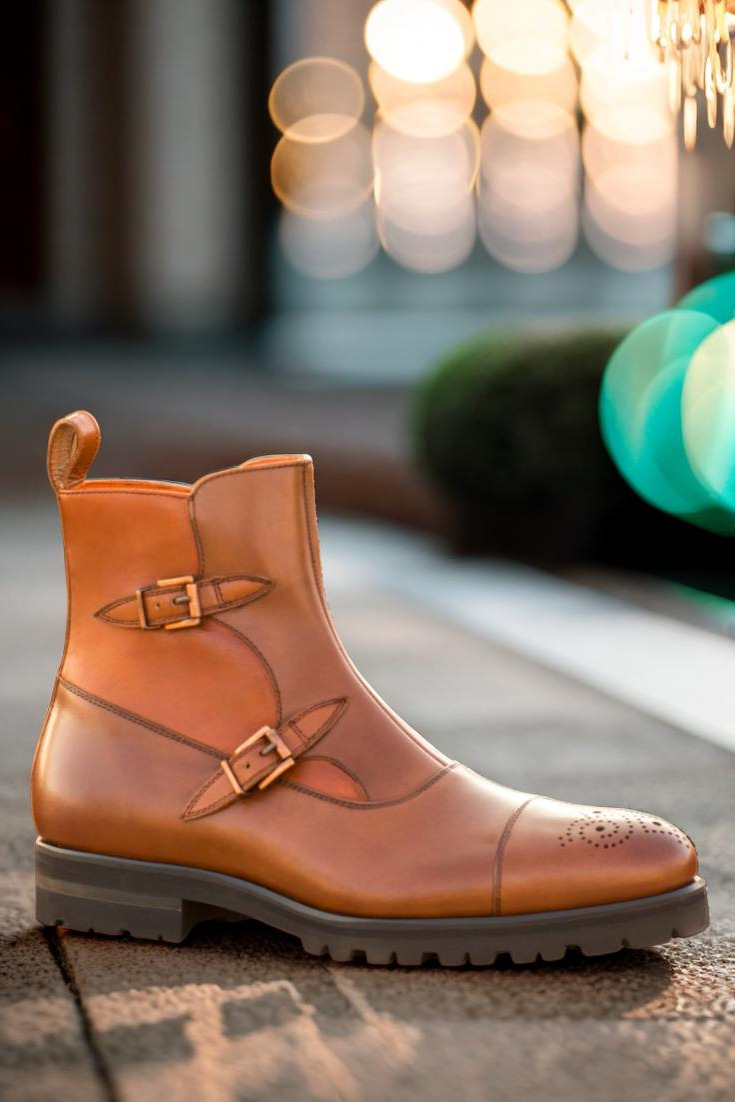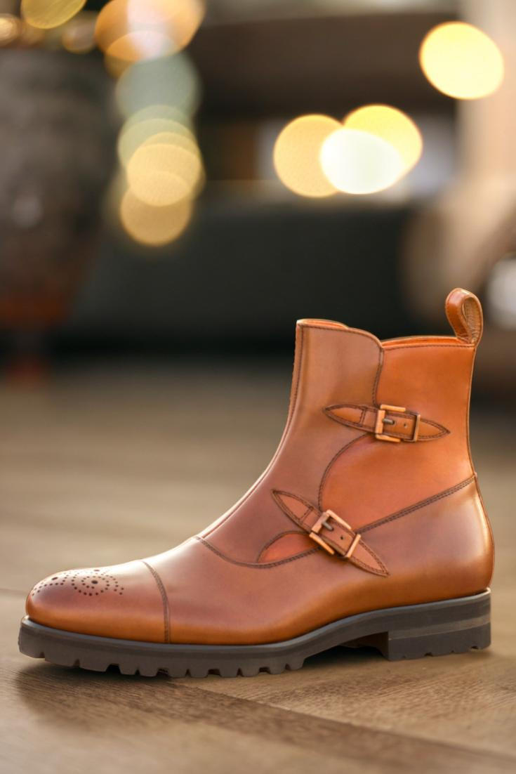 Crafted with precision and care, this boot features a stunning combination of medium brown and cognac box calf leather. The front, vamp, and punched toe cap boast a rich medium brown hue, while the sides and back add a touch of sophistication with the luxurious cognac leather. The strap, adorned with two copper buckles and a zipper, completes the look with a subtle yet bold statement.