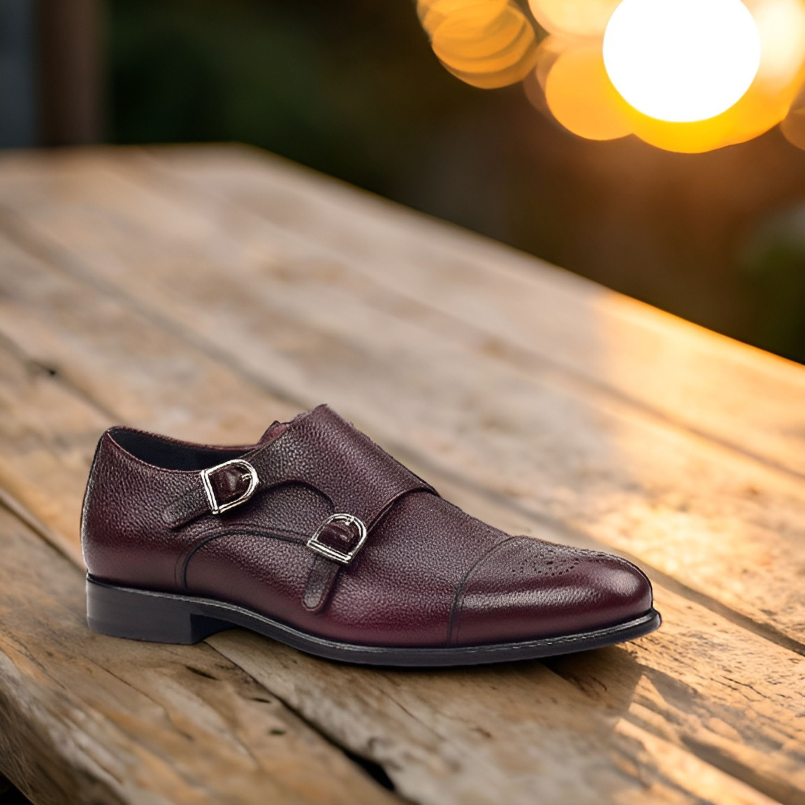 The uppers of these double monkstraps are made from a rich, burgundy painted full grain leather, standing out with its unique color and texture. Adding a touch of sophistication are the rounded-nickel buckles, giving these shoes a refined and polished look.