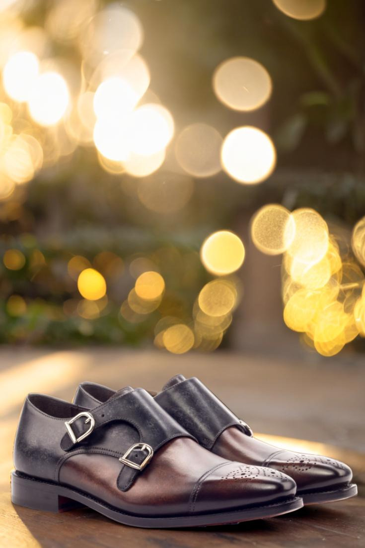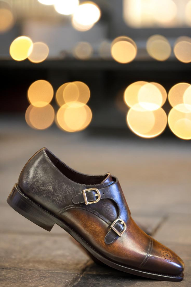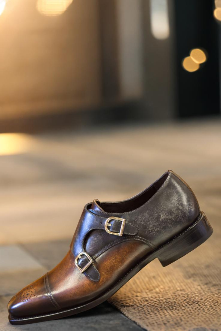 The uppers are made from exquisite Italian Calf Leather, giving them a rich and elegant appearance. But what sets these shoes apart is the unique hand patina finish in a sophisticated brown and grey marble style, adding a touch of individuality to your wardrobe. The rounded nickel buckles add a subtle shine and complete the classic monk strap look.