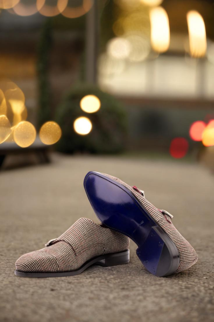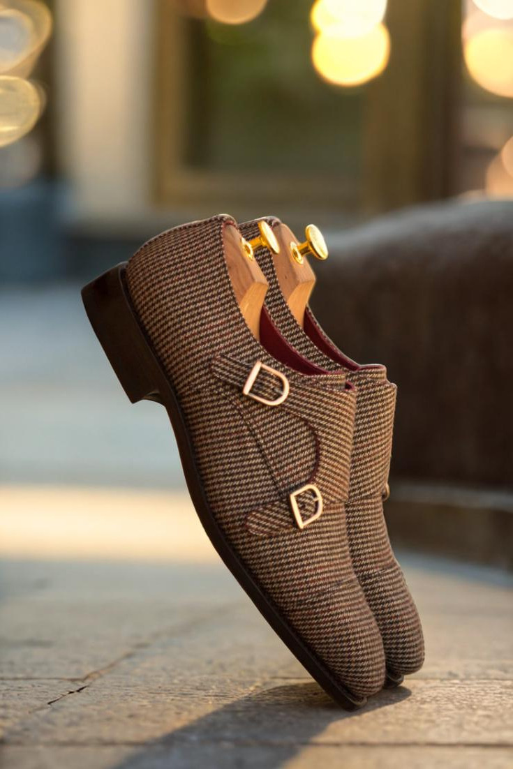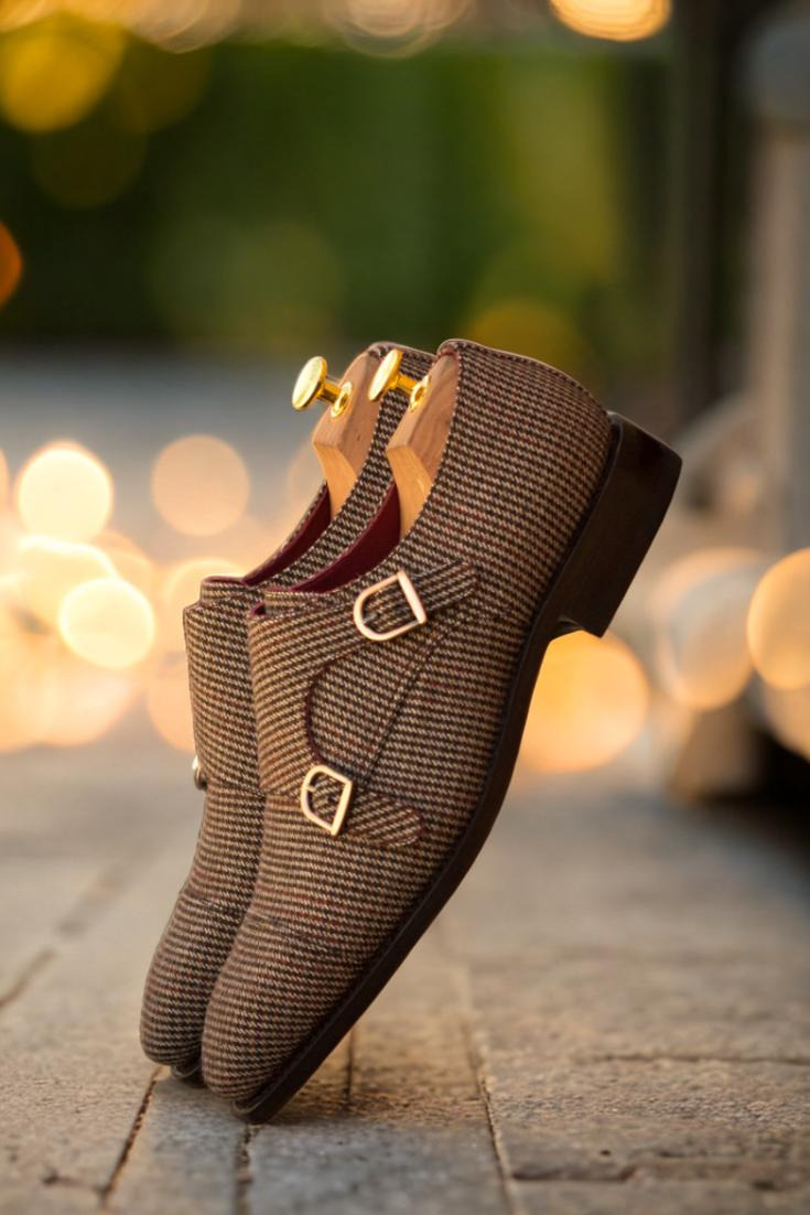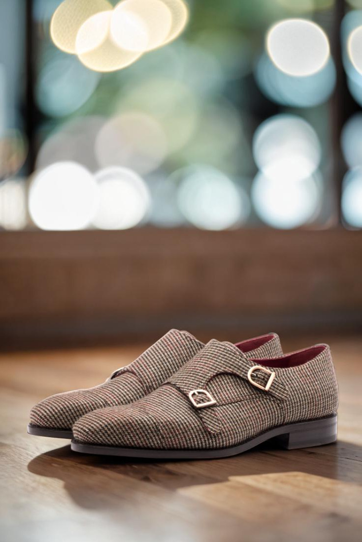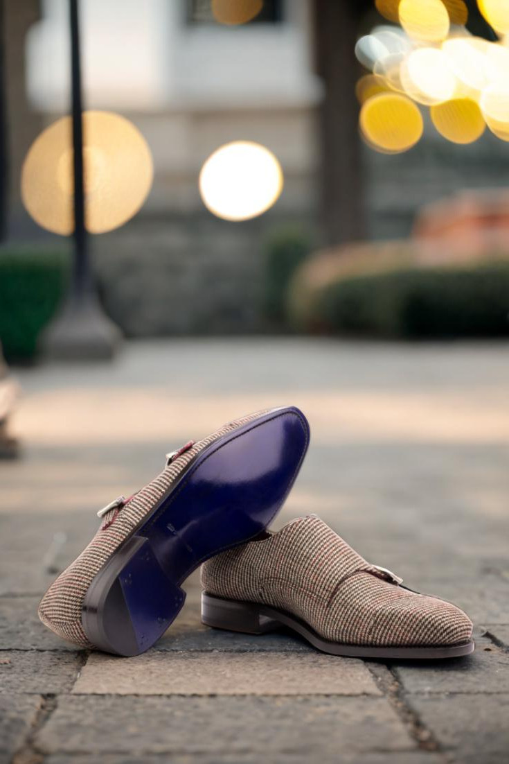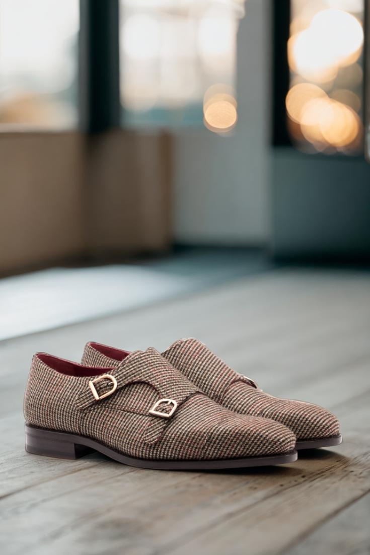 The upper of the shoe is made of luxurious Tweed Wool, adding a touch of texture and luxury to the overall design. The rounded-copper buckles not only provide a touch of elegance but also serve as a functional detail, making it easy to slip on and off with ease.
