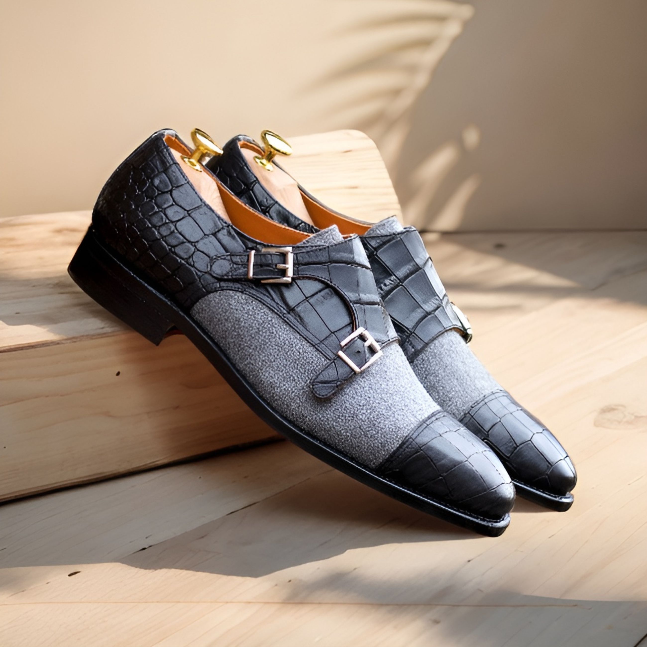 Introducing the Damen Ave. Double Monk No. 5766 from Robert August. A timeless classic designed with a modern twist, this shoe is sure to add some flair to your wardrobe. The toe cap is crafted from luxurious black croco embossed calf leather, and the vamp is an eye-catching light grey flannel. Work with the velvet quarter and back for an added touch of opulence. The squared-nickel buckles offer an extra layer of sophistication. To complete the look, a padded orange calf leather interior is designed for maximum comfort and style. Finally, the orange-hand-painted leather sole is finished with rubber button injections. Impress onlookers with this smart and stylish piece of footwear from Robert August. With its sophisticated design and luxurious materials, the Damen Ave. Double Monk No. 5766 is the perfect shoe to elevate any look. Get yours today!