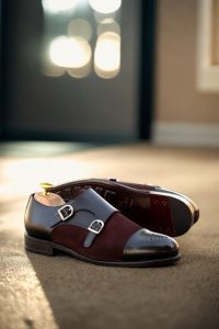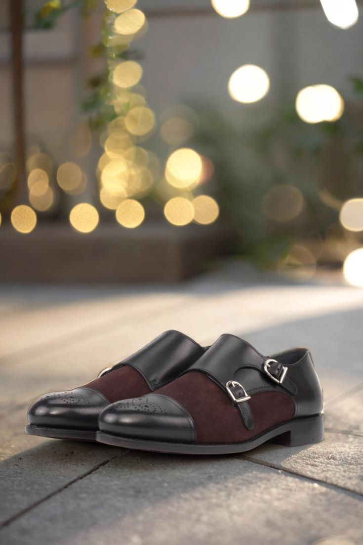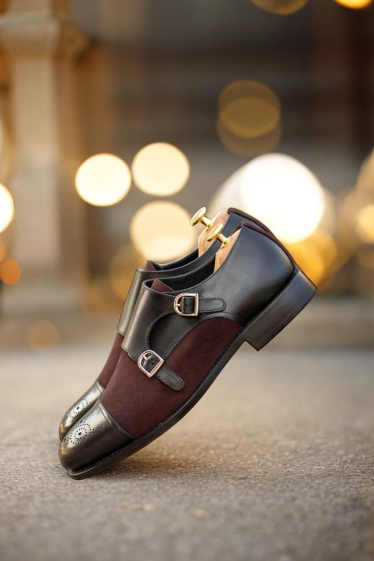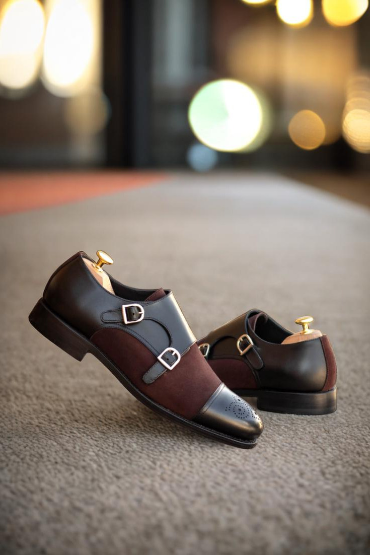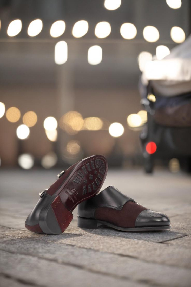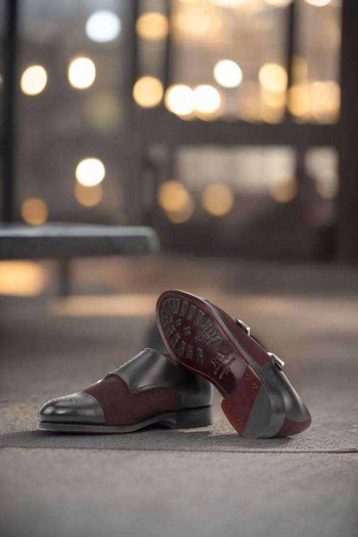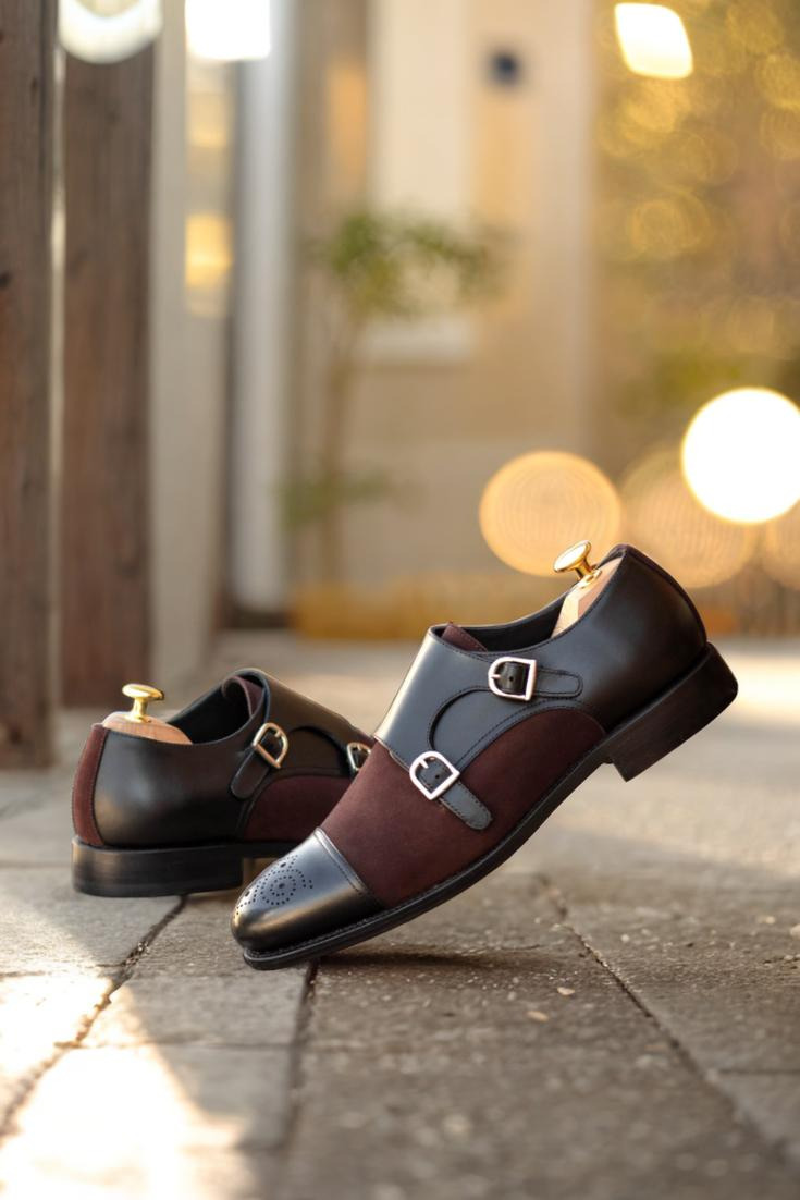 The inner and outer quarters, crafted from Black Box Calf, exude a sleek and polished aesthetic. The contrast between the black and burgundy creates a captivating visual appeal that will leave a lasting impression wherever you go. Adding an element of sophistication are the rounded-nickel buckles, completing the double monk strap design with flair and elegance.
