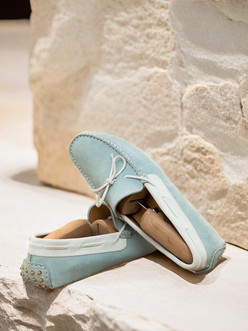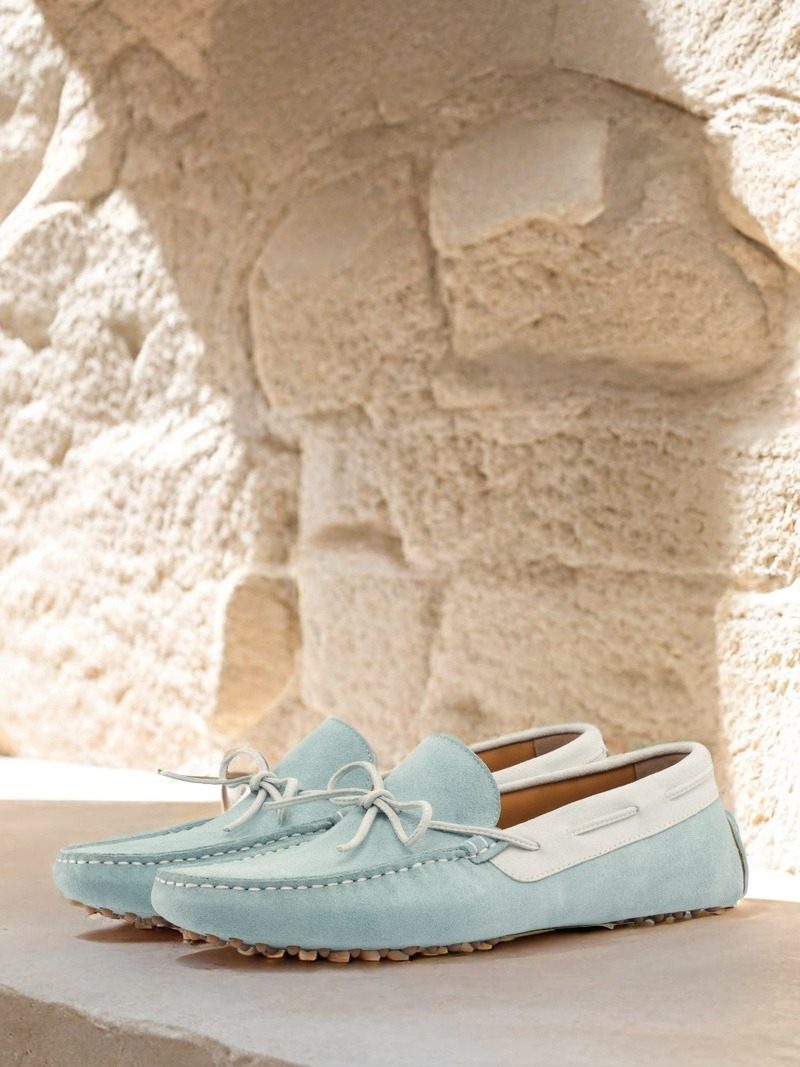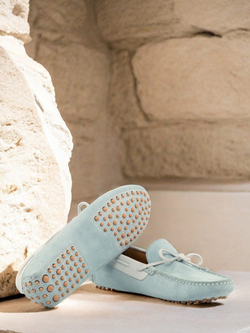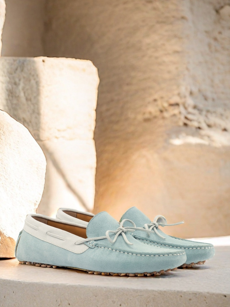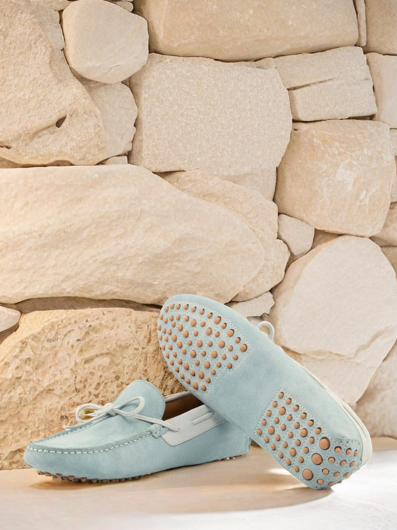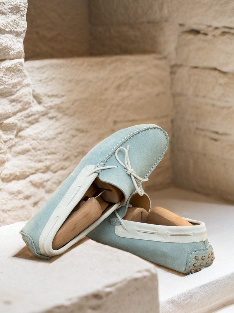 Introducing the epitome of luxury and style in men’s footwear – The Racine Ave. Driving Moccasin No. 3682 from Robert August. Handcrafted in Spain, this driving moccasin boasts a combination of light blue and white suede uppers, giving it a distinct and sophisticated look. The white suede bow adds a touch of elegance, while the crisp white stitching adds a subtle pop of contrast. The lining of this moccasin is made of premium brown calf leather, ensuring maximum comfort and durability. And to top it off, the beige gommini rubber sole not only adds a modern touch, but also provides superior traction and flexibility while driving. Whether you’re running errands or heading out for a night on the town, The Racine Ave. No. 3682 is the perfect choice for the stylish and practical man. Upgrade your shoe game with Robert August’s finest creation – get your hands on The Racine Ave. No. 3682 today.