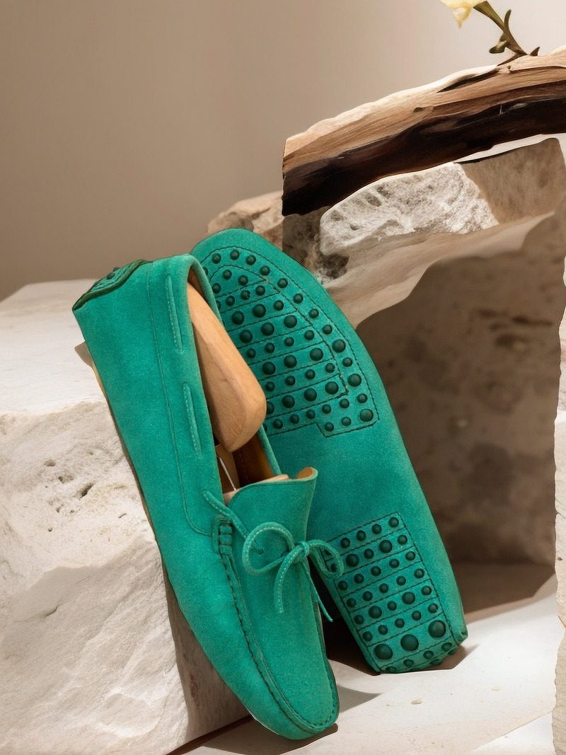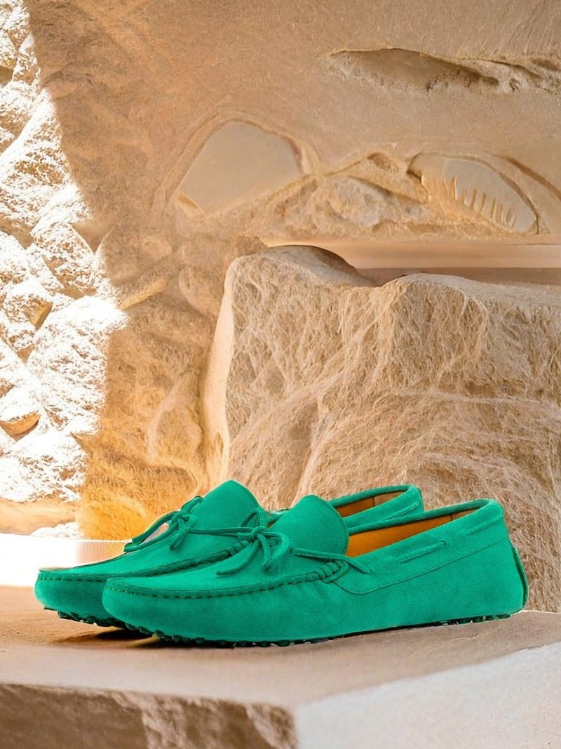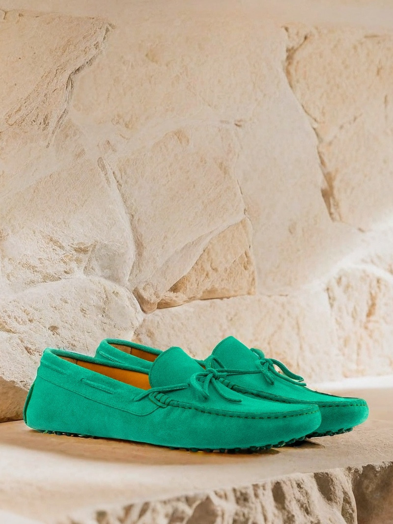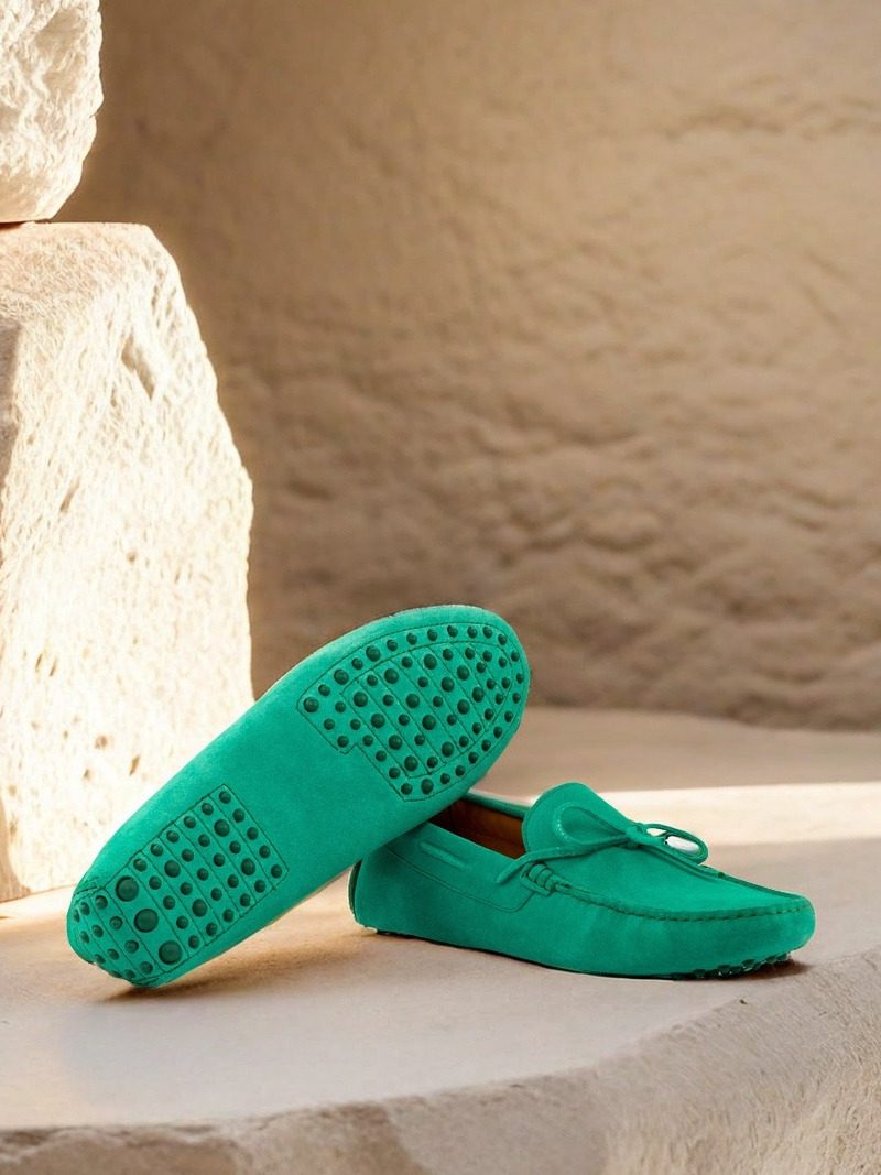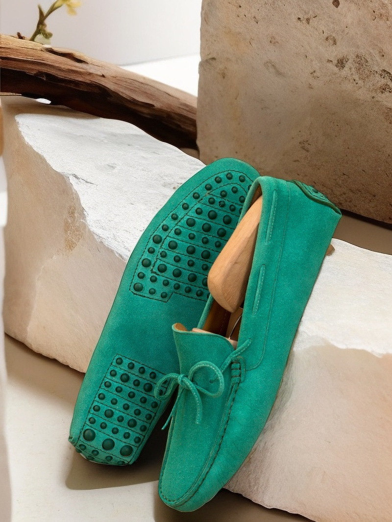 The uppers, made from rich green suede, add a pop of color to any outfit. The bow, also crafted from matching green suede, adds a touch of elegance and sets this moccasin apart from any other. The stitching, done in a complementary green, adds a subtle yet eye-catching detail to the overall design.