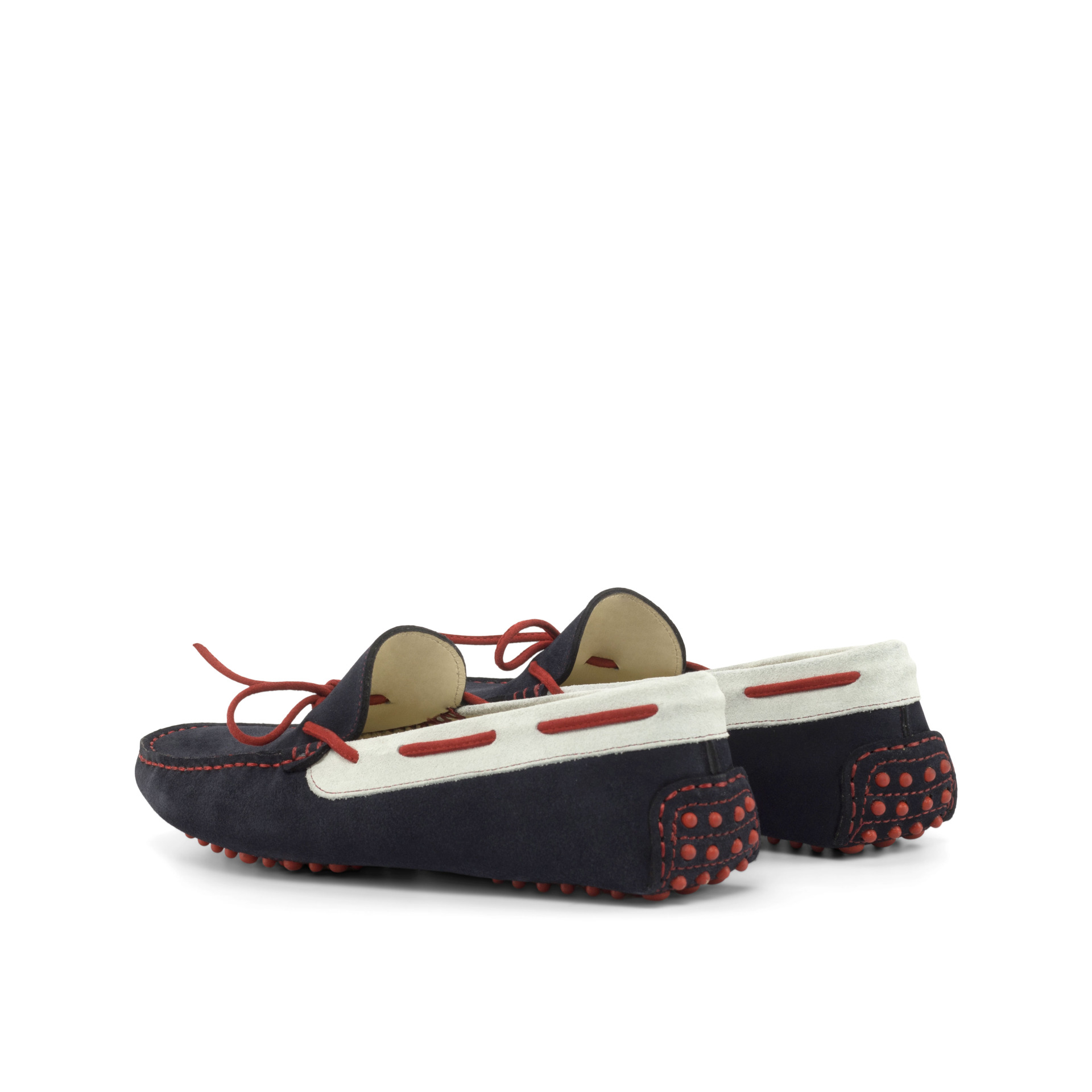 Crafted in Spain by skilled artisans, this shoe features a navy blue, white and red suede upper that exudes confidence and sophistication. The standout feature is the bold red suede bow, adding a touch of playfulness to the overall design.
