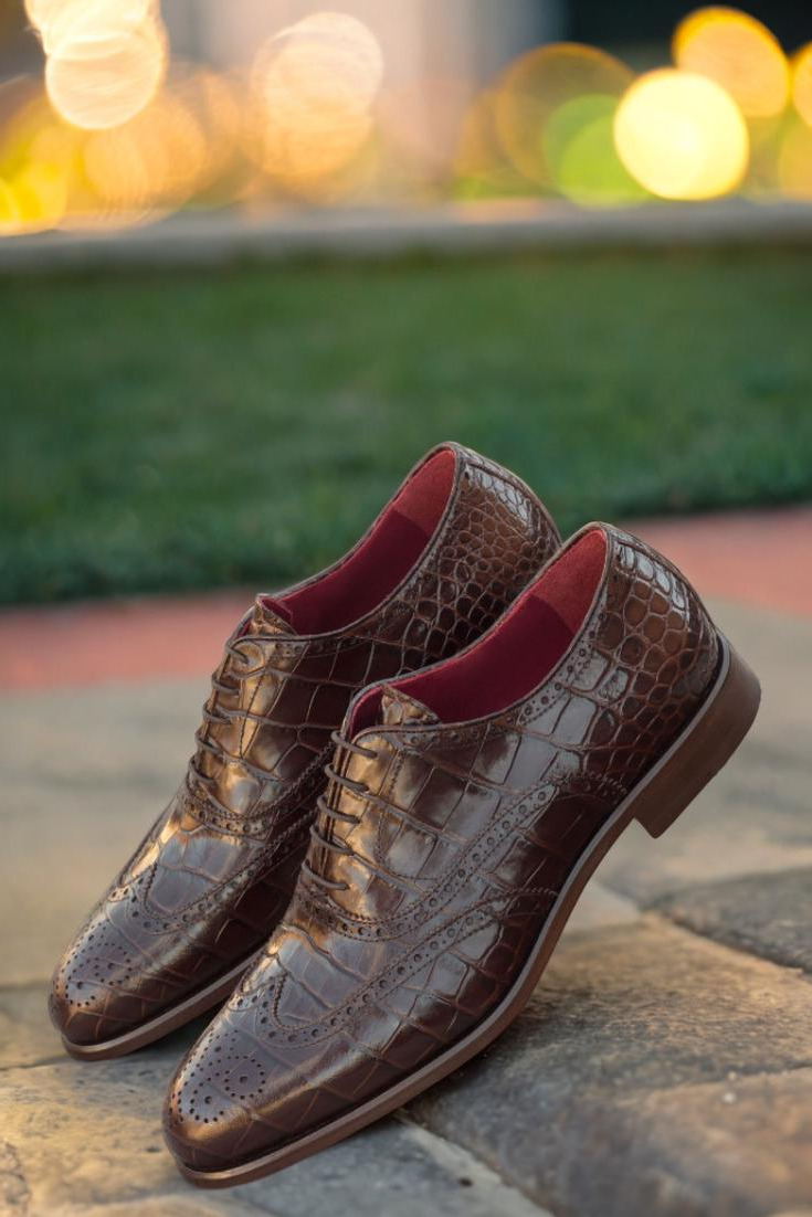 Introducing the Devon Ave. Full Brogue No. 2431 from the esteemed Robert August brand. With its sleek and sophisticated design, this shoe is the epitome of timeless class. Crafted from a rich dark brown croco print leather, it exudes a sense of luxury and warmth. The matching brown laces add a touch of contrast, while the vibrant red calf leather lining provides a pop of color and comfort.