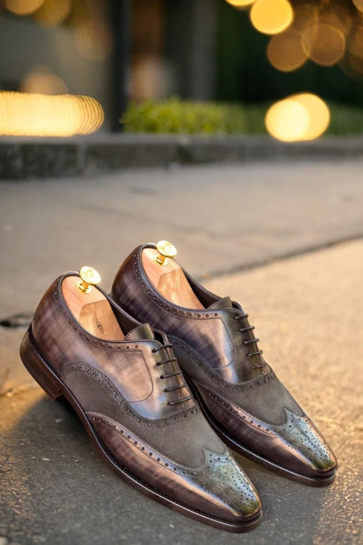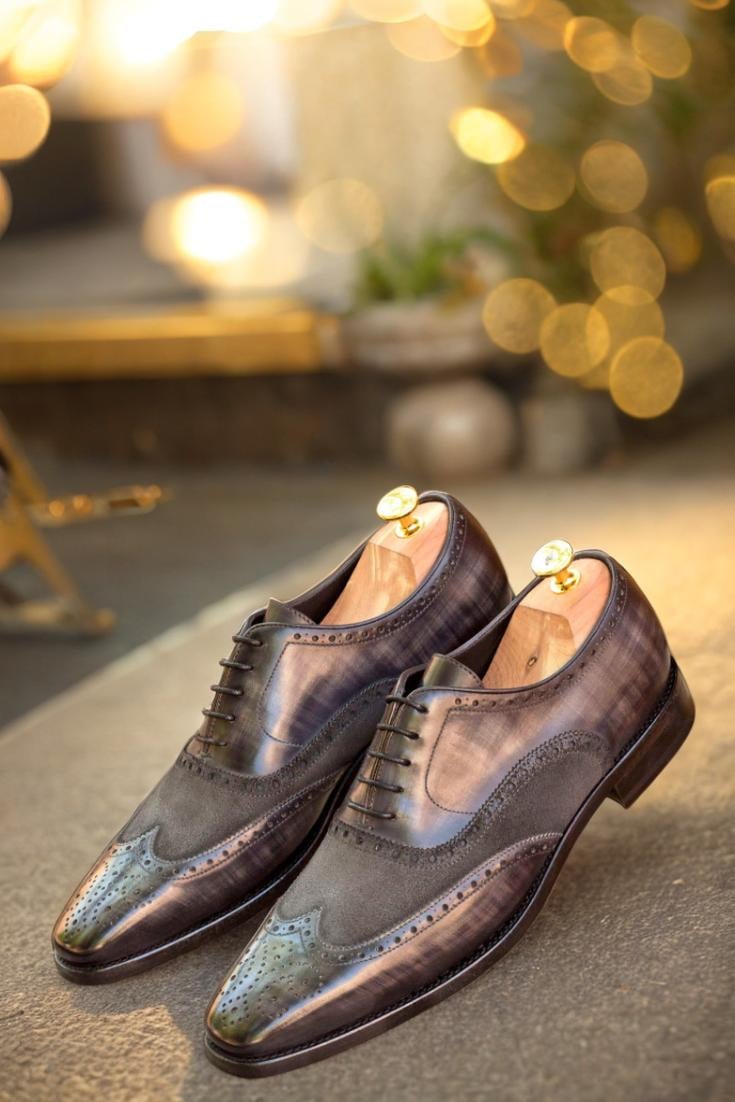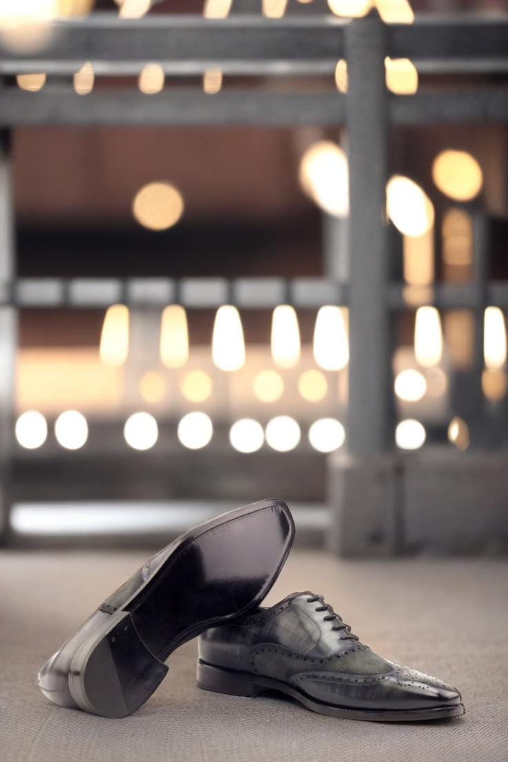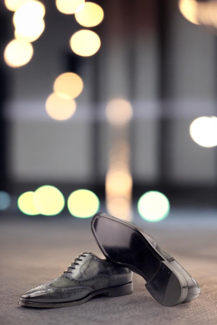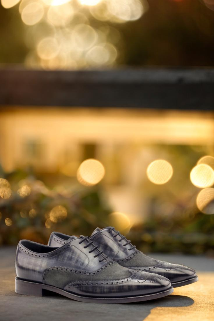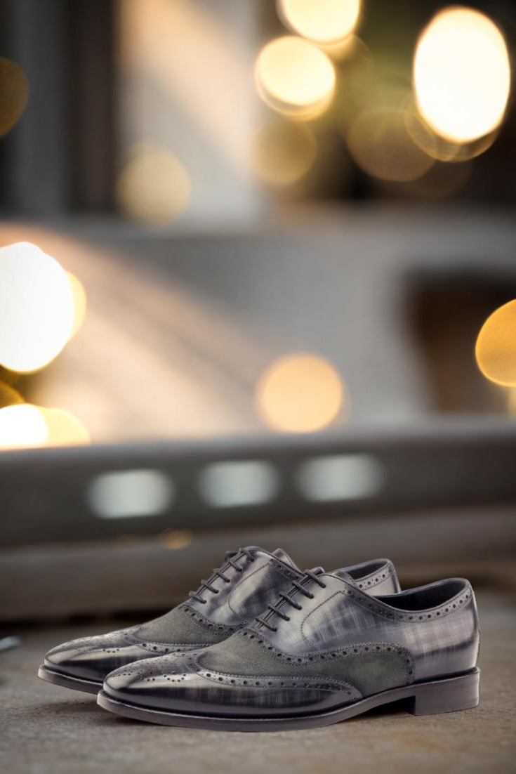 Elevate your shoe game with The Devon Ave. Full Brogue No. 2766 from Robert August. These stunning shoes are the epitome of sophistication, handcrafted in Spain with the utmost care and precision. Made with the finest Italian Calf Leather in a rich, deep grey tone and enhanced with a hand patina in the striking Papiro style, these shoes are truly one-of-a-kind.