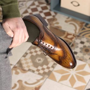 Have you been looking for a timeless and classic style for your footwear collection? The Devon Ave. Full Brogue No. 5649EX from Robert August is the perfect addition! These stylish shoes are made with the highest quality materials, featuring uppers of Cognac Orignal Hand Patina Leather, Brown Calf Leather lining, and Brown flat laces. The sole features Cogna Hand Painted Leather with rubber buttons, while the outsole is finished in rich brown. Plus, these shoes feature a unique Last – The 312 – that has a rounded toe for a traditional English style. And that’s not all – these Robert August shoes also boast Goodyear Welt Construction for added durability and style. With such impeccable craftsmanship you won’t need to sacrifice comfort in order to look good! Best of all, you can order this pair as designed or customize it to match your individual style. Make sure you pick up your pair of Devon Ave Full Brogues at Robert August – they’ll make an elegant statement for any outfit!