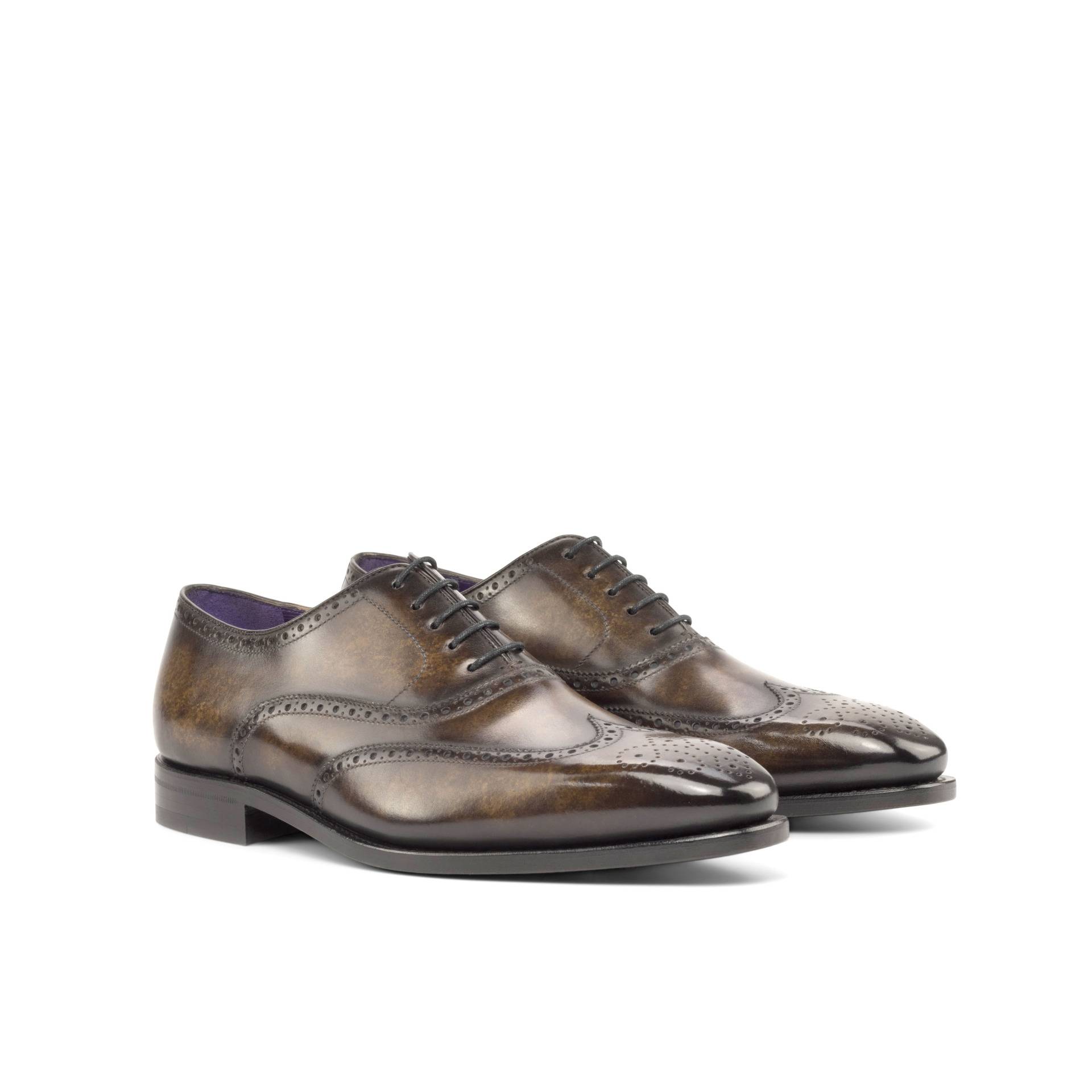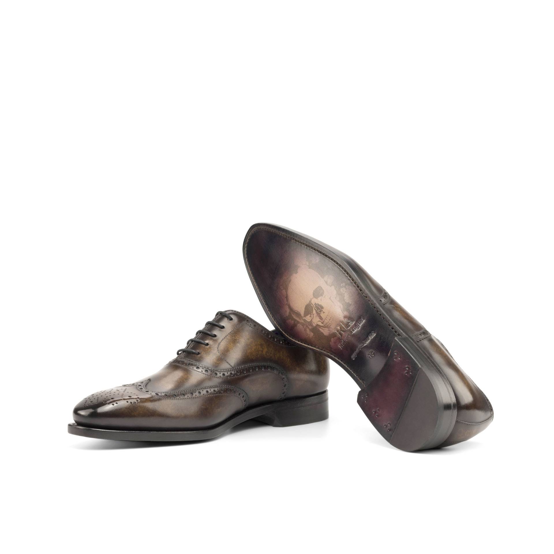 The Devon Ave. Full Brogue No. 8046 is the perfect shoe for any gentleman looking to make a statement. It boasts an expertly crafted, Italian calf leather upper with a beautifully hand patinaed marbled finish in a unique combination of brown and purple hues for an eye-catching look that is unique to each pair. Its patina is light, creating a subtle but stylish balance to the shoe’s stunning leather details. The classic black lacing pairs seamlessly, while the striking navy blue calf skin lining adds another layer of class and sophistication to this sophisticated style. What truly sets this shoe apart is its bold burgundy skull art leather sole, making it perfect for the man who isn’t afraid to make a statement – both literally and figuratively. Whether you’re heading off to the office or out on the town, you can be sure that you’ll be stepping out in style with The Devon Ave. Full Brogue No. 8046!