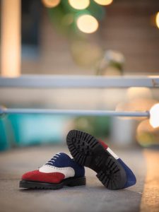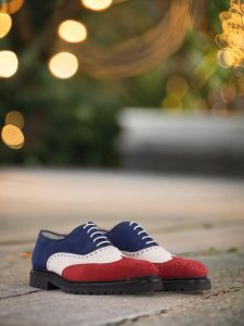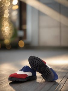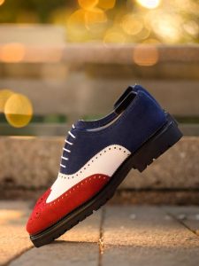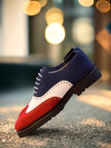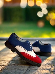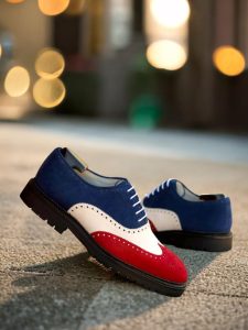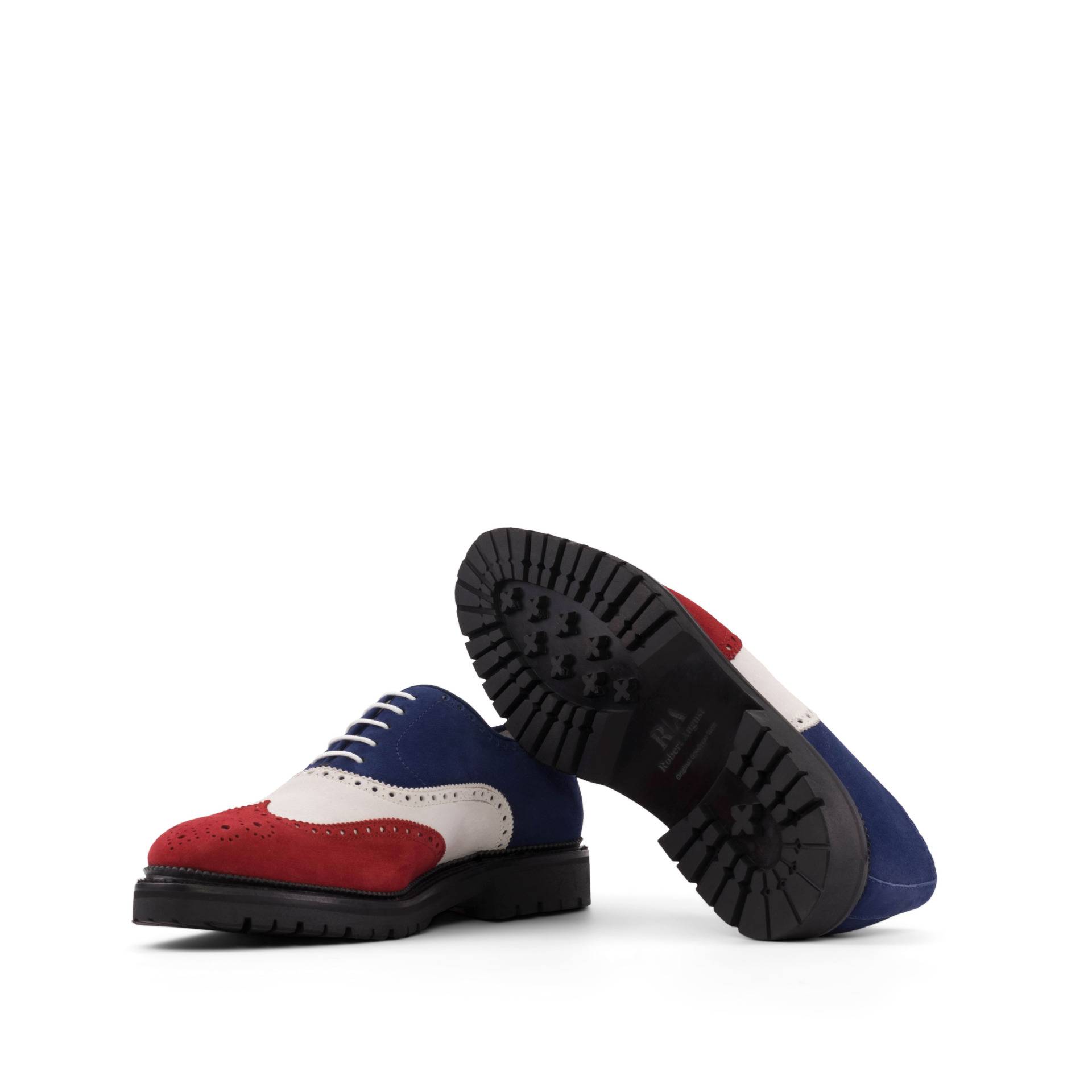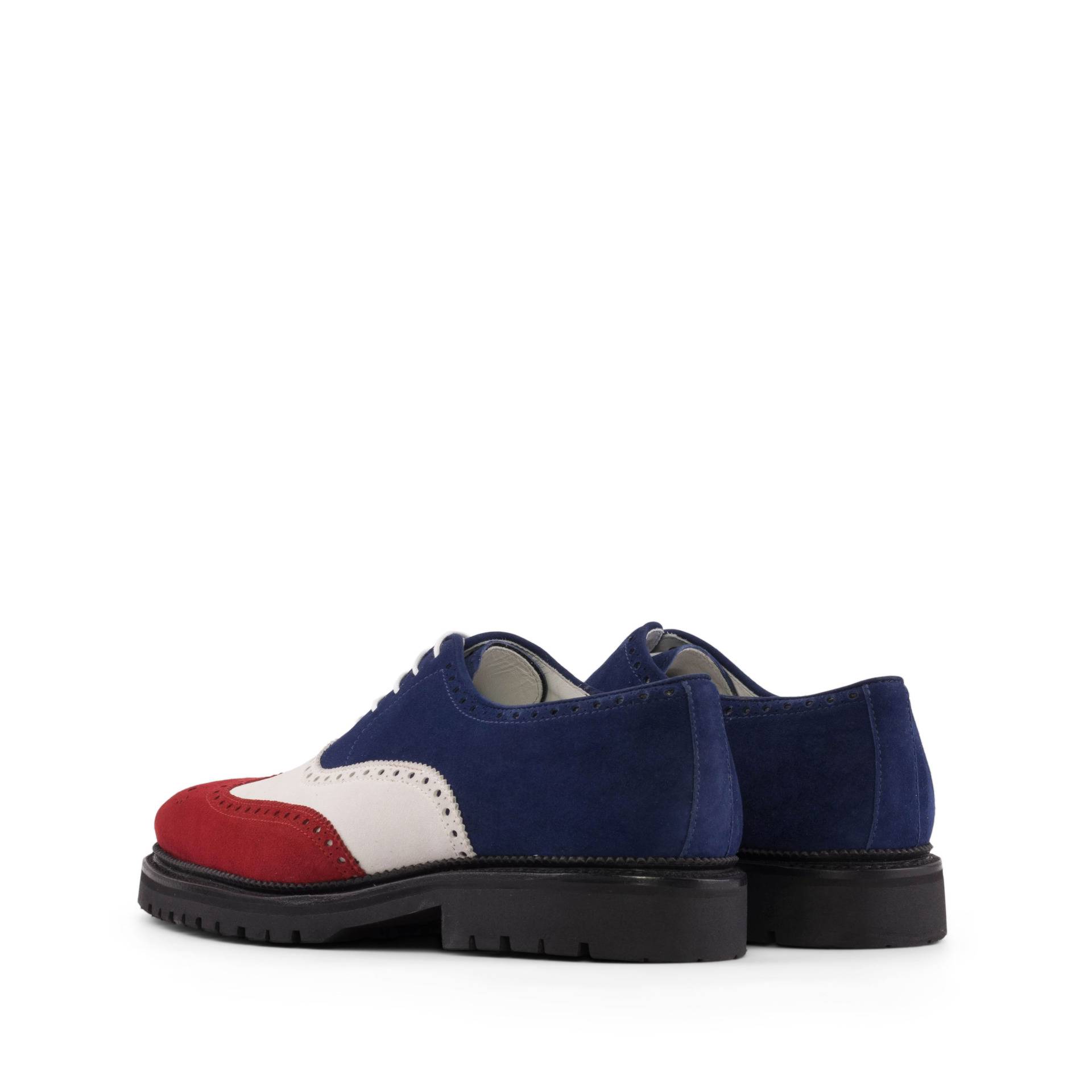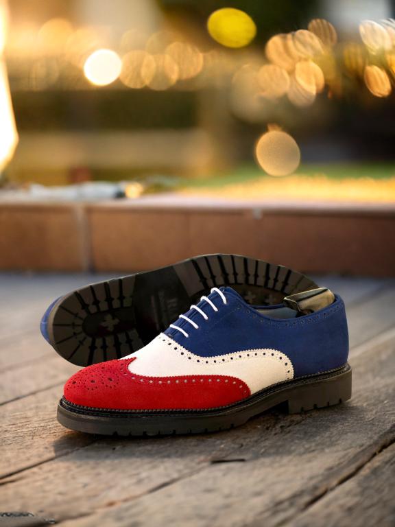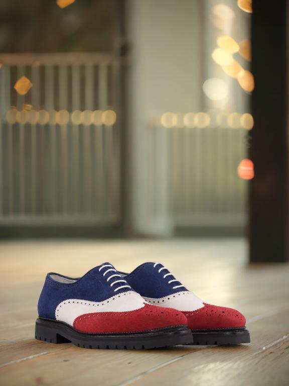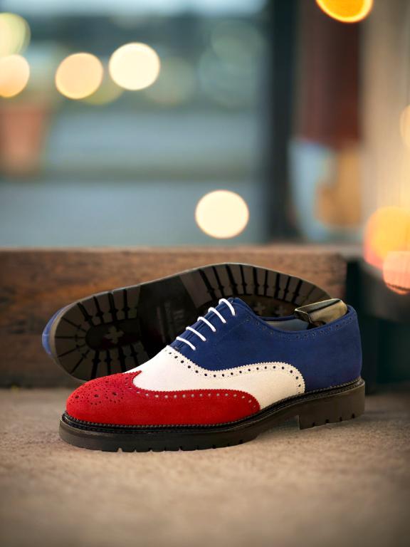 The mix of luxurious Red, White, and Navy Blue Kid Suede on the wingtip, vamp, tongue, quarter, and back creates a stunning contrast that is sure to catch the eye of any fashion enthusiast. The Round-White laces add a touch of modernity to the classic brogue design, making it a perfect choice for the contemporary gentleman.