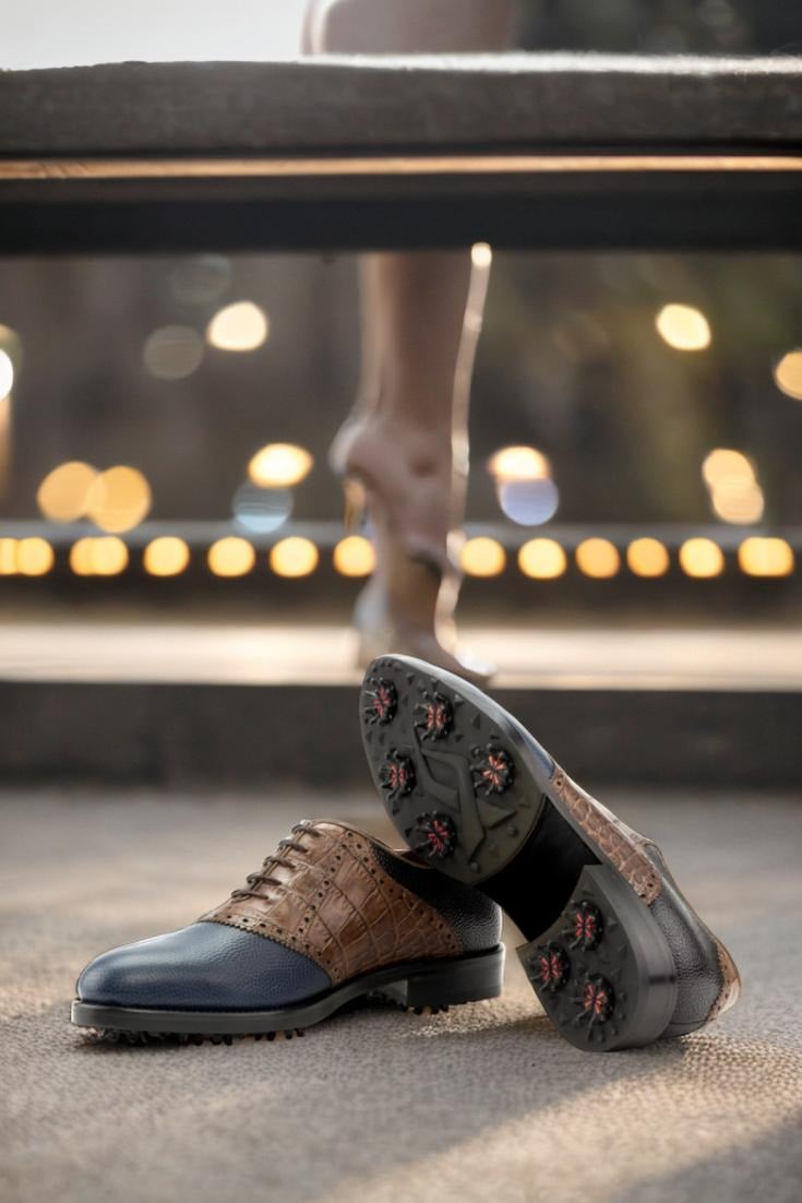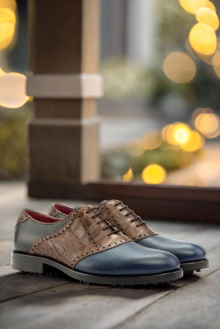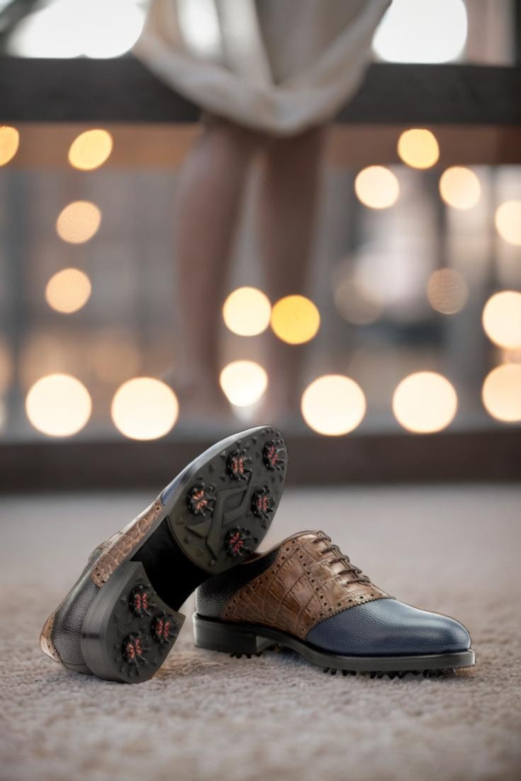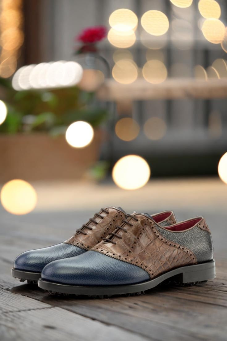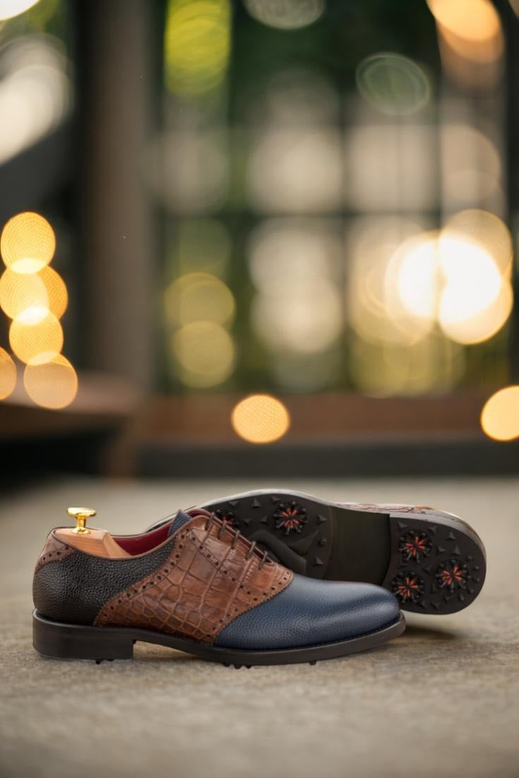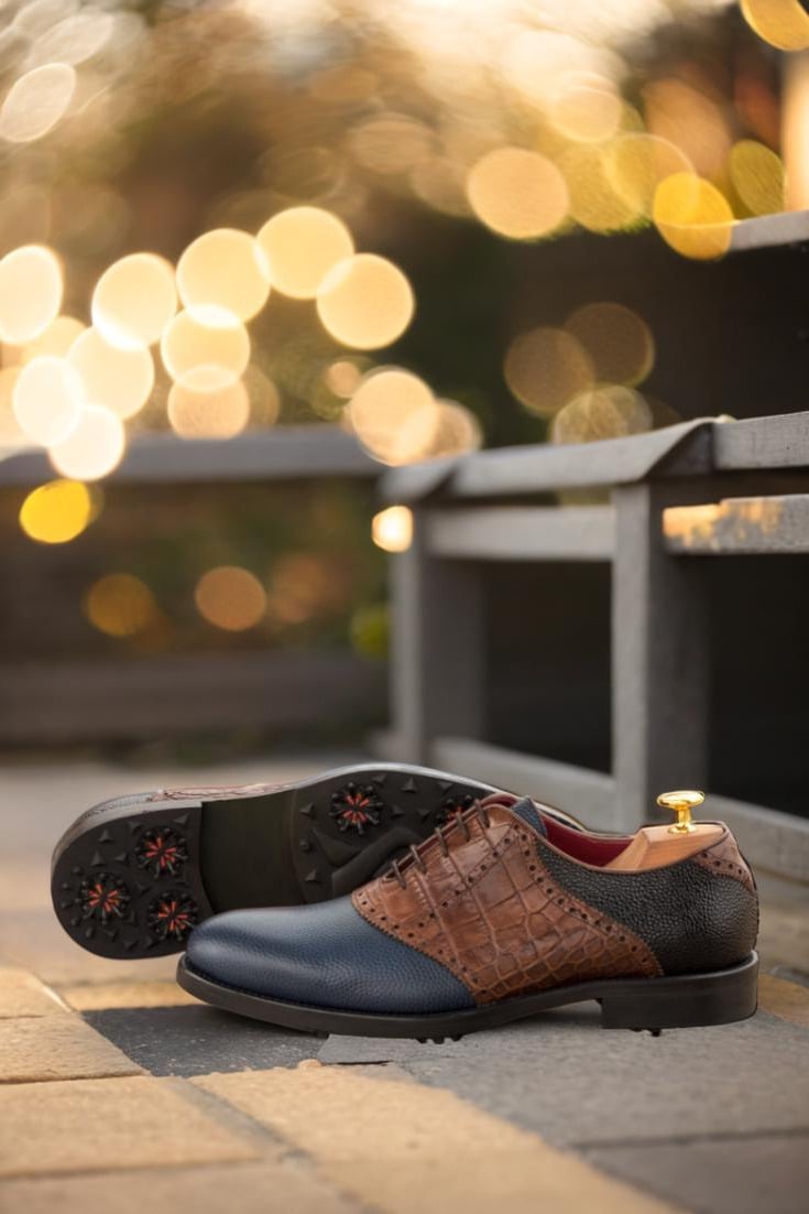 The Lincoln Ave. Saddle Shoe No. 3618 features a unique combination of materials, including navy blue pebble grain leather, dark brown croco embossed calf, and black pebble grain leather. These premium materials not only make a statement, but also provide durability and comfort for those long days on the green. The brown-round laces add a touch of sophistication, completing the overall classic and timeless design of the shoe.