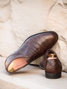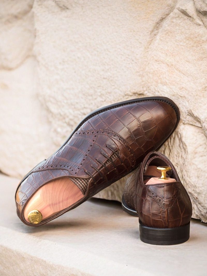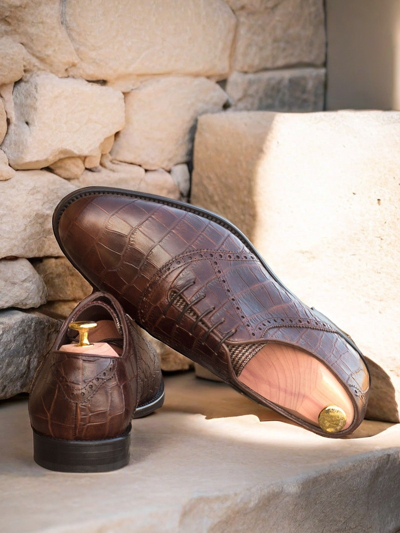 Featuring a dark brown croco embossed calf leather on the front, saddle, side, and back, this shoe exudes a classic and timeless elegance. The tongue is adorned with a subtle tweed fabric, adding a touch of sophistication to the overall design. Brown round laces complement the color scheme, creating a sleek and polished look.