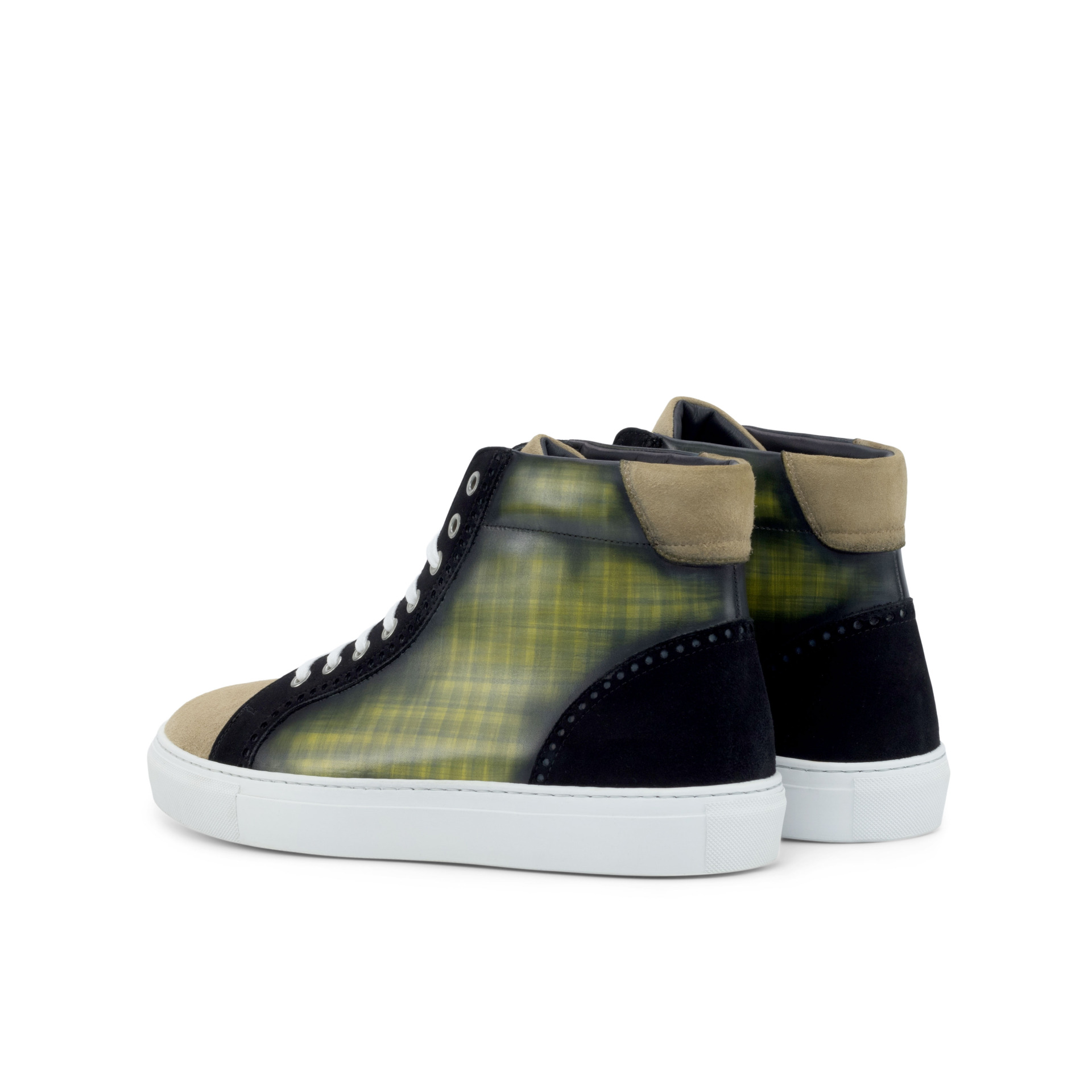 The eyestay and back in black kid suede provide a subtle contrast, while the base in khaki papiro hand patina leather gives the sneaker a unique and edgy touch. The nickel eyelets add a touch of modernity and shine.
