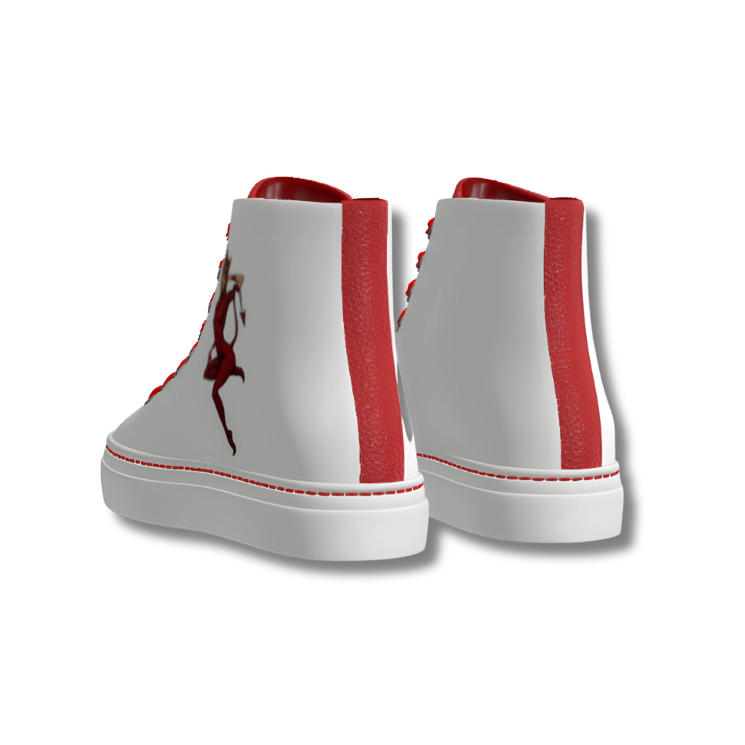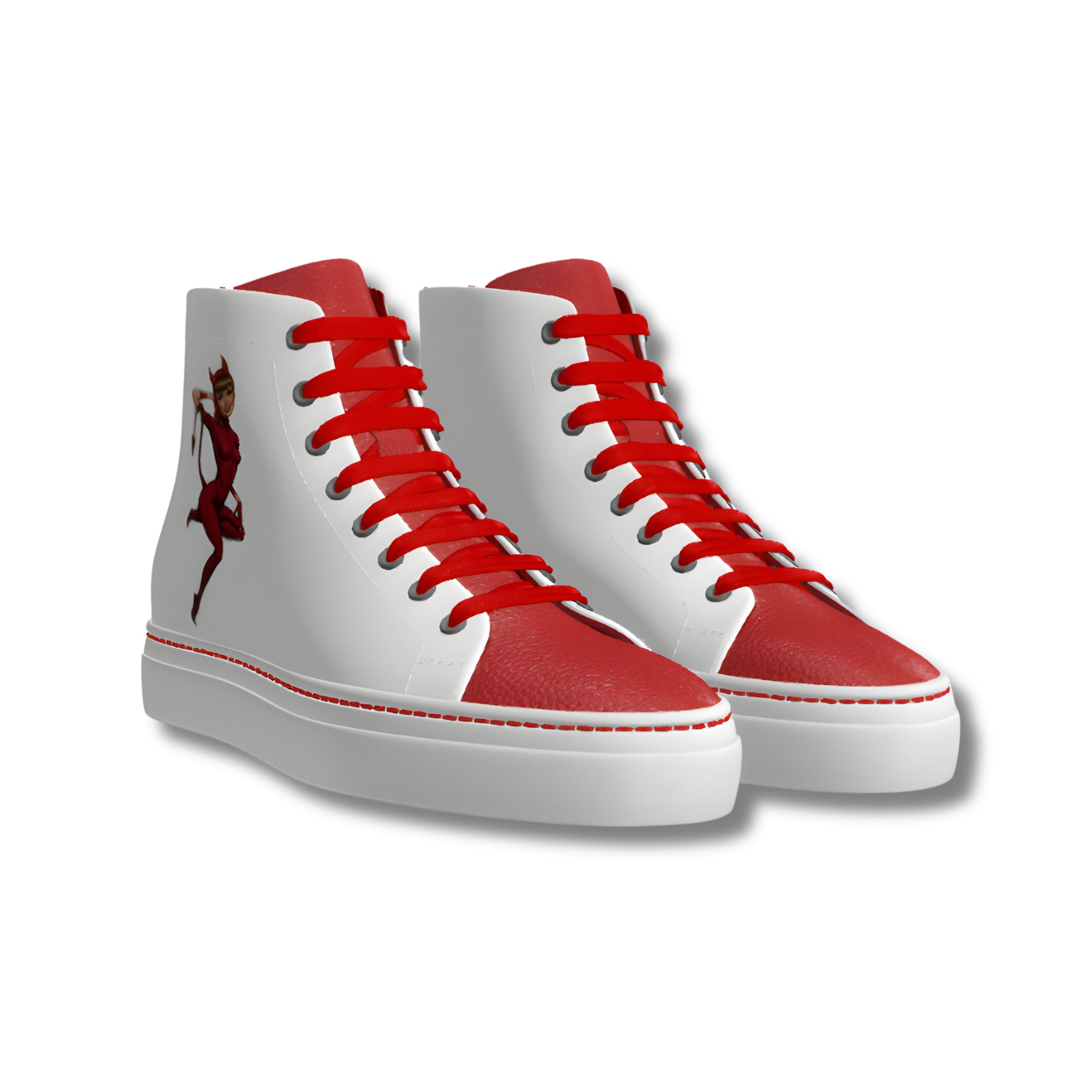 Featuring a striking contrast of red full grain leather toe cap and back, adorned with a bold “Tail of Temptation” graphic print on white nappa leather sides, these shoes demand attention. The eyelet detailing in graphite adds a touch of sophistication, while the red laces and sole stitching add a pop of color to complete the look.