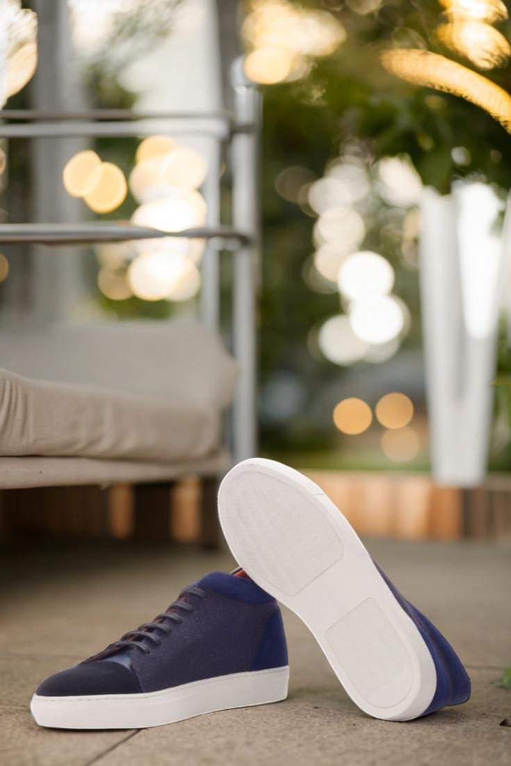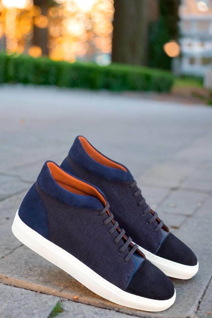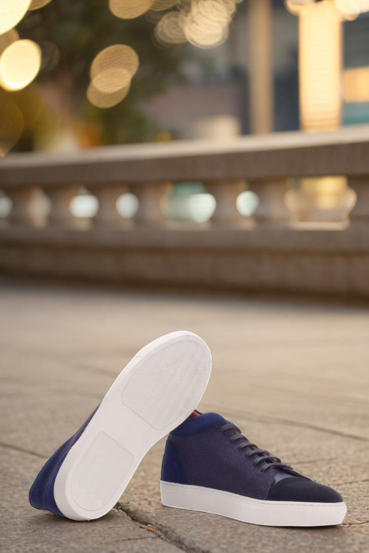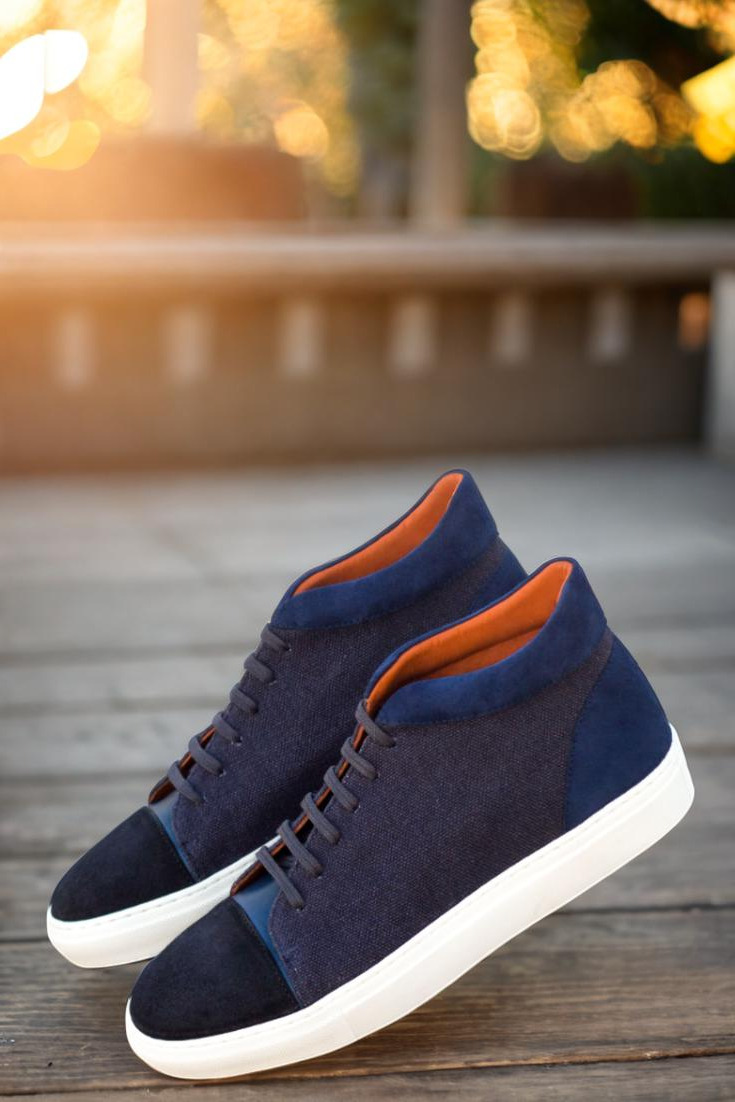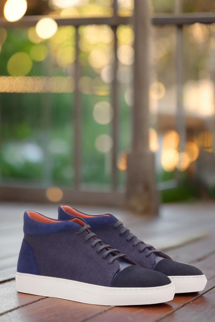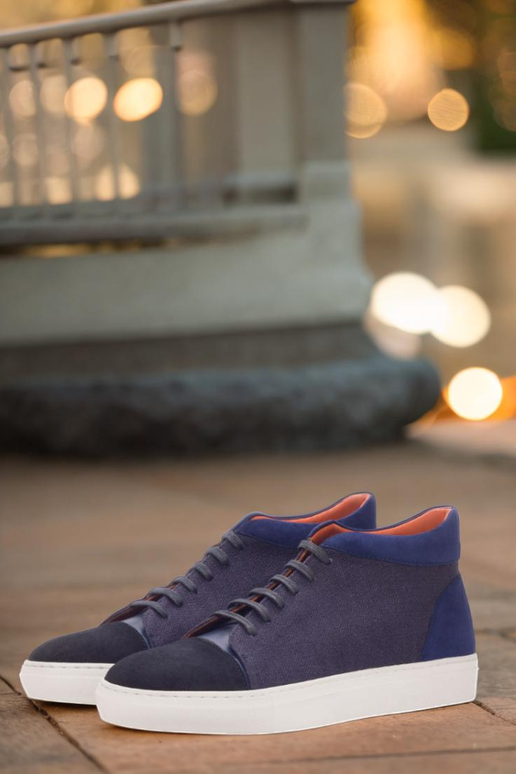 Introducing the Argyle St. High Top Sneaker No. 3349 from Robert August. Crafted with precision and style, these sneakers are the epitome of chic and comfort. With a combination of navy blue linen and suede, and painted calf leather accents, these shoes exude sophistication and attention to detail.