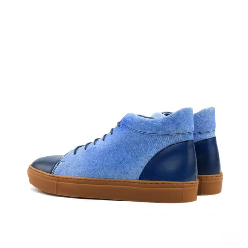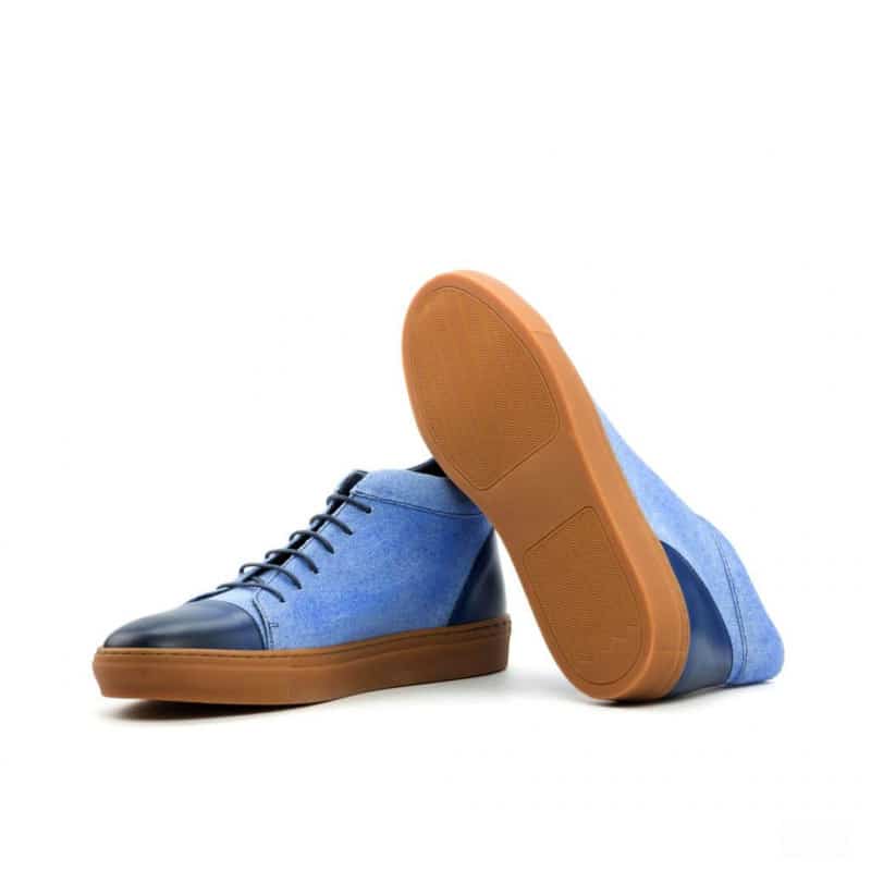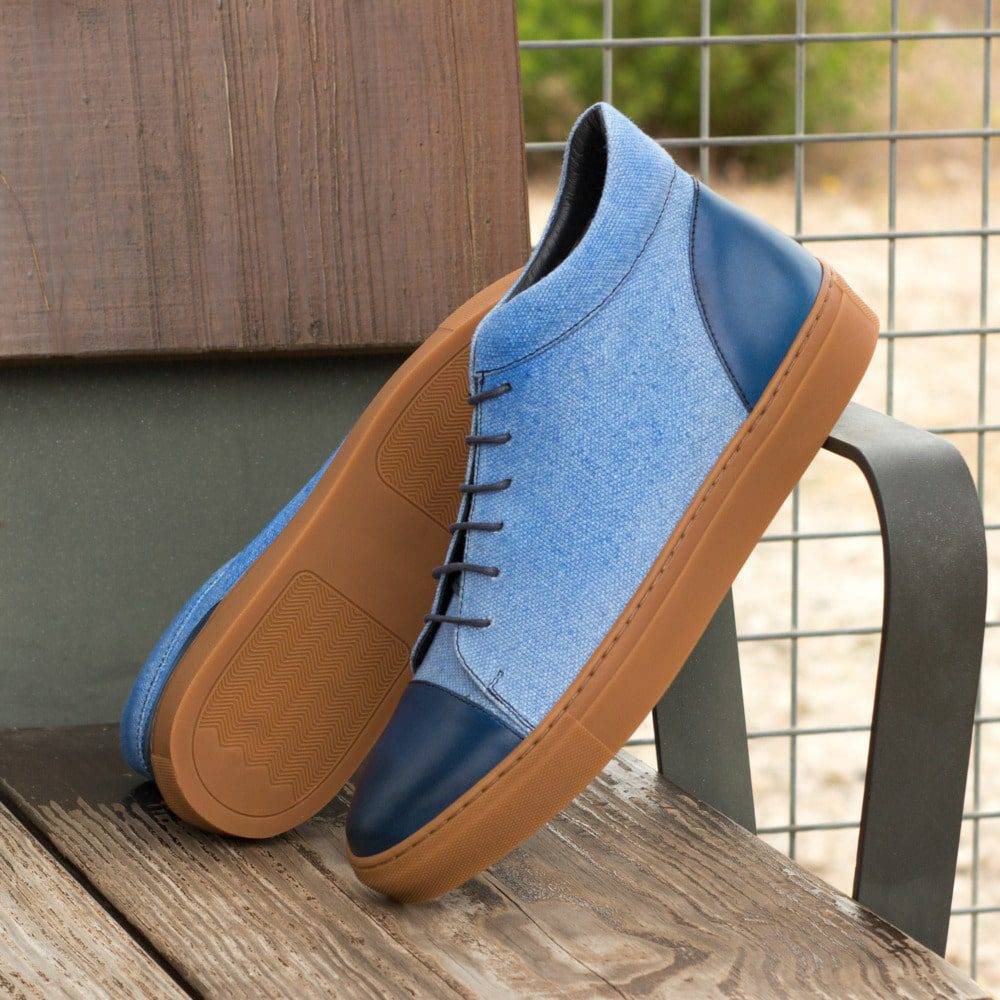 The shoe features a striking combination of blue linen and navy blue painted calf leather uppers, giving it a unique and modern aesthetic. The laces, also in navy blue, add a touch of sophistication to the overall look. But it’s not just about looks with this high top sneaker – the navy blue calf leather lining ensures a luxurious feel against your skin, while the Carmel rubber cupsole provides superior traction and a lightweight feel.