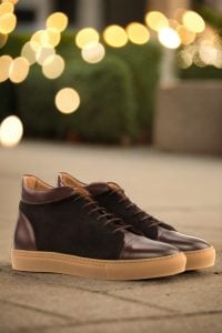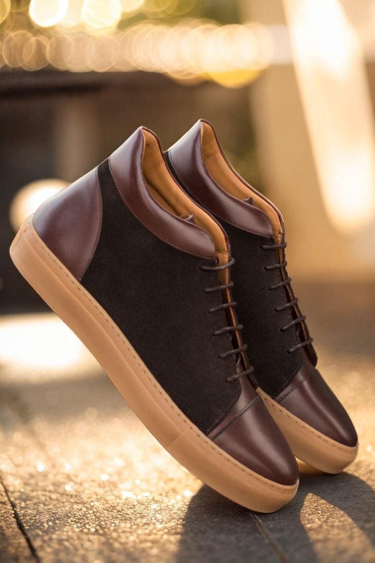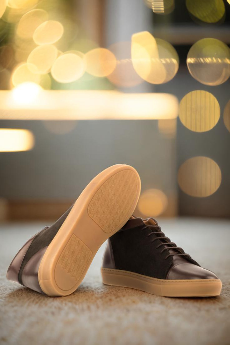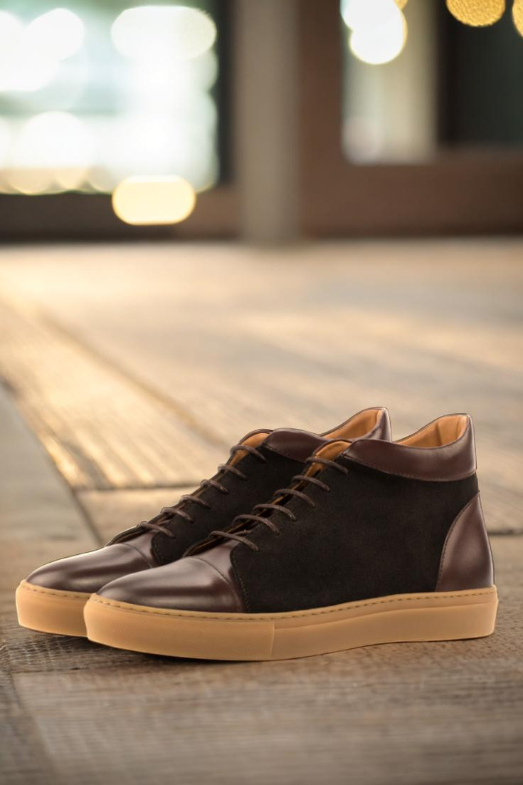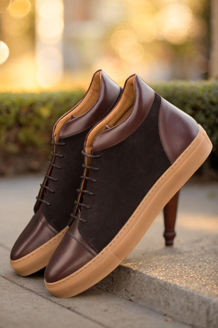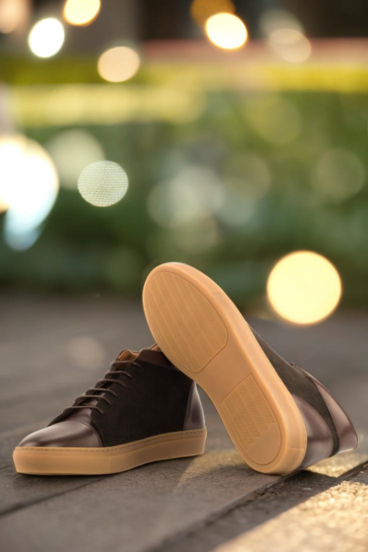 Elevate your shoe game with The Argyle St. High Top Sneaker No. 4010 from Robert August. Handcrafted in Spain, these sneakers are the epitome of luxury and style. The uppers are made of dark brown luxe suede with a gorgeous painted calf detail in the same color for a cohesive look. The laces match in a rich brown tone, adding a touch of elegance to the overall design.