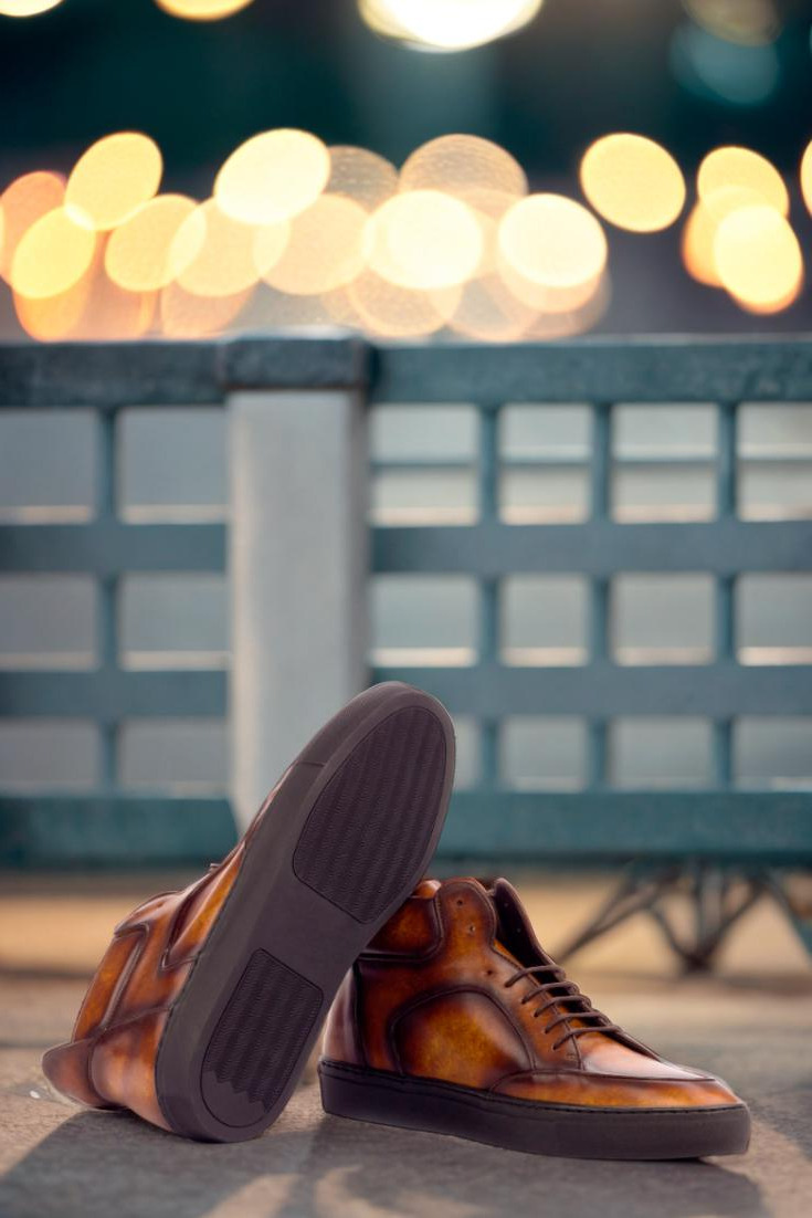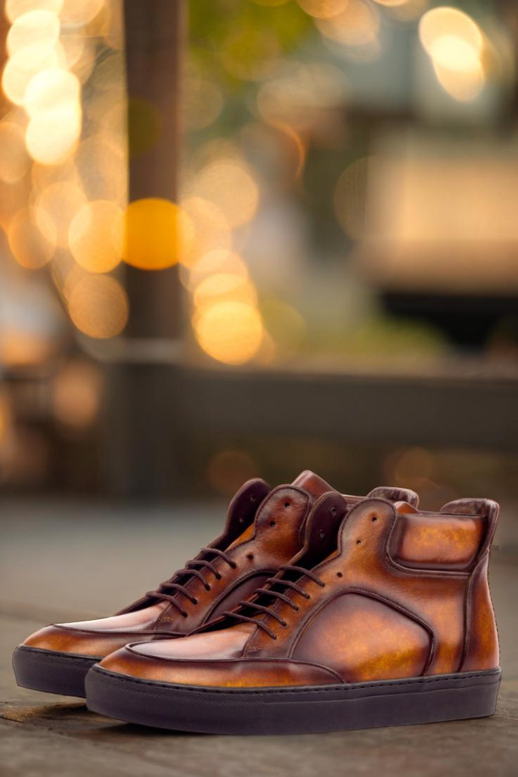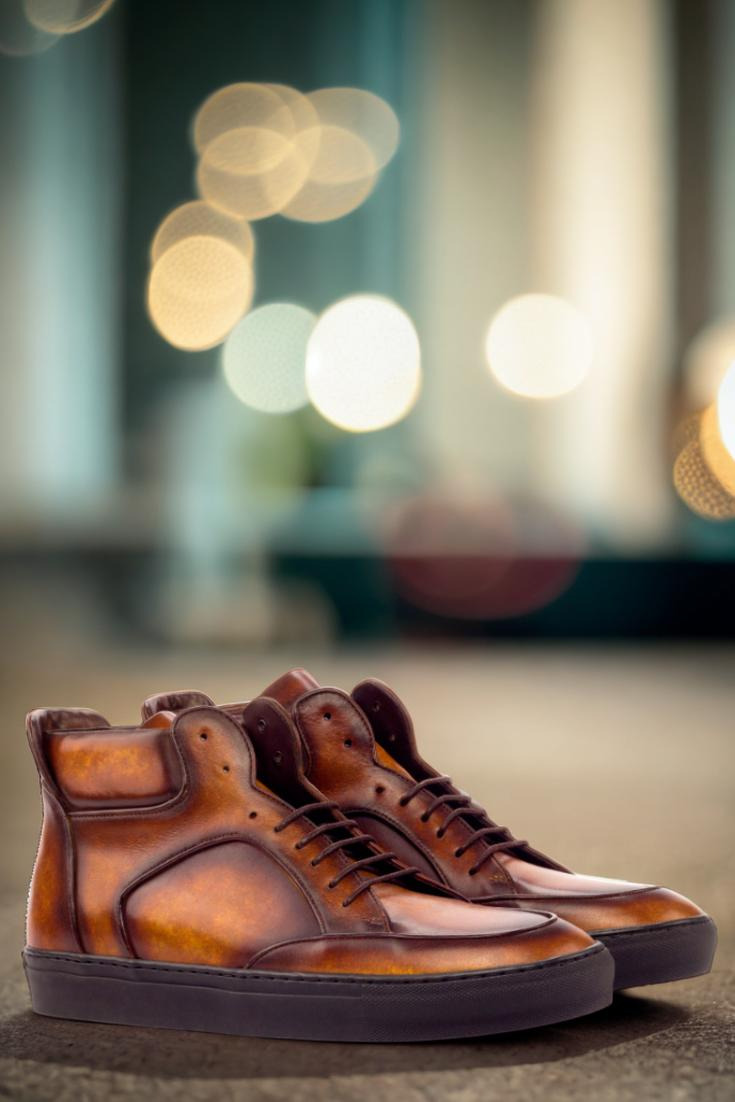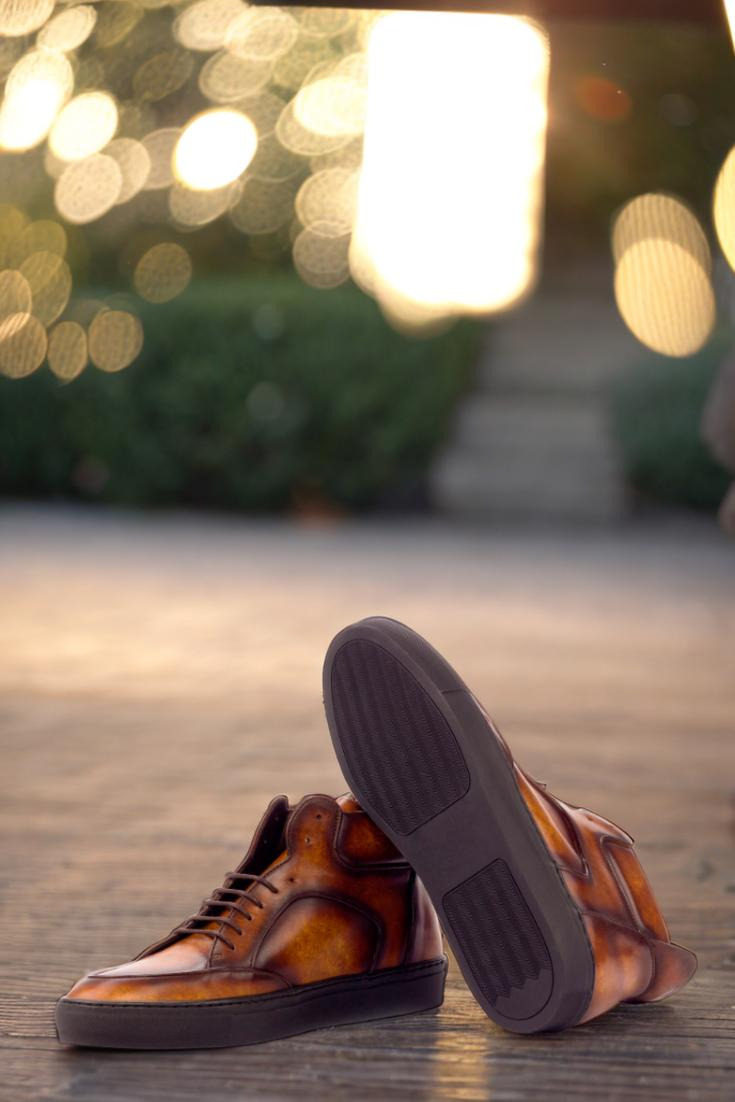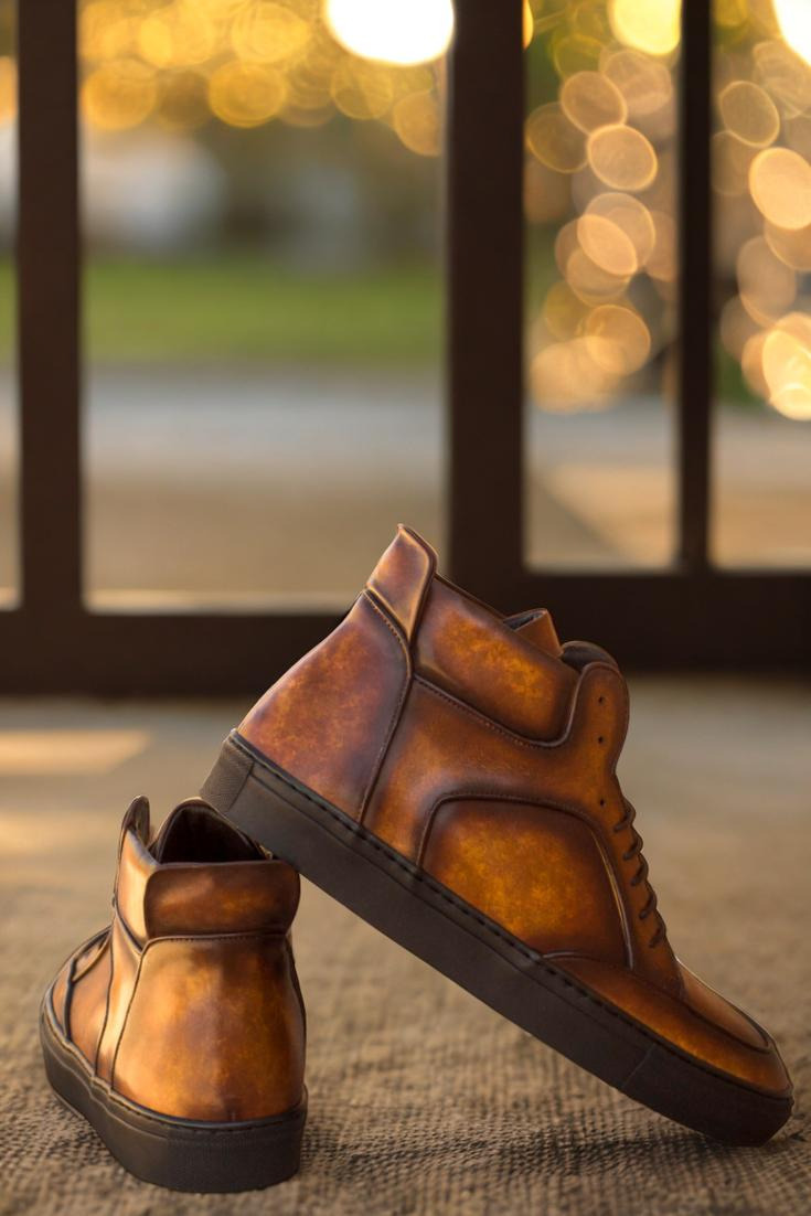 The Wells St. High Top Sneaker No. 3387 is a timeless and elegant choice for fashion-forward individuals. Crafted with an upper of cognac-marbled hand patina leather, these sneakers feature a light patina finish that gives them a truly unique look. Combined with brown laces and a brown calf leather lining, these high tops will imbue any outfit with a classic, yet modern vibe. And for the perfect finishing touch, these sneakers are fitted with a black rubber cupsole. Whether you keep them as-is or customize them to reflect your individual style, the Wells St. High Top Sneaker No. 3387 is a must-have for any modern man’s wardrobe. So don’t miss out on this timeless and exquisite style, designed by the fashion masters at Robert August.