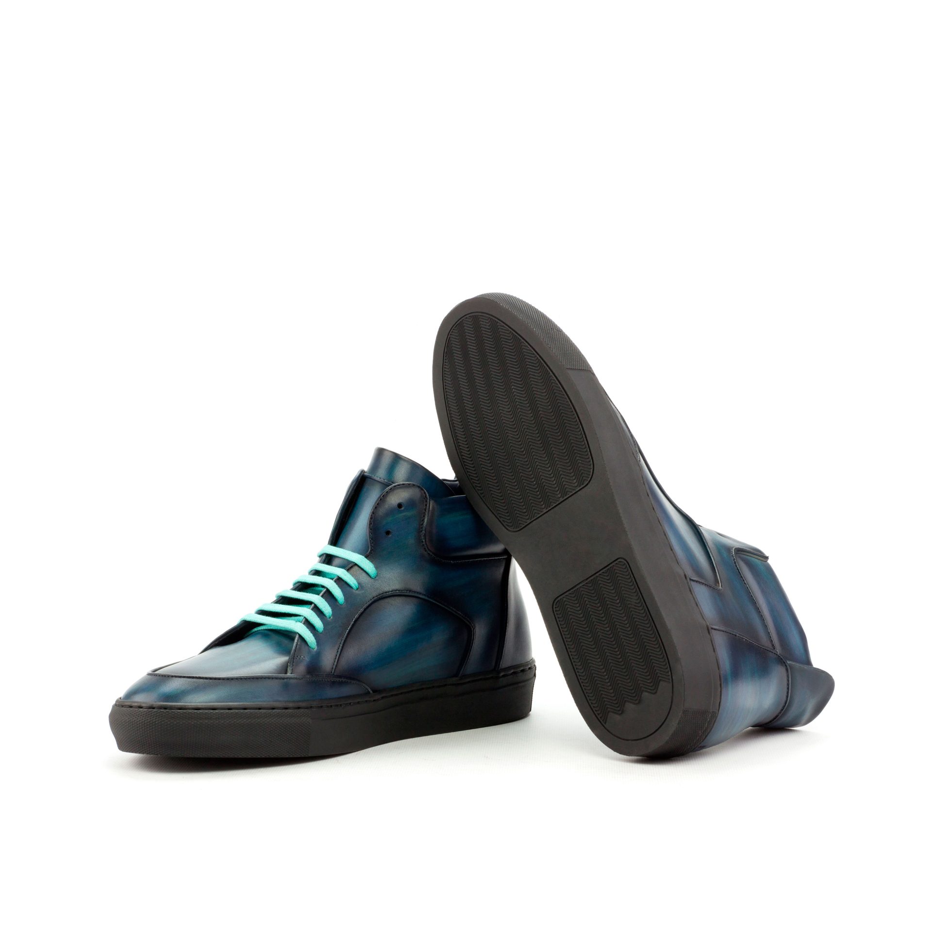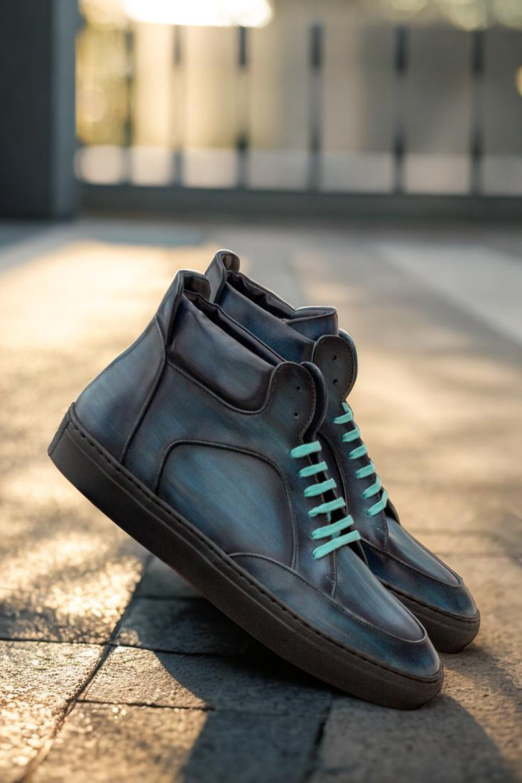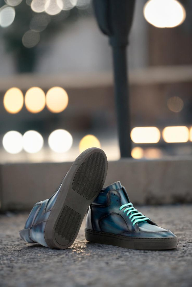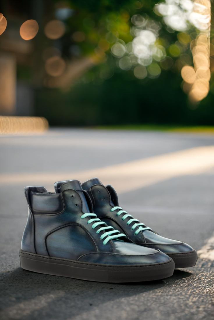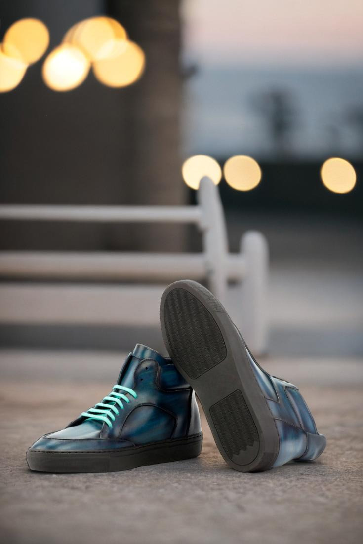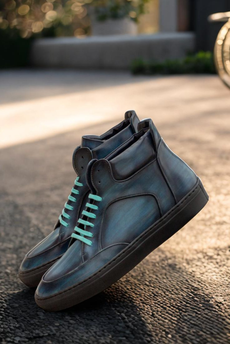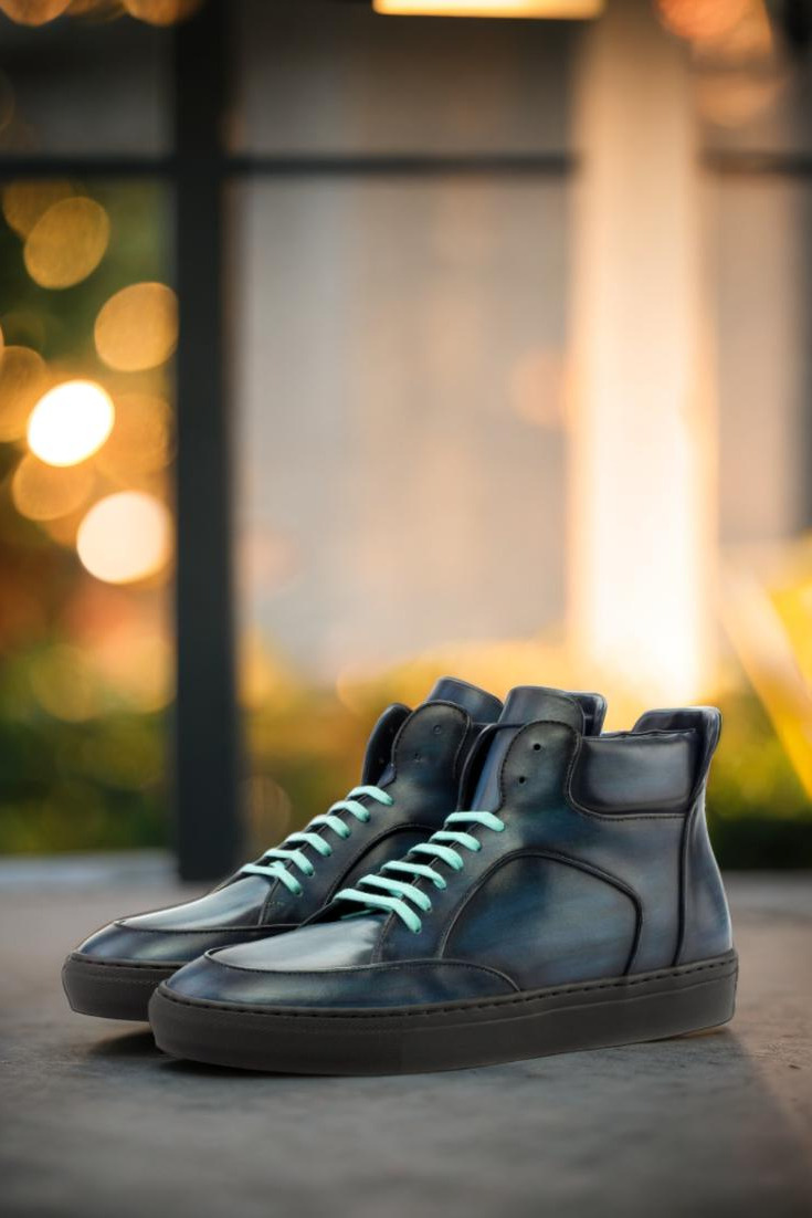 The soft denim blue-original hand patina leather uppers give this sneaker a vintage-inspired yet modern look. The denim blue pairs perfectly with the turquoise laces and the navy blue calf leather lining. The rubber cup sole creates durability from the inside out, and is thicker at the sides for superior traction and noise reduction. Staying true to the classic high top style, with its perfect fit and standout look—this sneaker is an absolute must-have.
