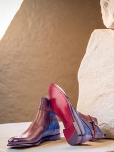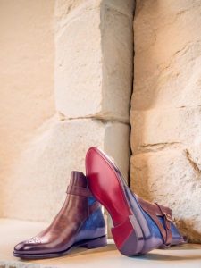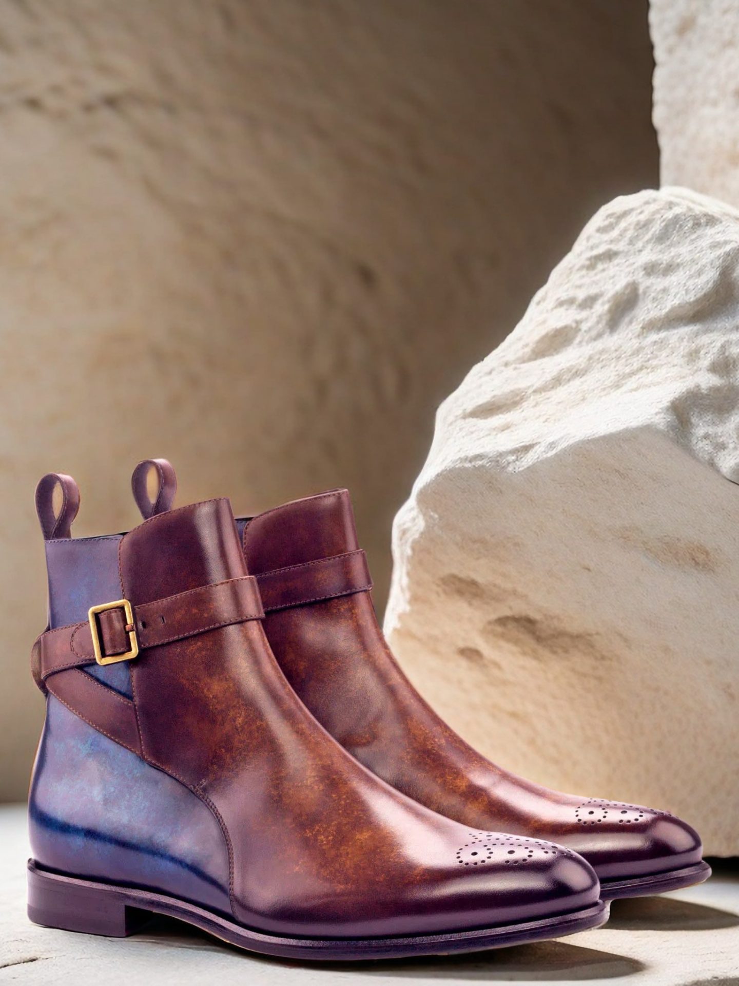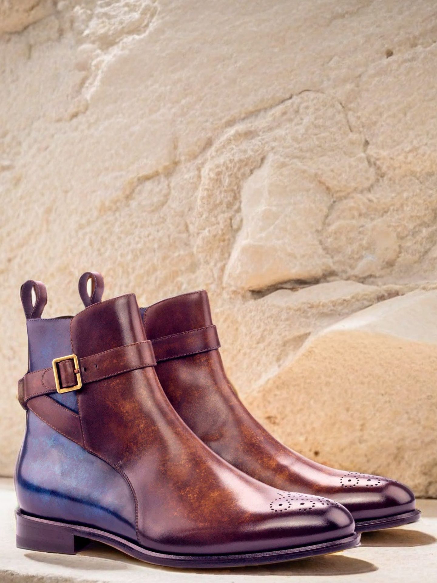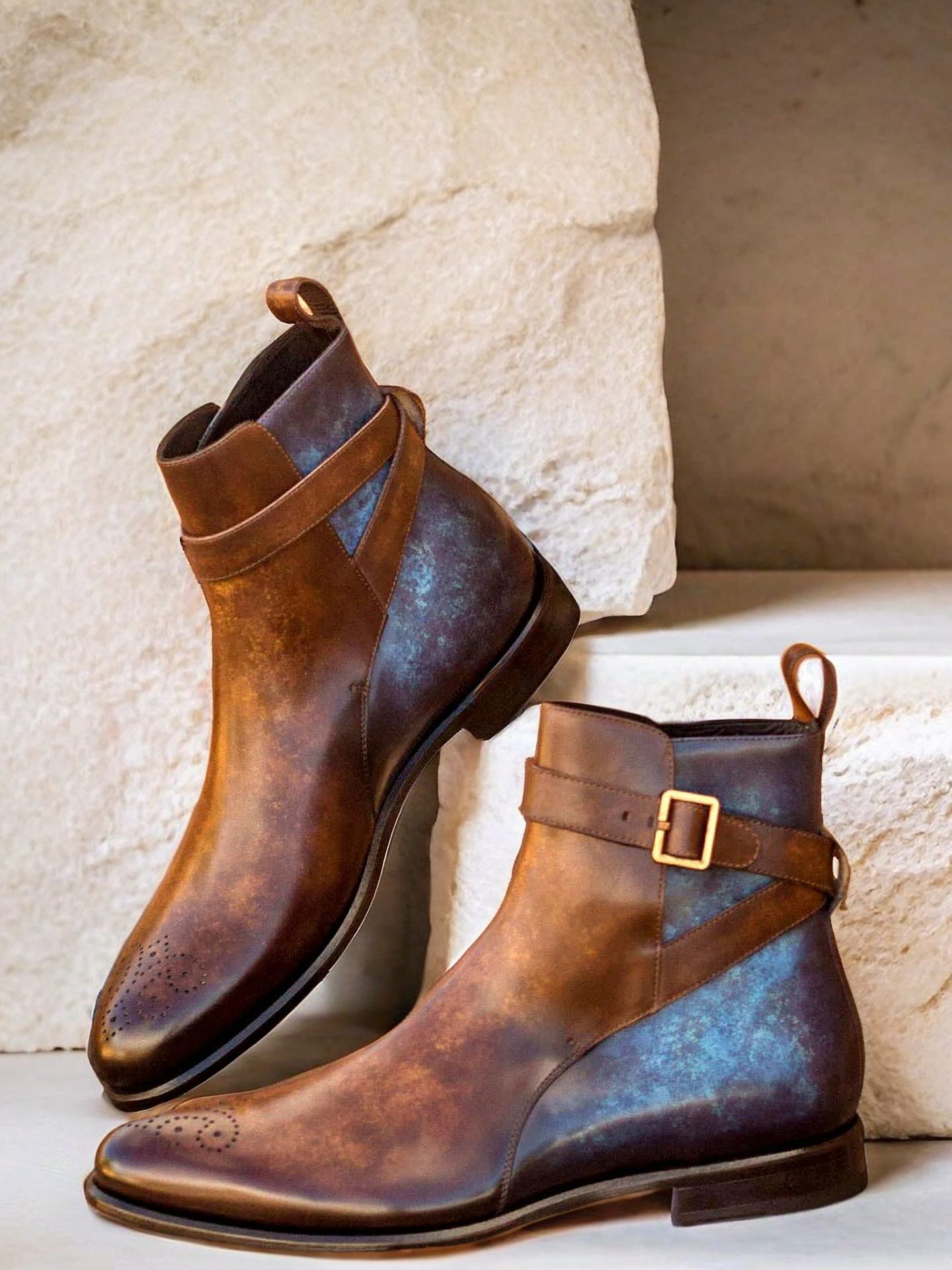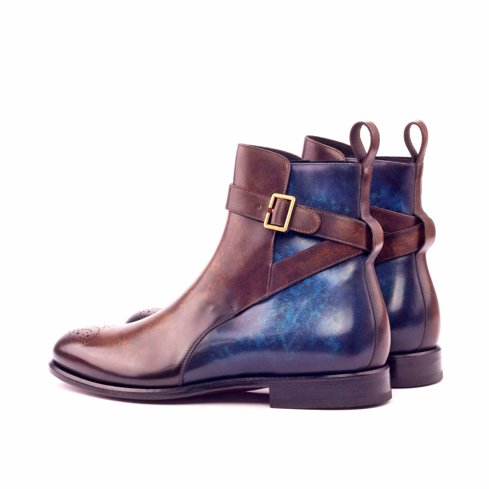 Made with the finest Italian Calf Leather, the front of the boot features a rich Brown Marbled Hand Patina, adding depth and character. The sides are adorned with a Denim Blue Marbled Hand Patina, a unique touch that sets this boot apart from the rest. The strap and back strap also showcase the same exquisite Brown Marbled Hand Patina, creating a cohesive and sophisticated look.