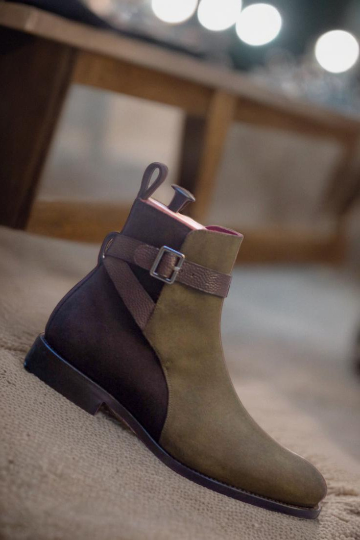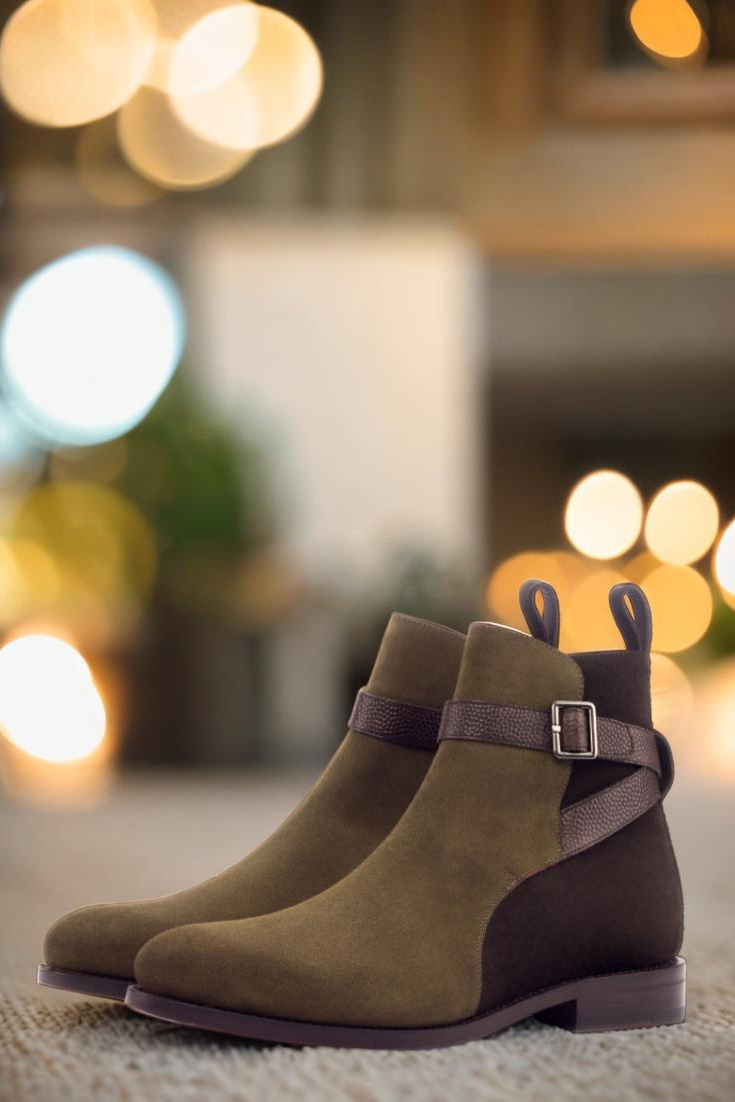 The uppers of this boot are made of a luxurious combination of Dark Brown and Khaki Luxe Suede, complemented by a sophisticated Dark Brown Pebble Grain buckle. The stunning design is accentuated by a sleek and bold Graphite buckle, adding a touch of modernity to the classic Jodhpur style.