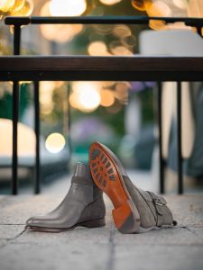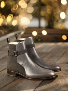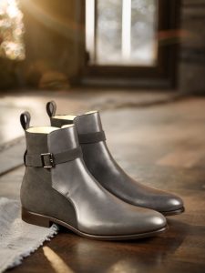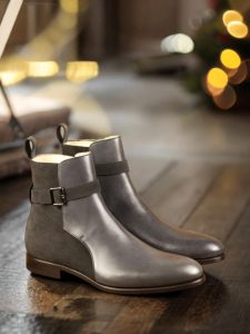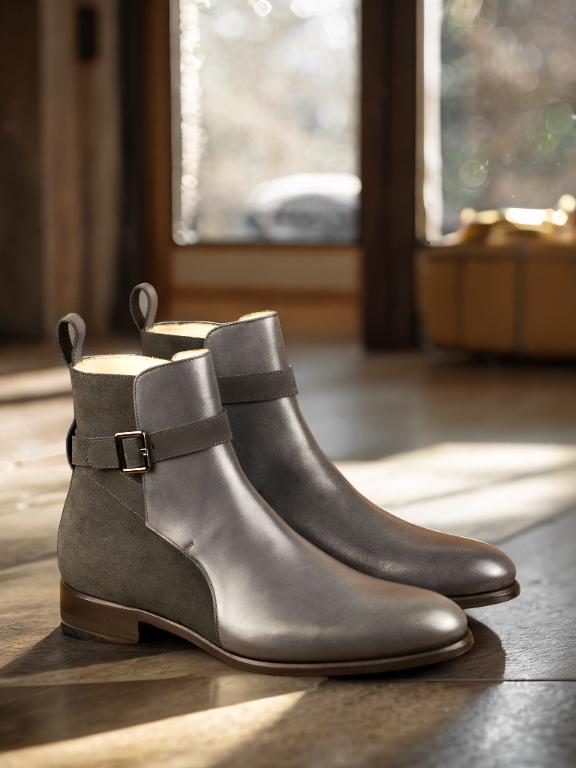 Introducing the Rush St. Jodhpur Boot No. 4599 from Robert August. This boot is all about the perfect combination of style and functionality, designed with the modern man in mind. Crafted with precision and care in Spain, this boot features a sleek and alluring combination of grey painted calf leather on the front, luxe grey suede on the sides and strap, and a striking graphite buckle. The back strap adds an elegant touch with its grey painted calf leather.