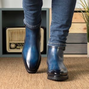 Luxury boots from Rush St, the Jodhpur Boot no. 5581 is a master of craftsmanship and elegance! Featuring a denim blue original hand patina leather upper with a dark patina intensity for an edgy and rugged appearance, and graphite buckle for an extra modern touch. The lining is covered in soft brown calf leather for an extra boost of comfort and style. The Ultralight rubber commando sole is perfect for surviving any terrain, while still delivering an effortless, stylish look! These stylish boots are perfect for any man looking to make a statement, and will keep your feet comfortable and supported no matter where your mode of adventure takes you. Don’t wait, get Rush St. Jodhpur Boot No. 5581 and experience the ultimate blend of fashion and function!