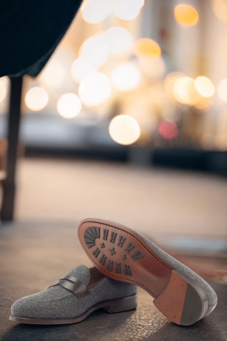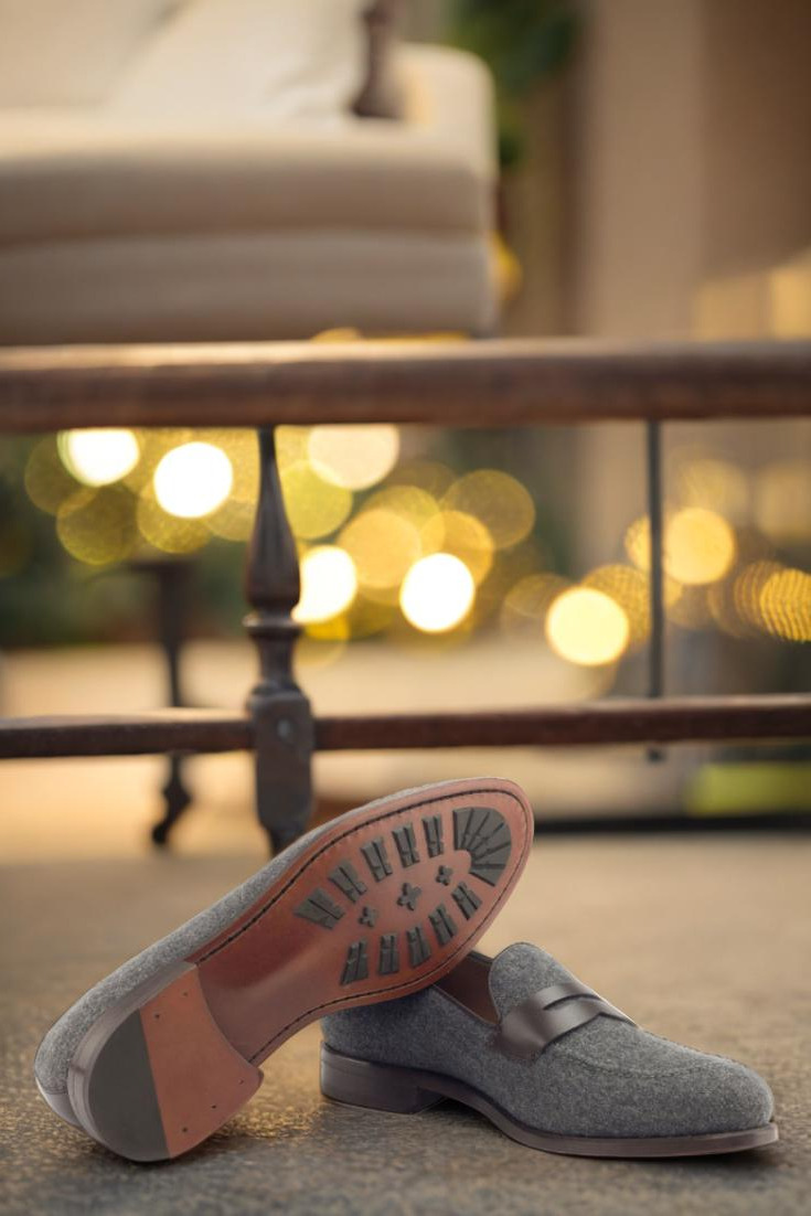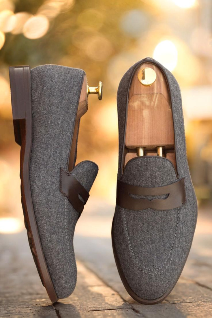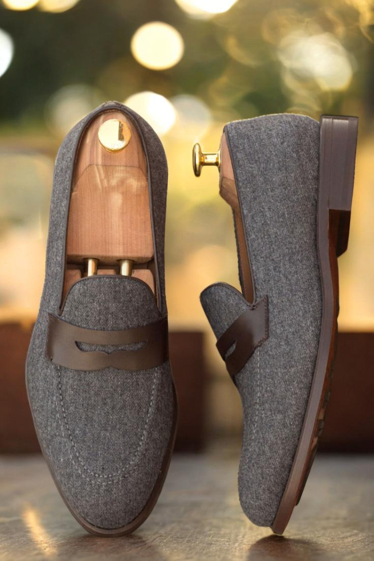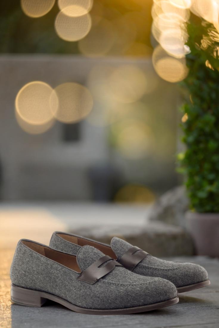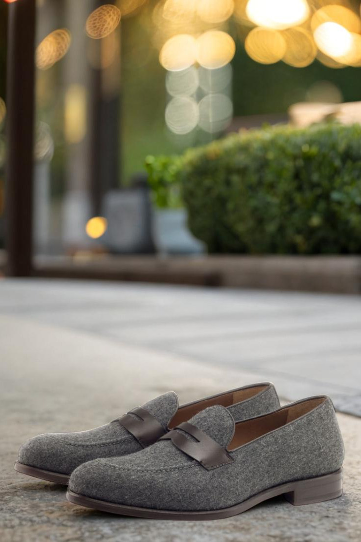 Step into style and sophistication with The Grand Ave. Loafer No. 2891 from Robert August. This luxurious loafer is the epitome of elegance, combining a base of dark grey flannel with accents of rich dark brown box calf leather for a sleek and polished look. The attention to detail is evident in the piping and mask, also crafted from dark brown box calf for a seamless finish.