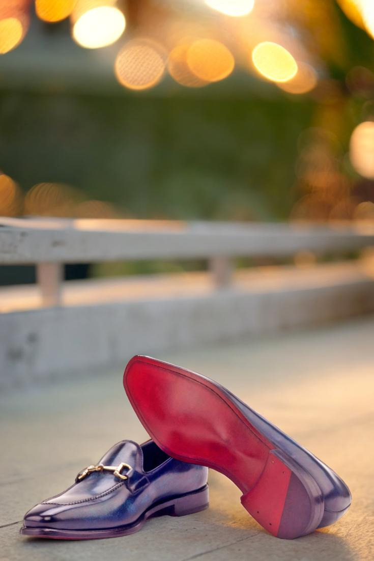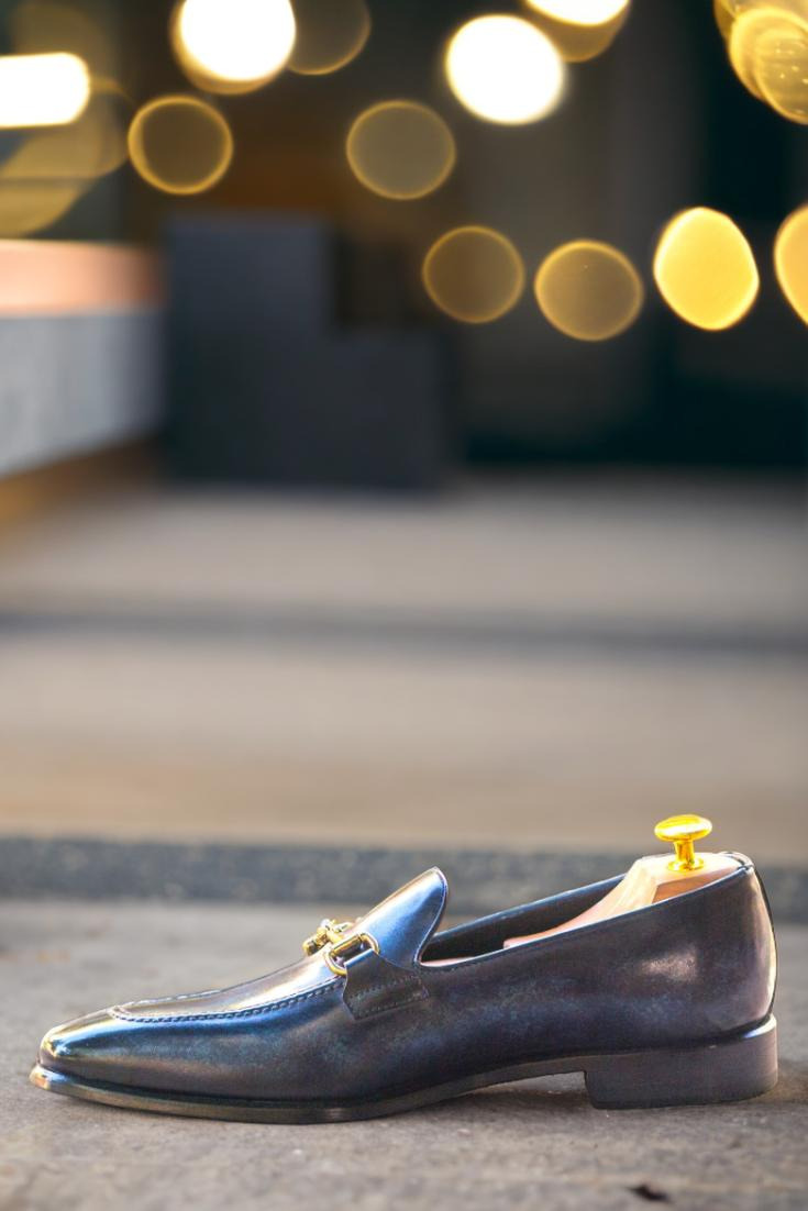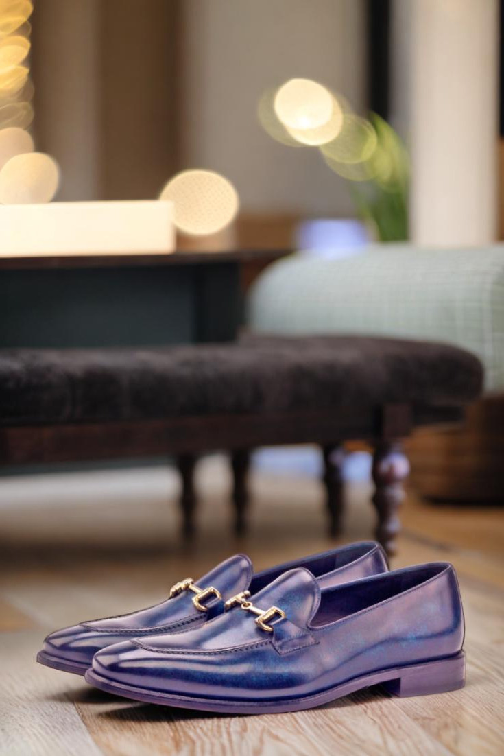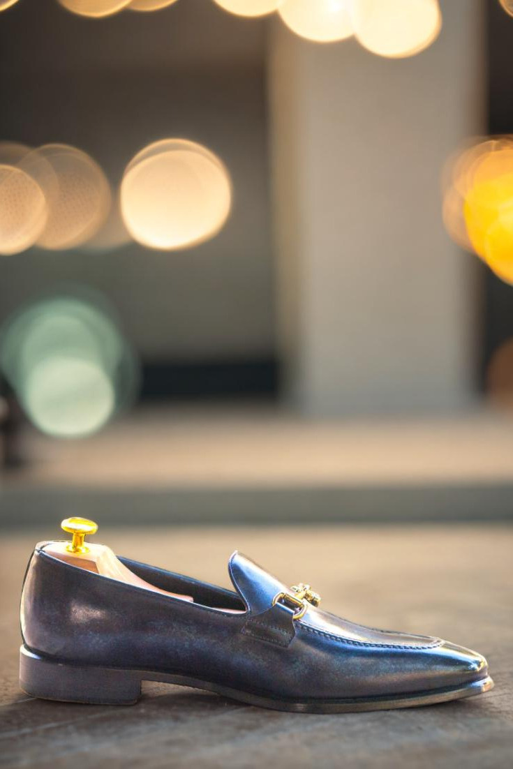 Step into sophistication and style with The Grand Ave. Loafer No. 2967 from Robert August. Crafted with the finest Italian Calf Leather, each pair is hand-painted with a stunning Denim Blue Marbled Patina for a unique and luxurious look. The attention to detail is evident in the careful piping, accent grip, and gold bit embellishment that add a touch of elegance to this statement shoe.