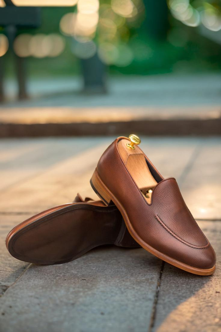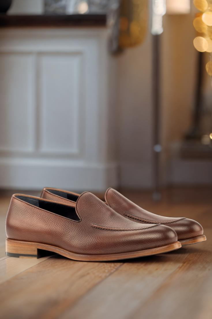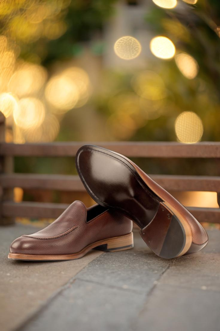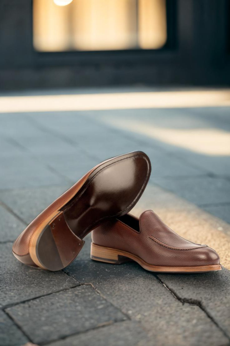 The base of the shoe is made with a rich medium brown pebble grain leather, giving it a classic and timeless look. The back is adorned with dark brown painted calf leather, adding depth and texture to the design. The piping, made from medium brown box calf, provides a subtle contrast and elevates the overall aesthetic.