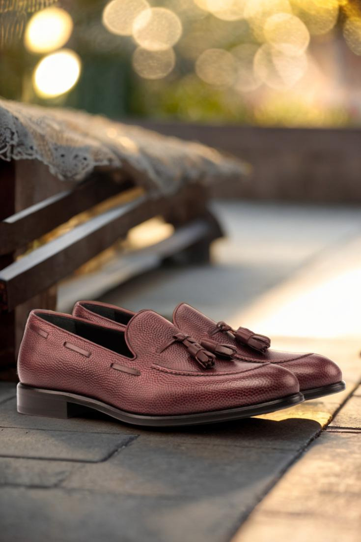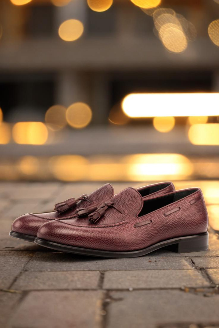 Introducing the Grand Ave. Loafer No. 3935 from Robert August – the ultimate combination of style, quality, and versatility. Handcrafted in Spain with meticulous attention to detail, this loafer exudes elegance and sophistication. Made with high-quality burgundy pebble grain leather, both the base and back of the shoe exude a timeless charm that will elevate any outfit.