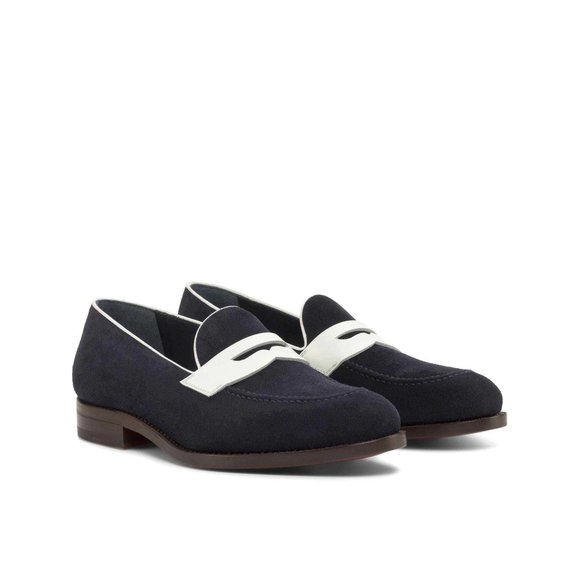 Introducing the Grand Ave. Loafer No. 4939 from the renowned brand Robert August. This luxurious loafer exudes a sense of timeless style and sophistication with its navy blue luxe suede uppers and crisp white box calf accents. The meticulous craftsmanship and attention to detail are evident in every aspect of this shoe, from the white box calf back and mask to the carefully hand-painted red leather sole. The navy blue calf leather lining adds a touch of elegance and ensures ultimate comfort for all-day wear. Take each step with confidence and make a bold statement with the contrasting brown outsole that adds a unique touch to this classic loafer.