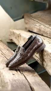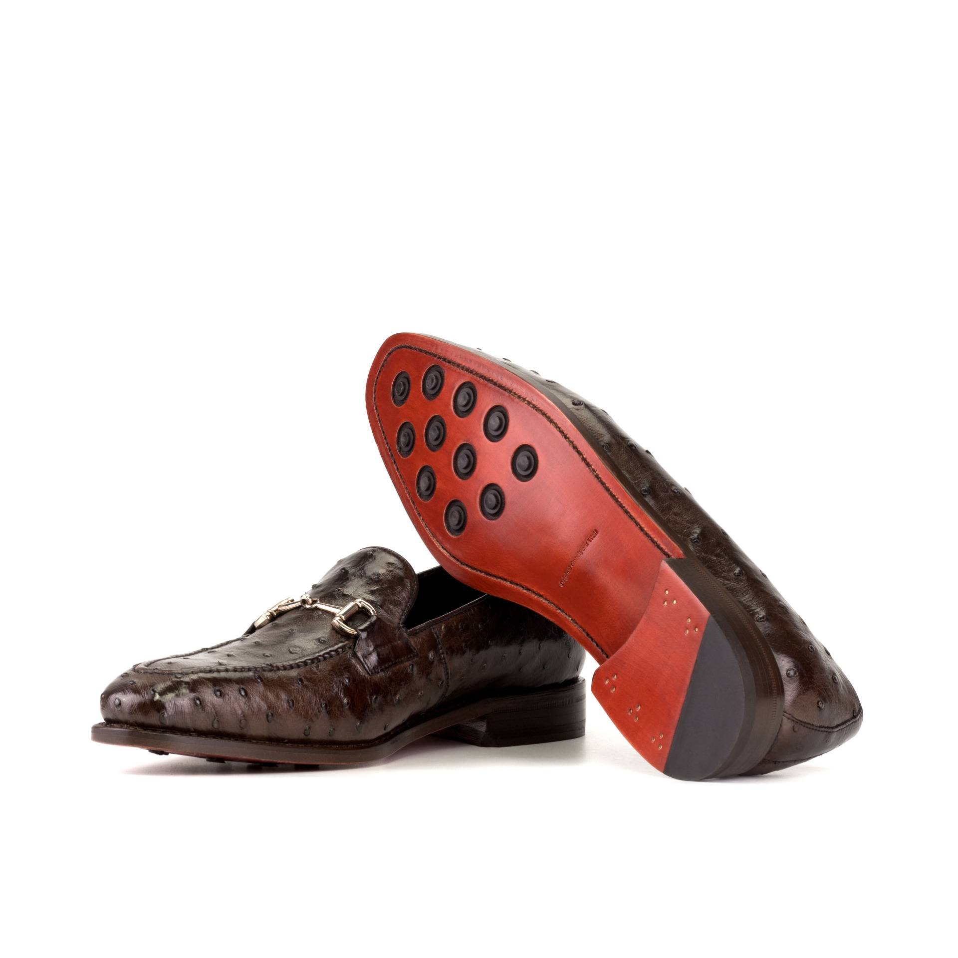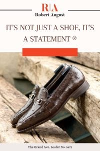 Experience elevated elegance with The Grand Ave. Loafer No. 5671 from Robert August. With a luxurious dark brown genuine ostrich base and back, this one-of-a-kind loafer radiates opulence and attention to detail. Dark brown box calf piping, nickel bit, and dark brown genuine ostrich grips create a striking combination of classic luxury materials that will last for years to come. The interior features luxurious lining of brown calf leather and the outsole showcases hand painted red leather with rubber buttons. Resting on The 872 Last featuring a sleek aesthetic with a slight chisel toe, your feet will look and feel amazing all day long thanks to the Goodyear Welt construction. Order this pair as is or customize them to express your individual style! Embrace sophistication with The Grand Ave. Loafer No. 5671 from Robert August for an unmatched level of fashion quality and class.