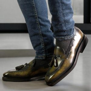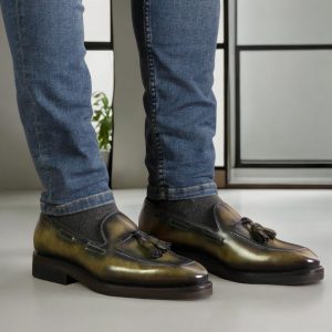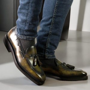 Italian calf leather forms both the upper and tassels, treated with a distinctive green museum hand patina that develops character over time. Each pair showcases unique color variations, ensuring no two loafers are identical. The brown calf leather lining provides all-day comfort against your feet while maintaining breathability during extended wear.