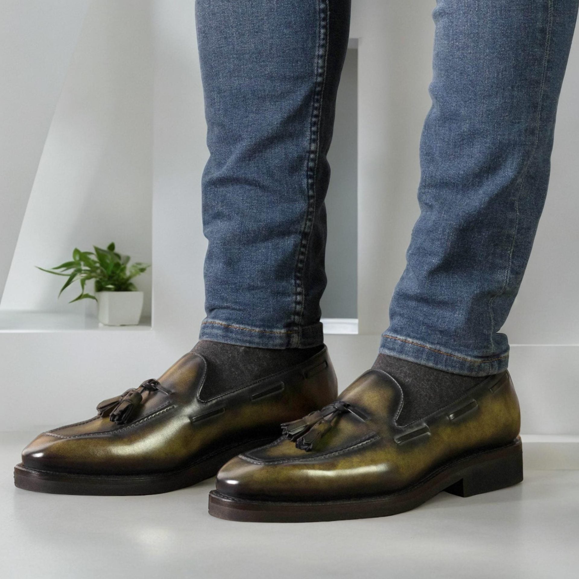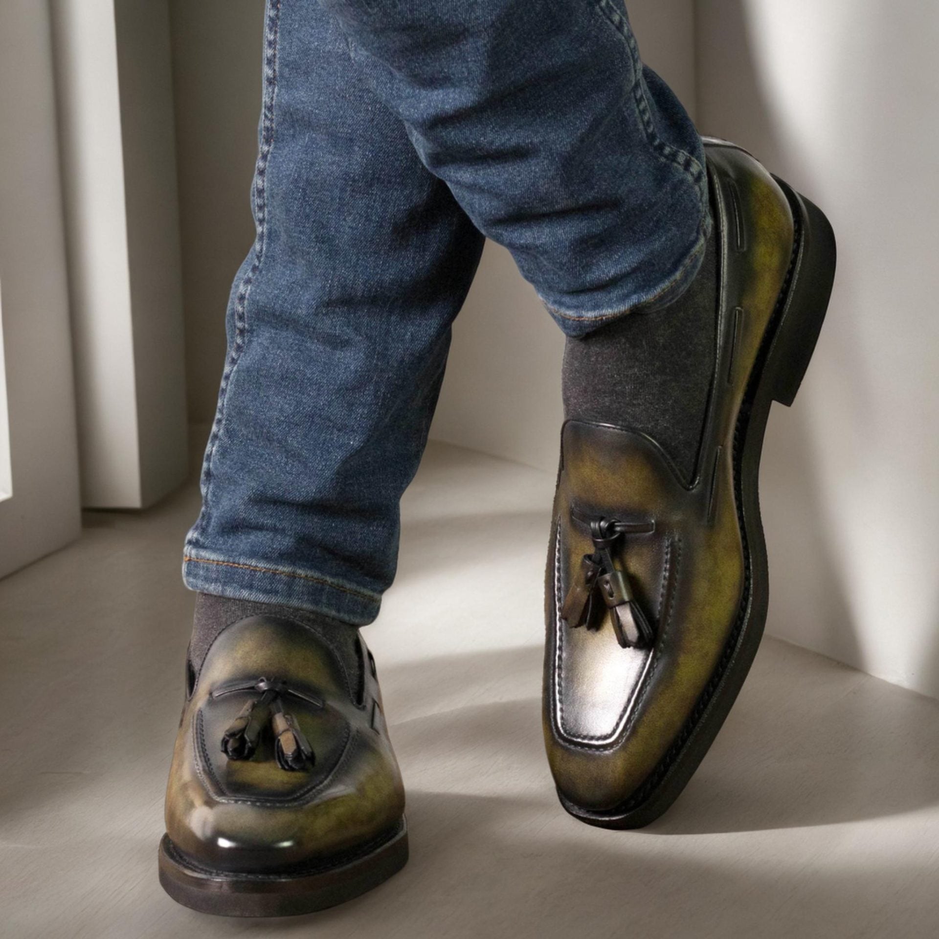 Italian calf leather forms both the upper and tassels, treated with a distinctive green museum hand patina that develops character over time. Each pair showcases unique color variations, ensuring no two loafers are identical. The brown calf leather lining provides all-day comfort against your feet while maintaining breathability during extended wear.