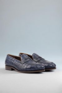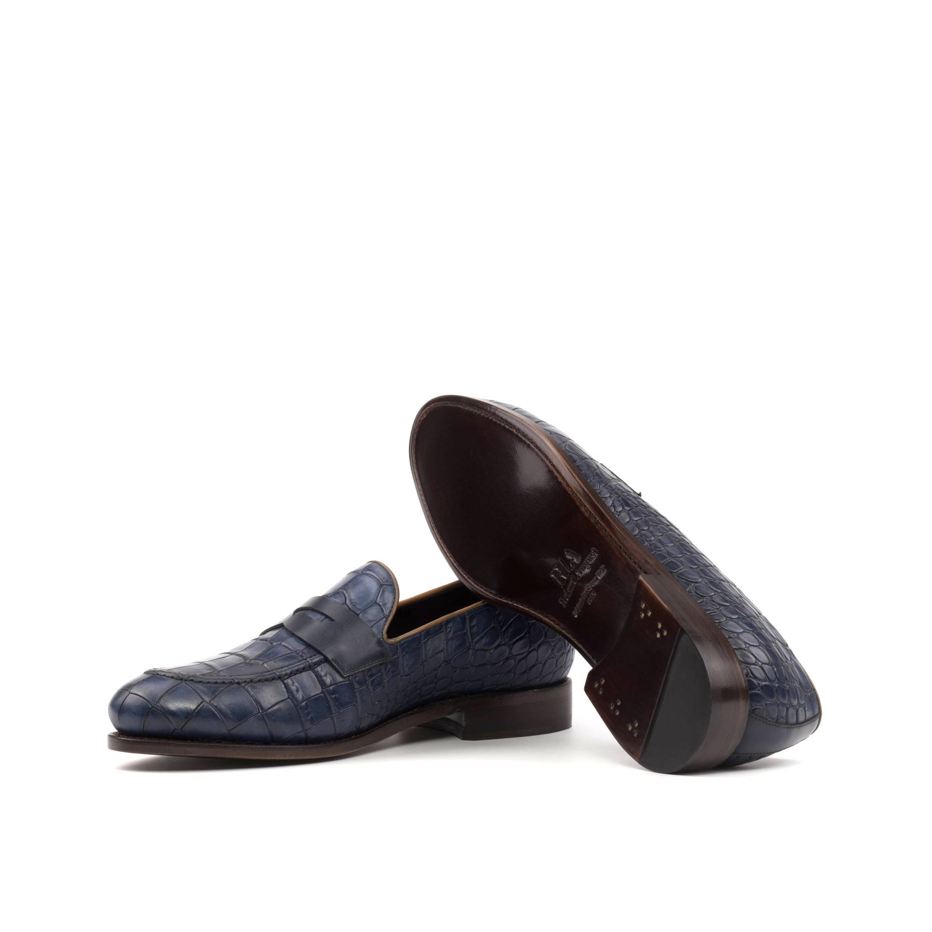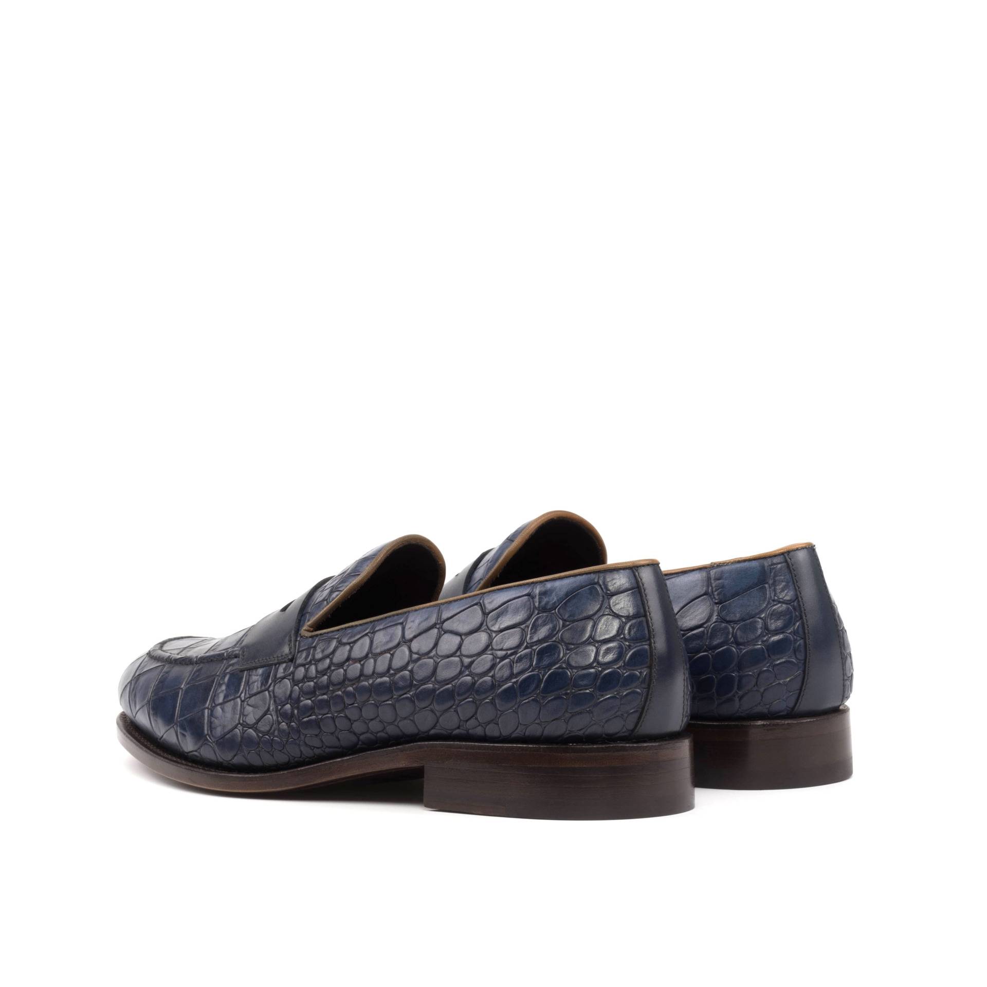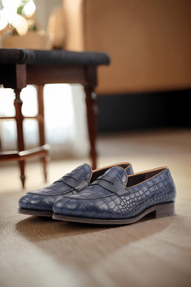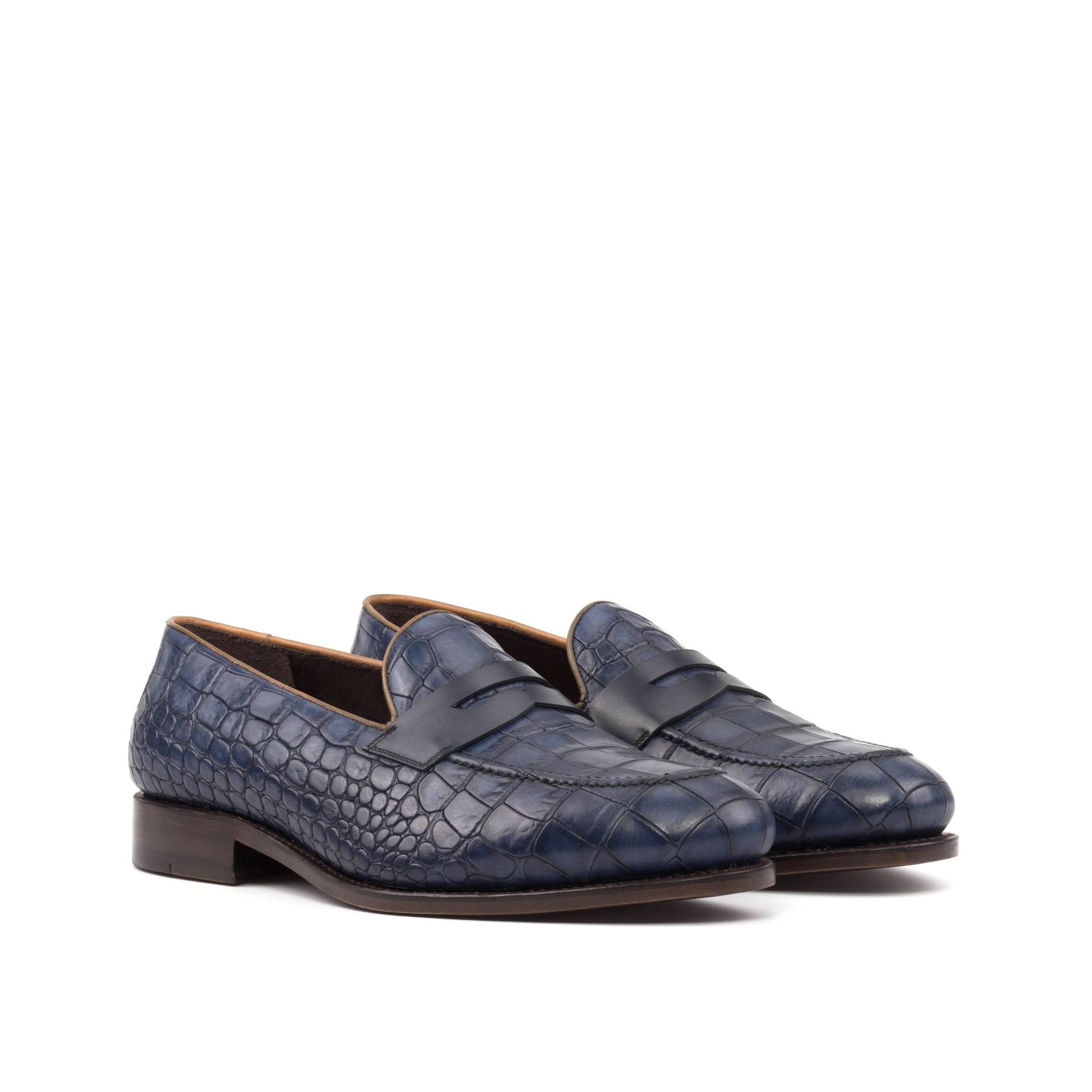 The rich Navy Blue Croco Embossed Calf base is complemented by the sleek Navy Blue Box Calf back, while the Cognac Painted Calf piping adds a touch of contrast and elegance. The Navy Blue Box Calf mask is the perfect finishing touch, exuding a sense of timeless refinement.