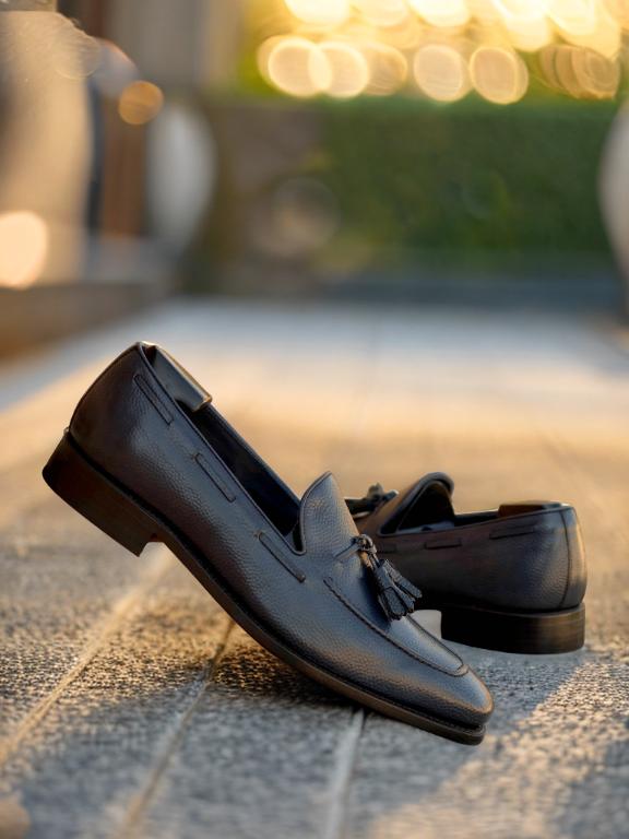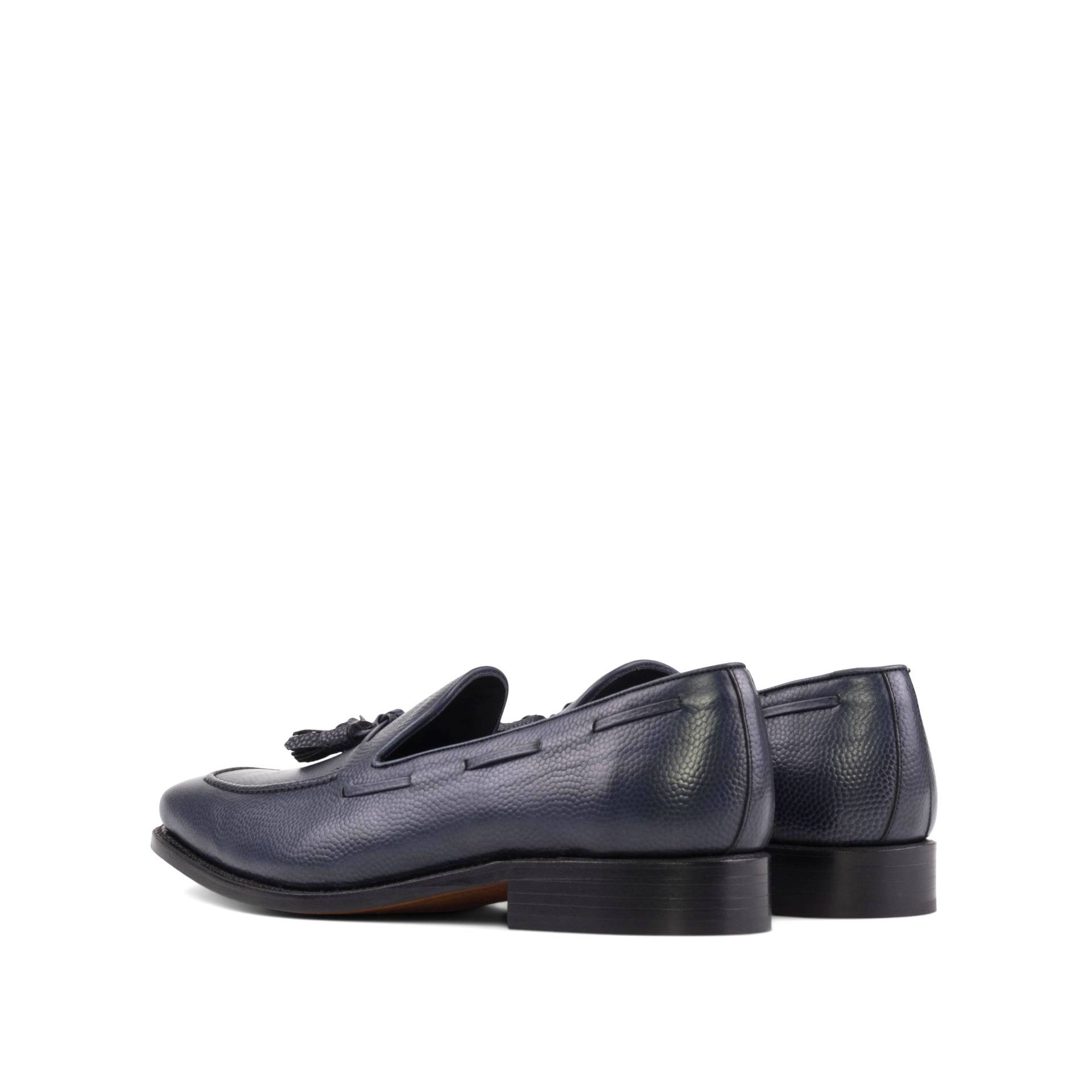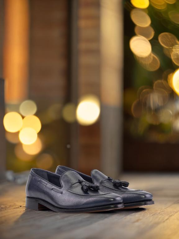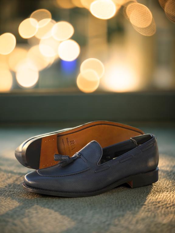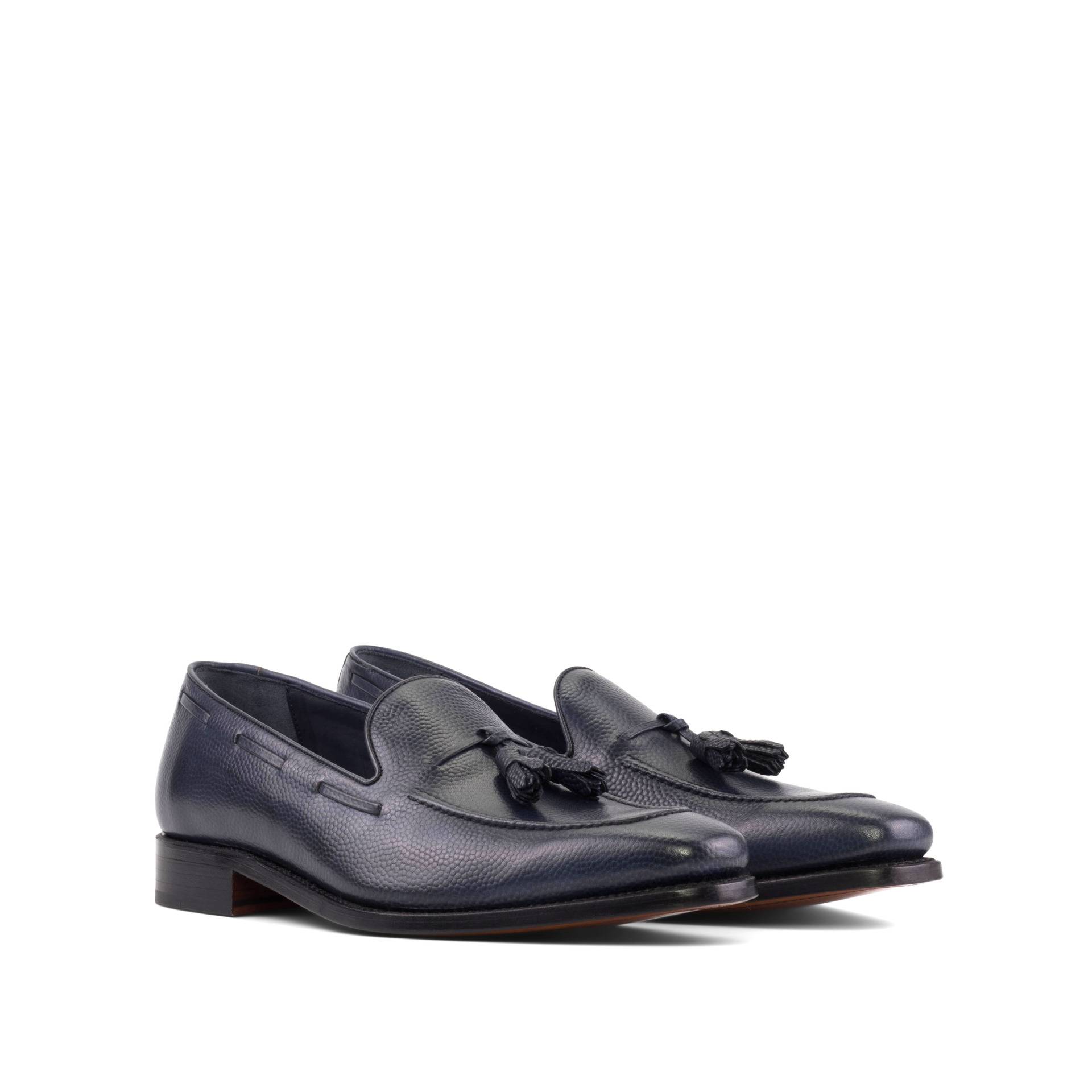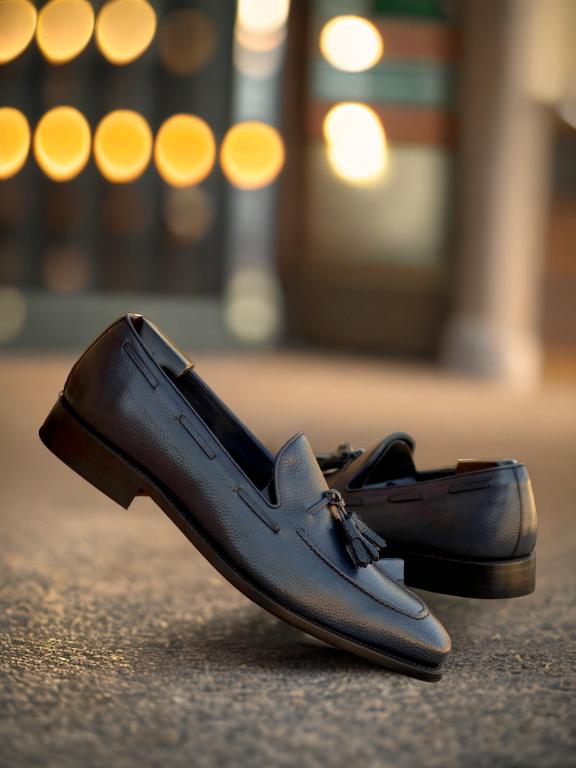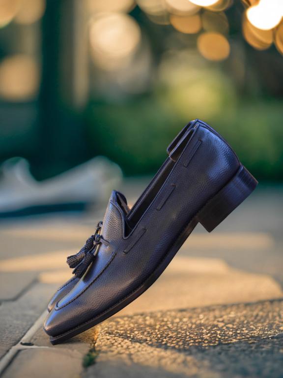 Crafted from the finest materials, this loafer boasts a strong foundation with its navy blue pebble grain leather base and back. The sleek navy blue piping adds a touch of elegance, while the tassels in matching navy blue provide a classic touch.