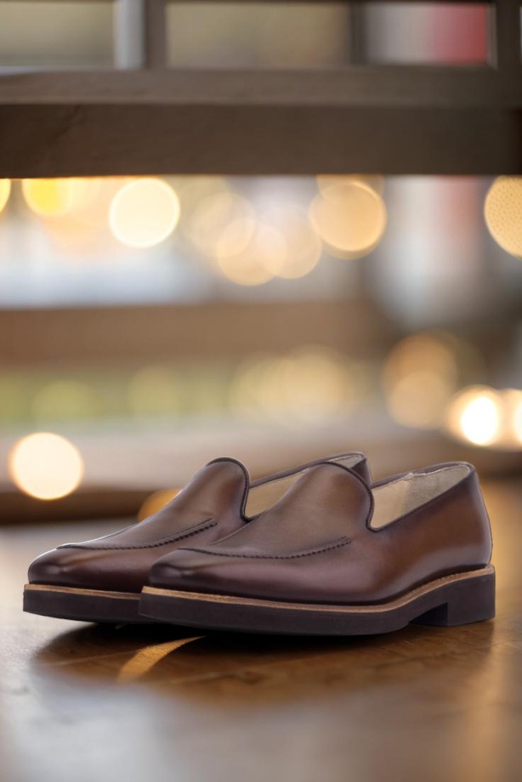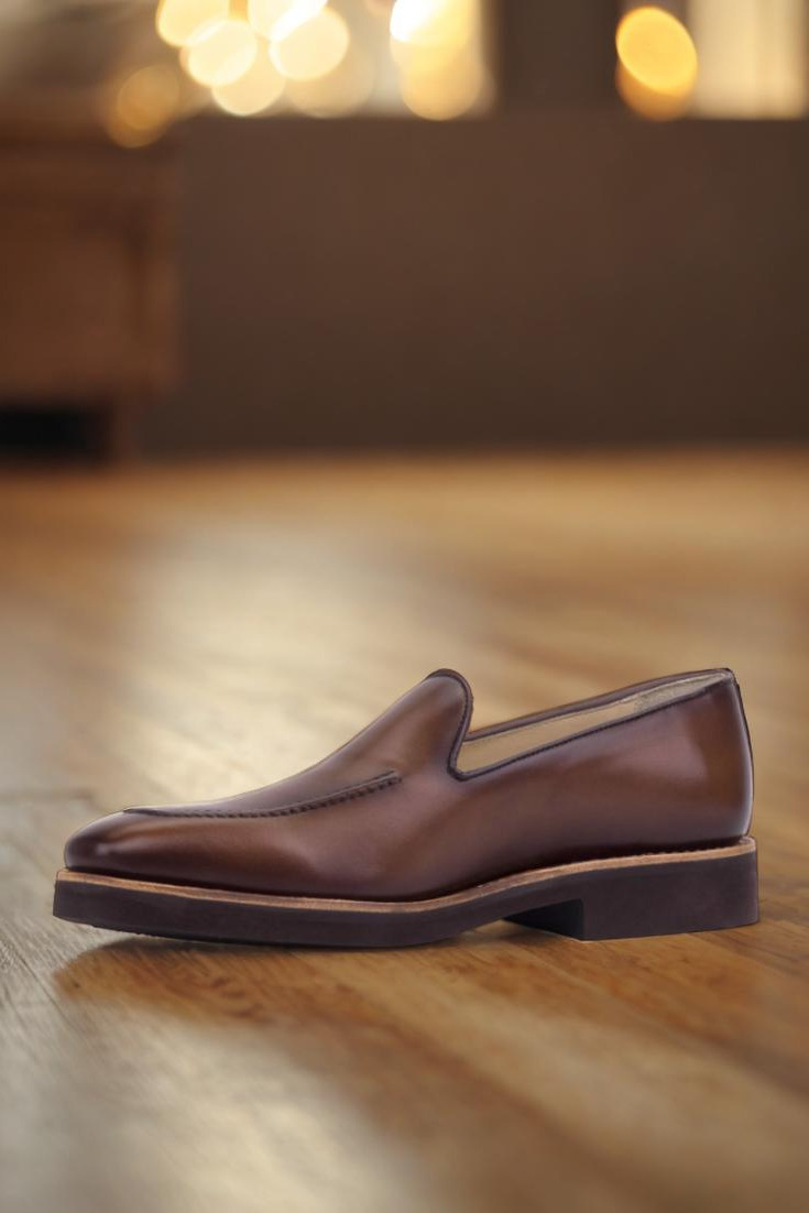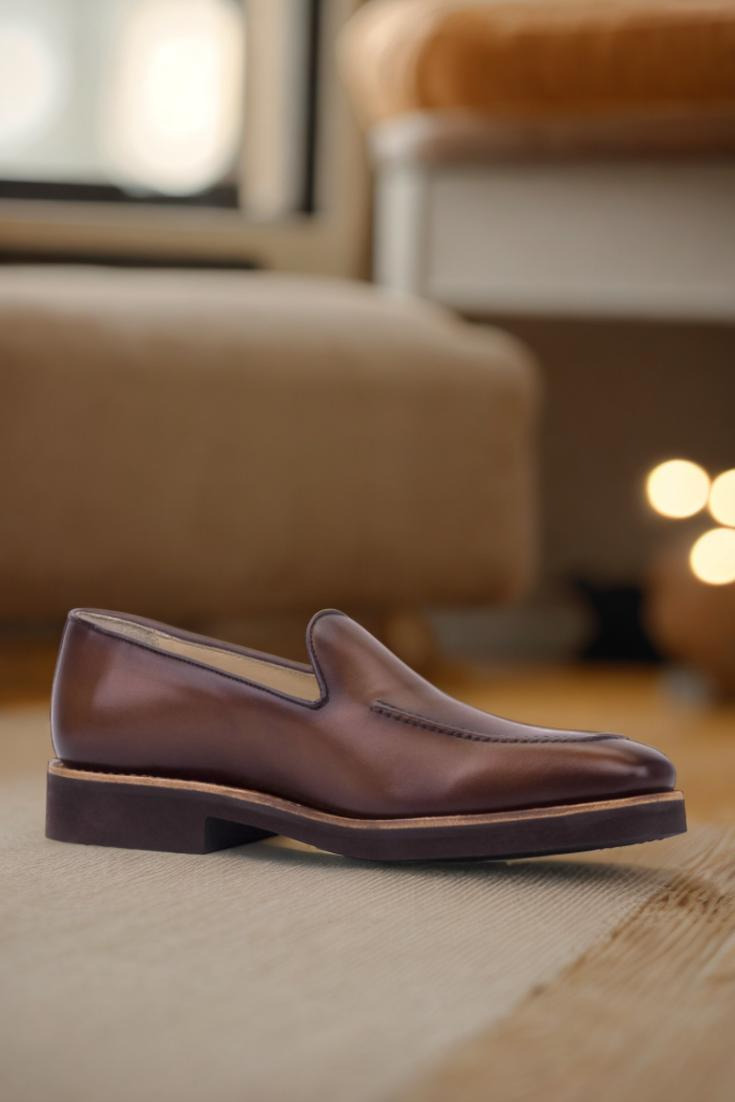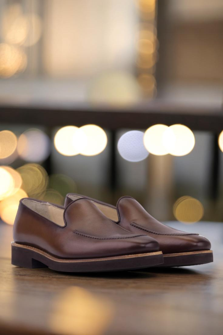 What sets this loafer apart is its stunning details. The quarter features a medium brown painted calf leather that exudes sophistication, while the burnishing adds a touch of depth and character. The piping, in a dark brown painted calf, complements the quarter beautifully and adds a touch of contrast.