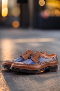 But we didn’t stop there – to elevate the design even further, we added a pop of color with the navy blue painted calf leather on the vamp and laces. Not only does this create a unique and eye-catching look, but it also adds a touch of playfulness and personality to your outfit.