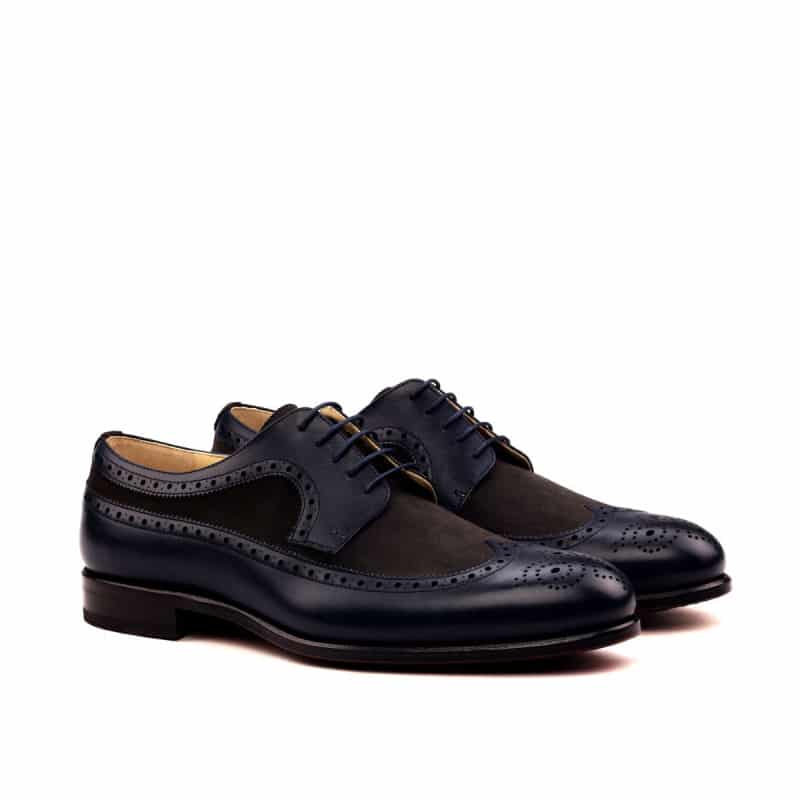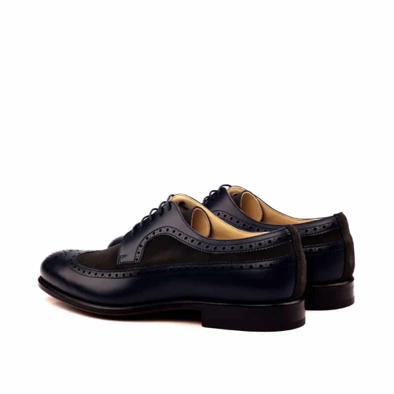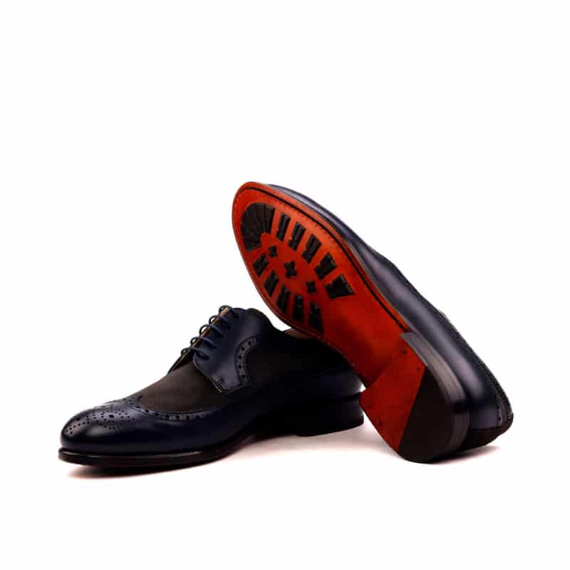 Introducing the ultimate combination of style and quality: The Elston Ave. Longwing Blucher No. 2537 from Robert August. Handcrafted in Spain, these shoes exude sophistication and showcase the finest craftsmanship. The uppers are made from luxurious navy blue box calf and soft grey luxe suede, providing a unique and sleek appearance.