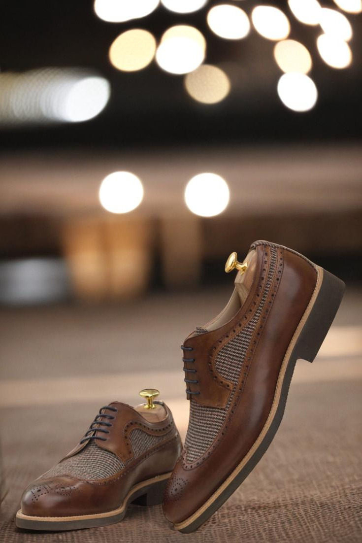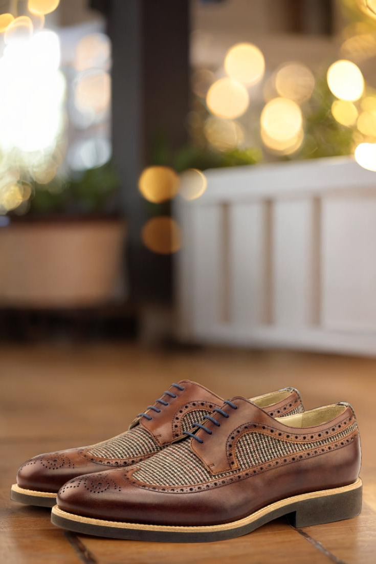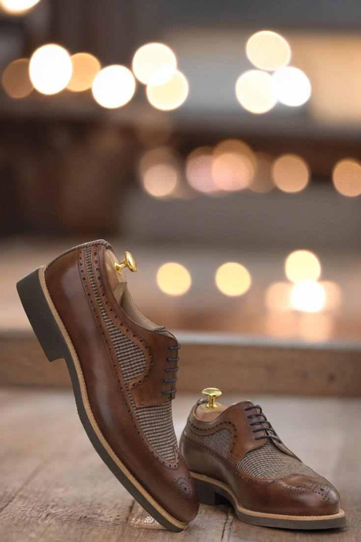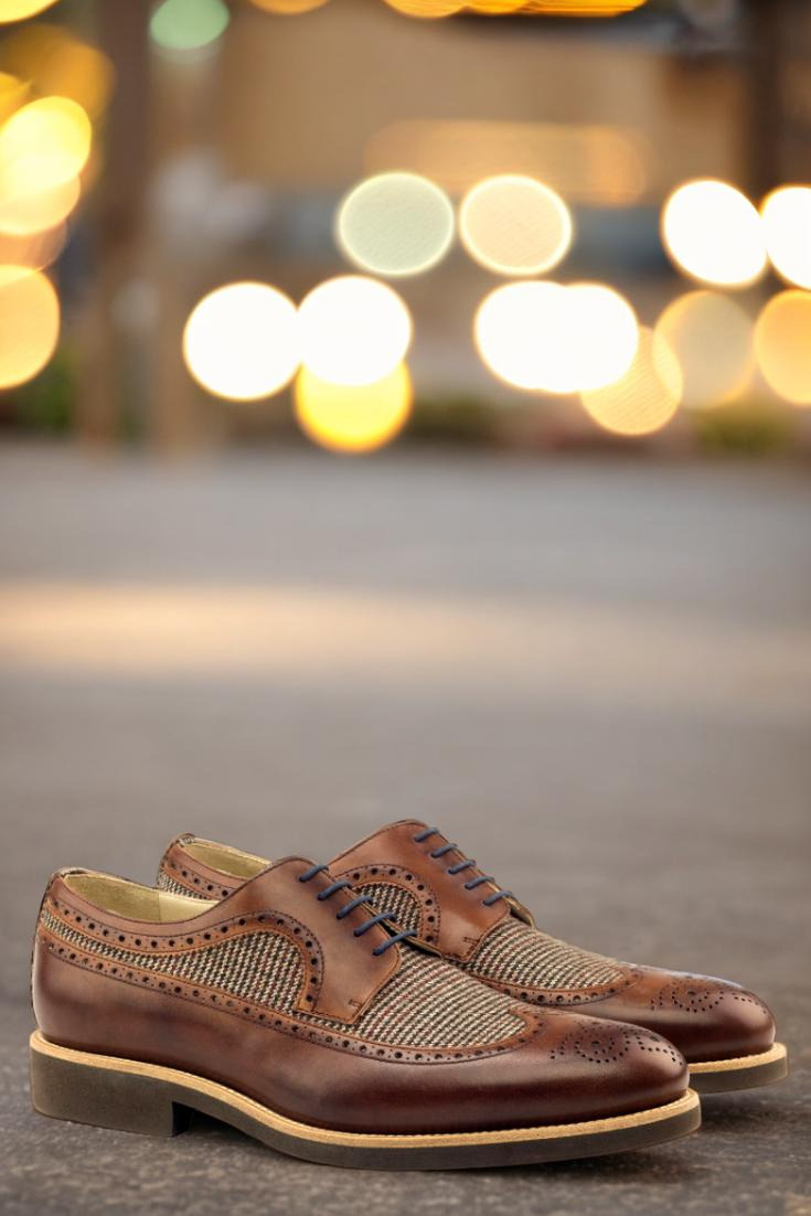 Featuring a classic Longwing tip in a medium brown painted calf, this shoe exudes sophistication and timeless elegance. The vamp is made of small tweed wool, adding a unique touch to this traditional design. The quarter and back are also crafted from medium brown painted calf, providing a cohesive and polished look.